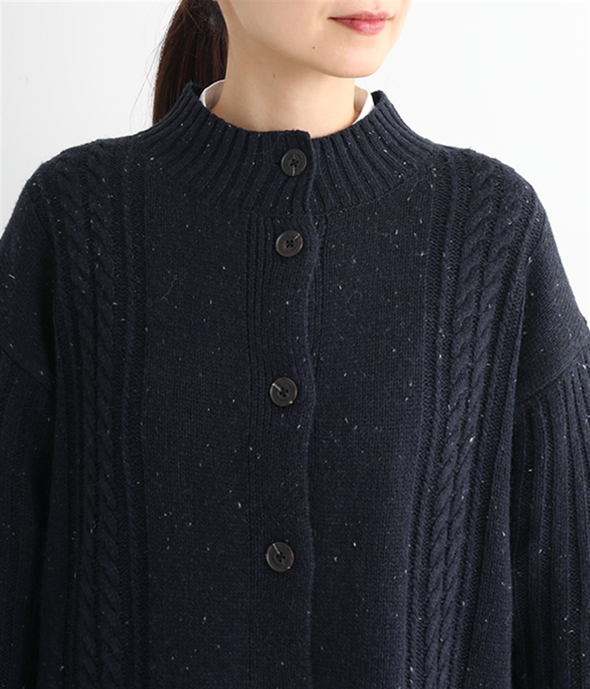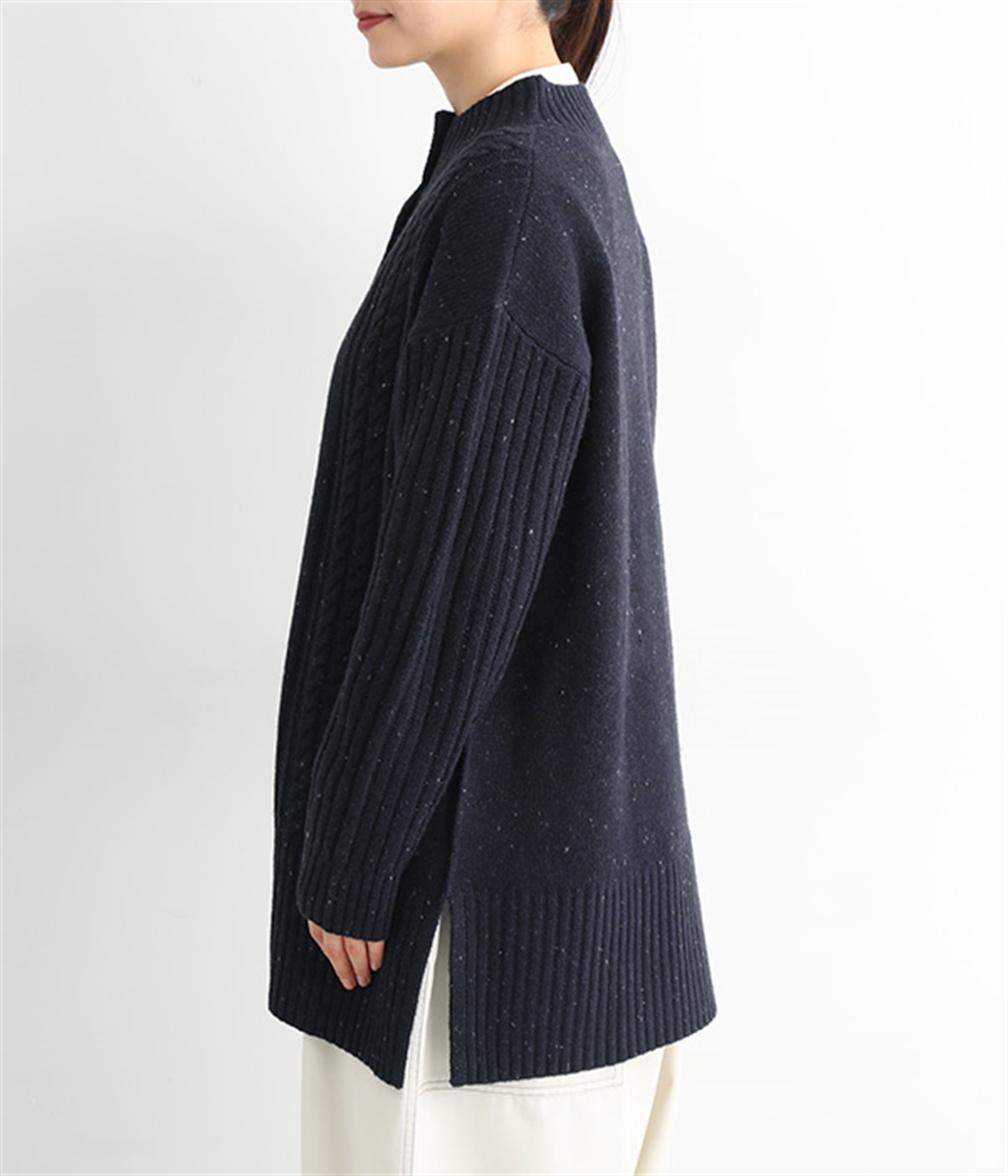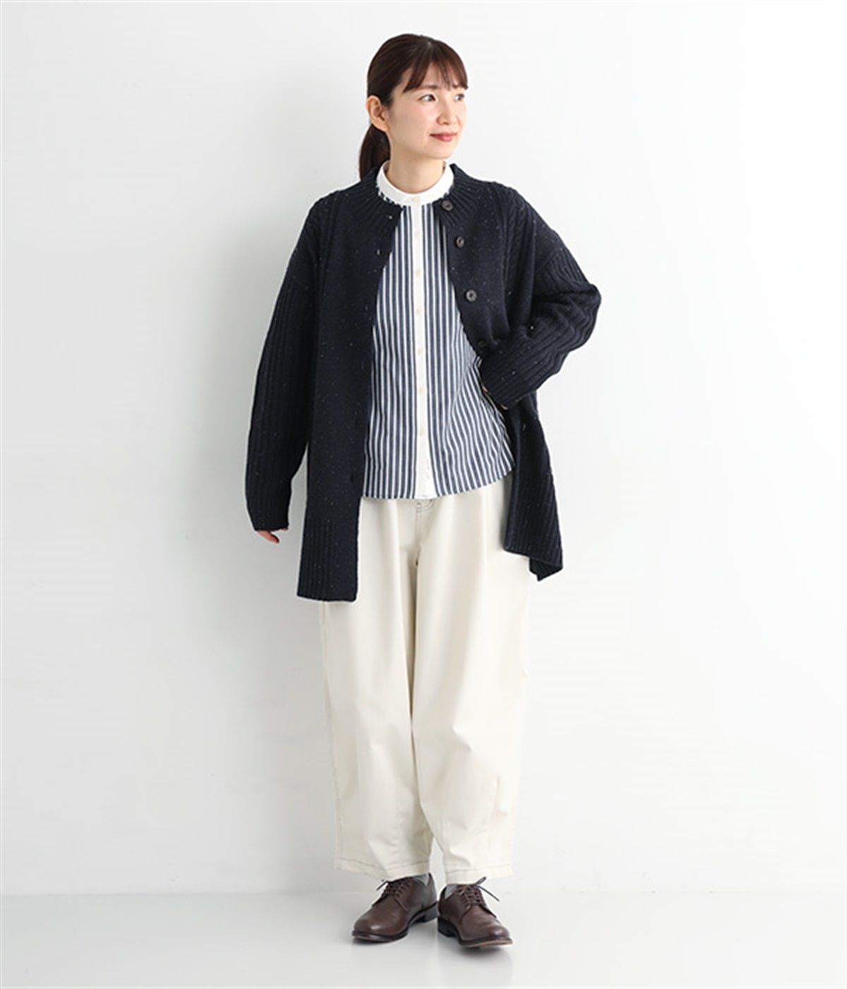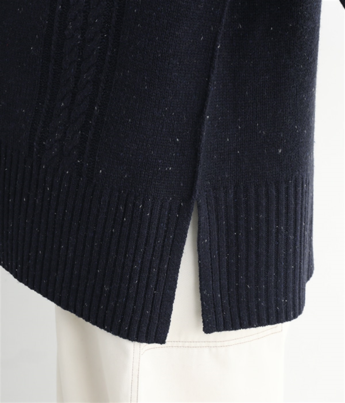 縦ラインを意識した柄編みがスタイリングをすっきり見せ