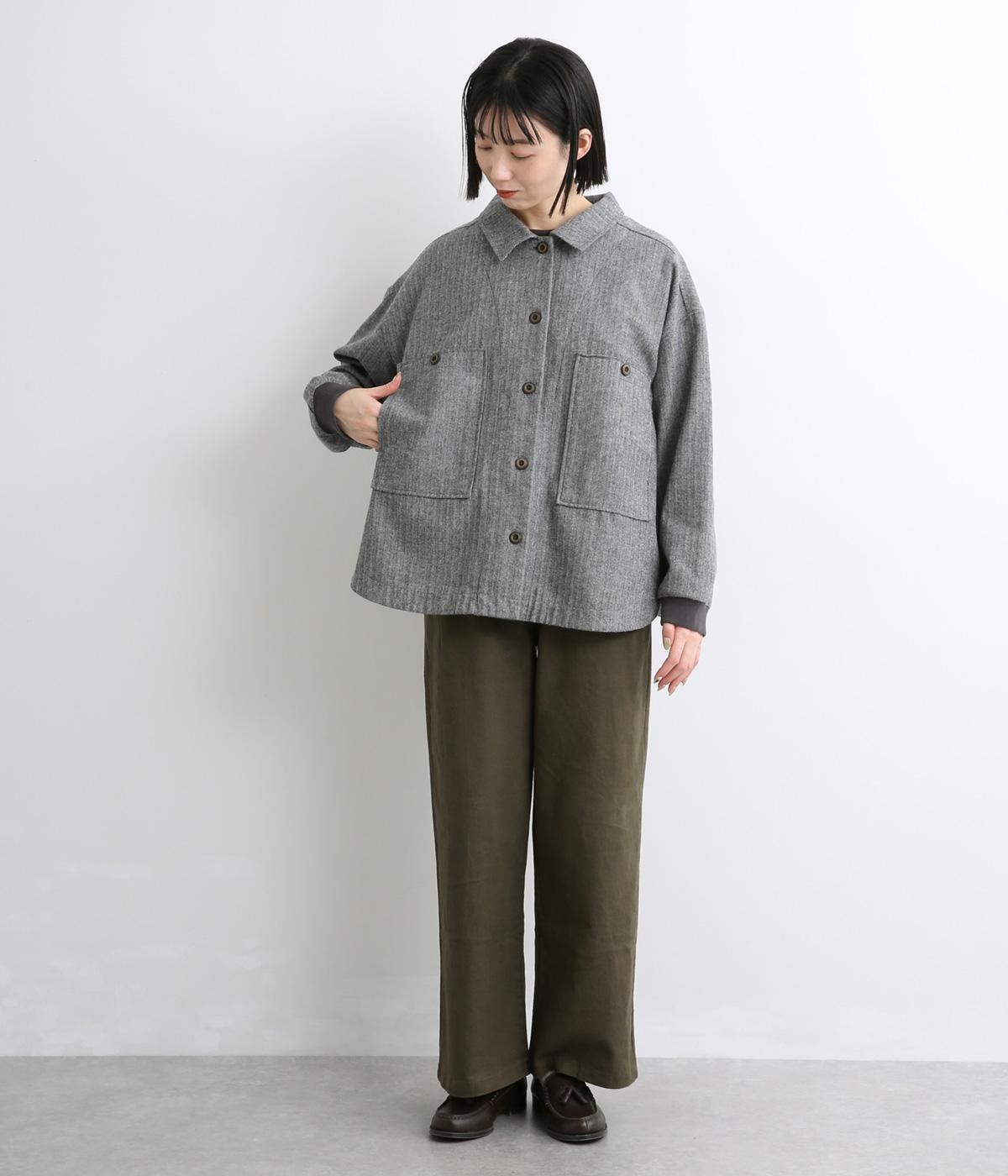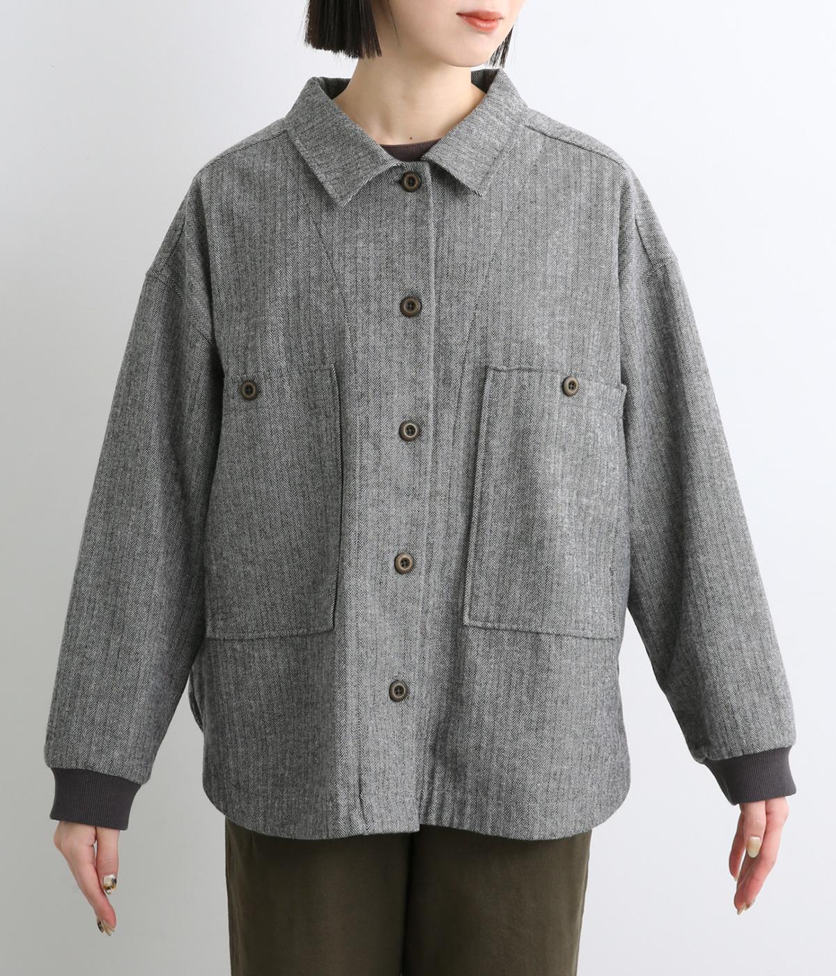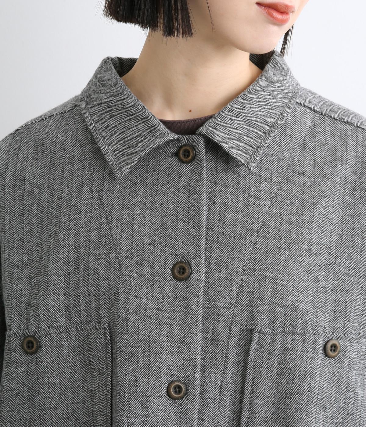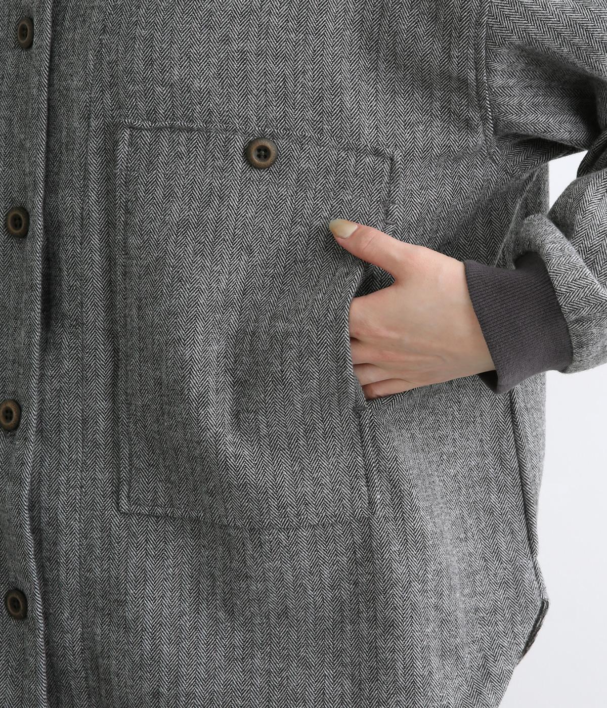 ワークテイストを、品のあるヘリンボン柄で大人カジュアルに仕上げました。前面に配した大きなポケットがデザインポイントです。ふんわりとしたシルエットや、丸みのある裾のラインで女性らしさもプラスしました。