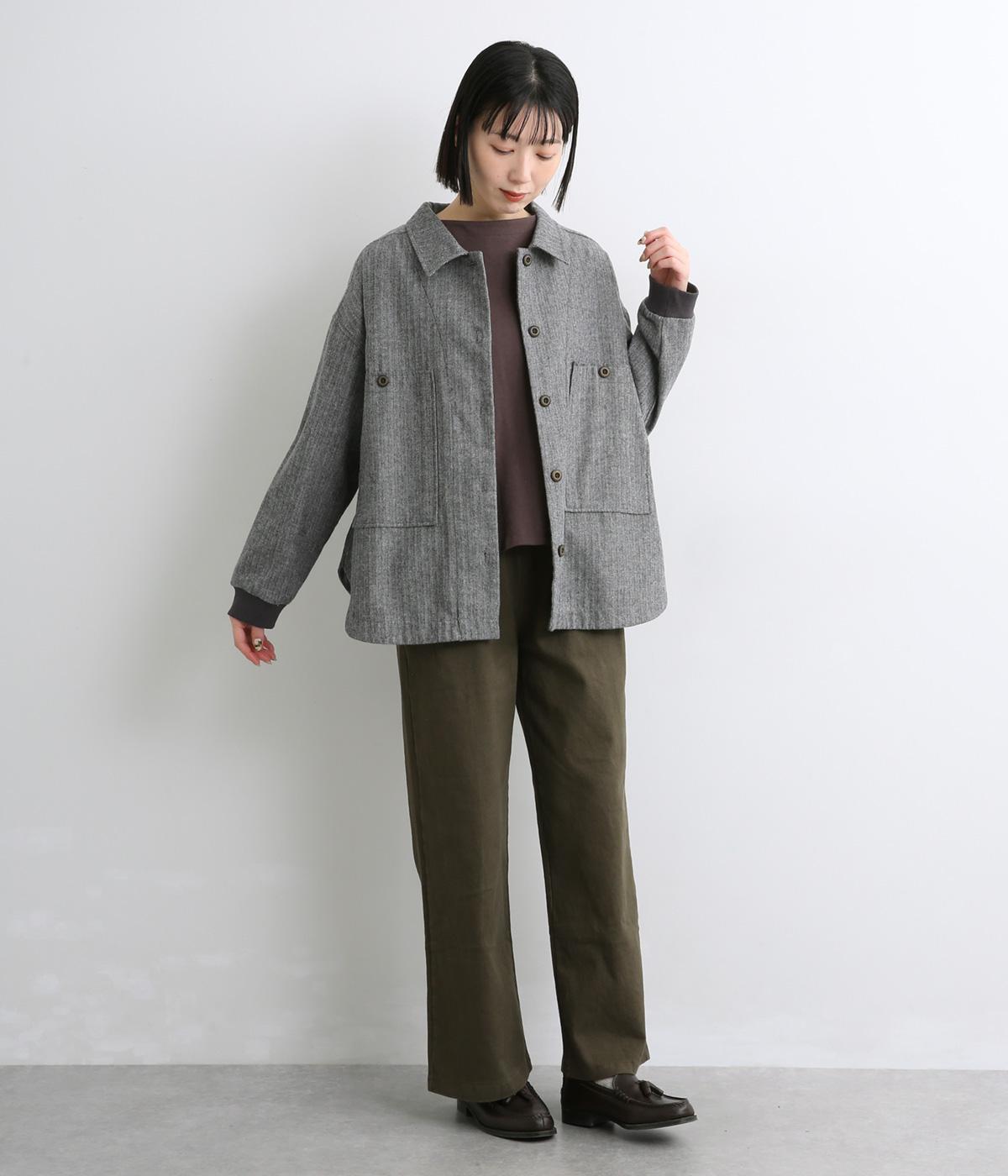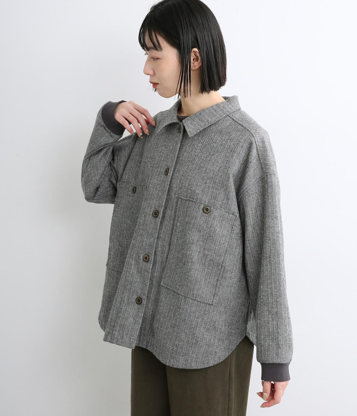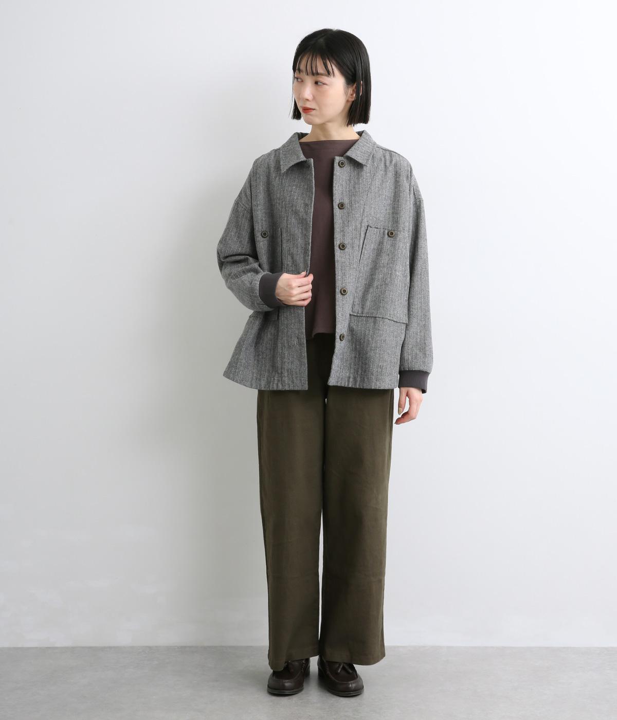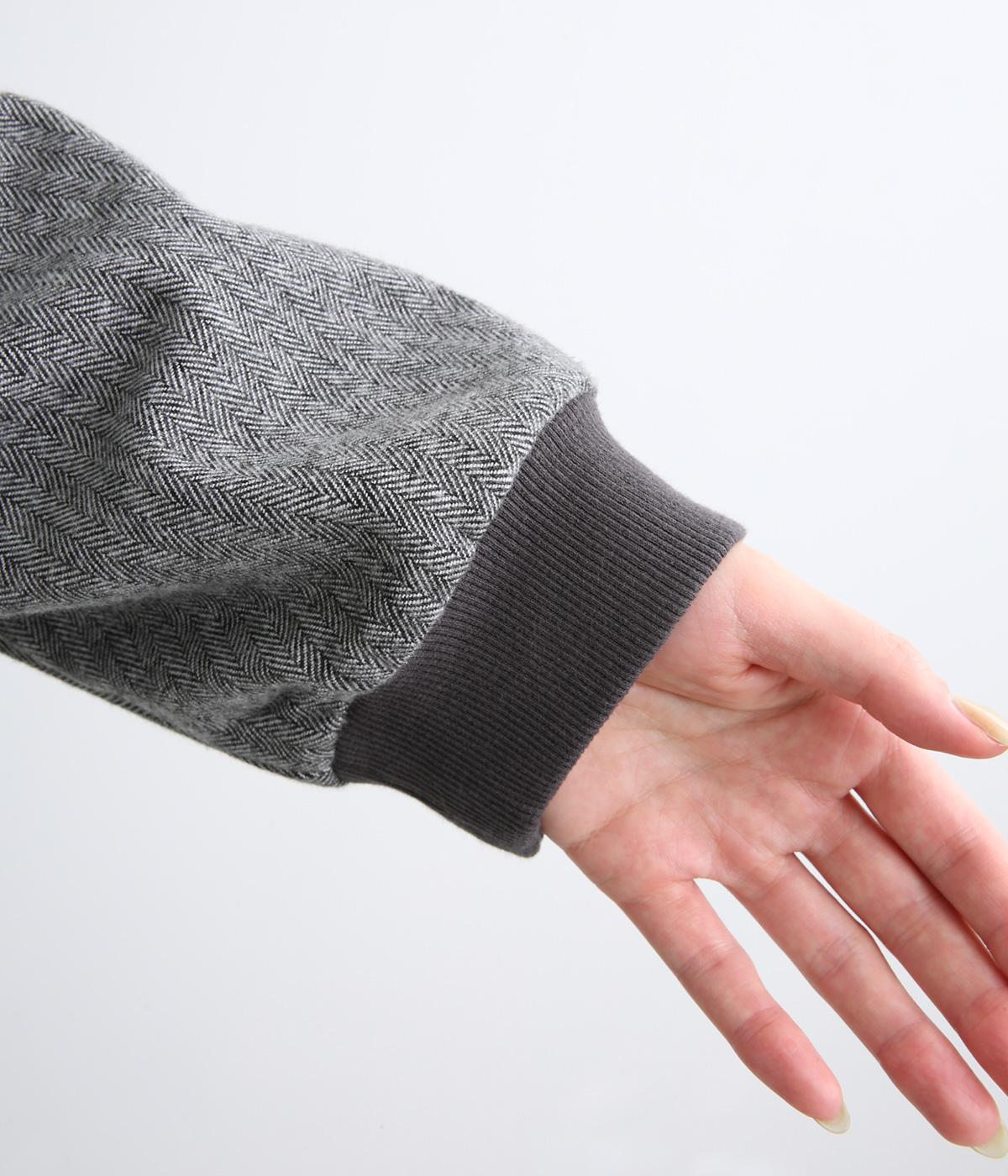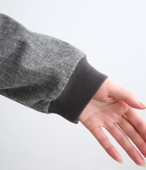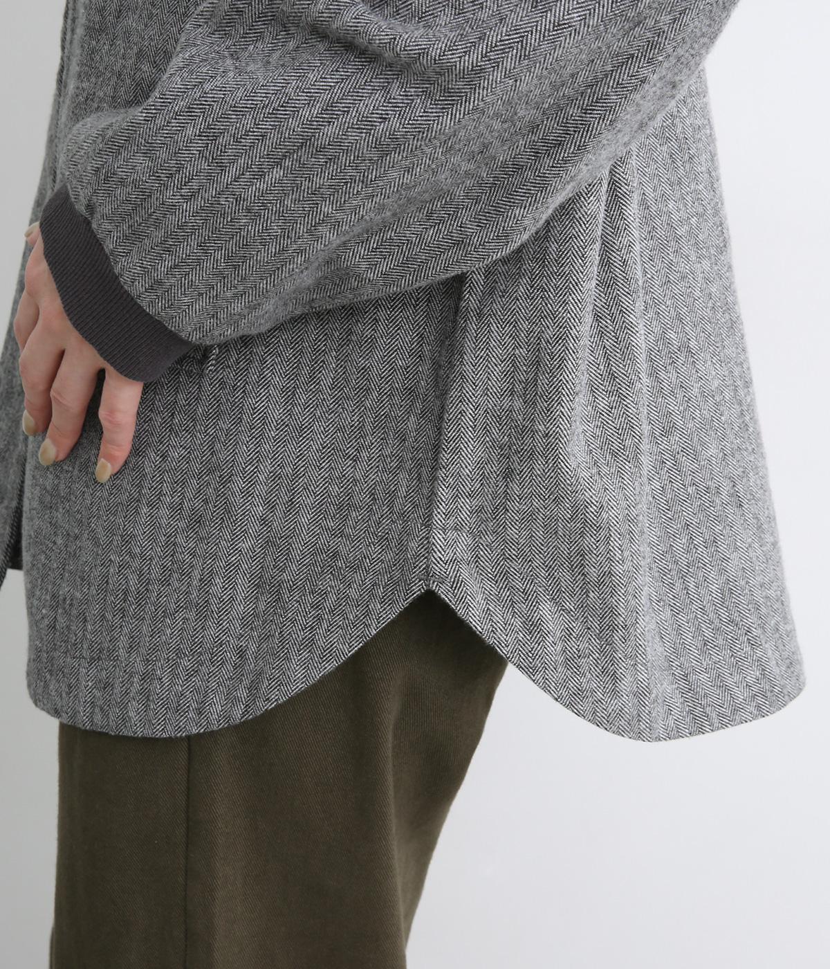 ワークテイストを、品のあるヘリンボン柄で大人カジュアルに仕上げました。前面に配した大きなポケットがデザインポイントです。ふんわりとしたシルエットや、丸みのある裾のラインで女性らしさもプラスしました。
