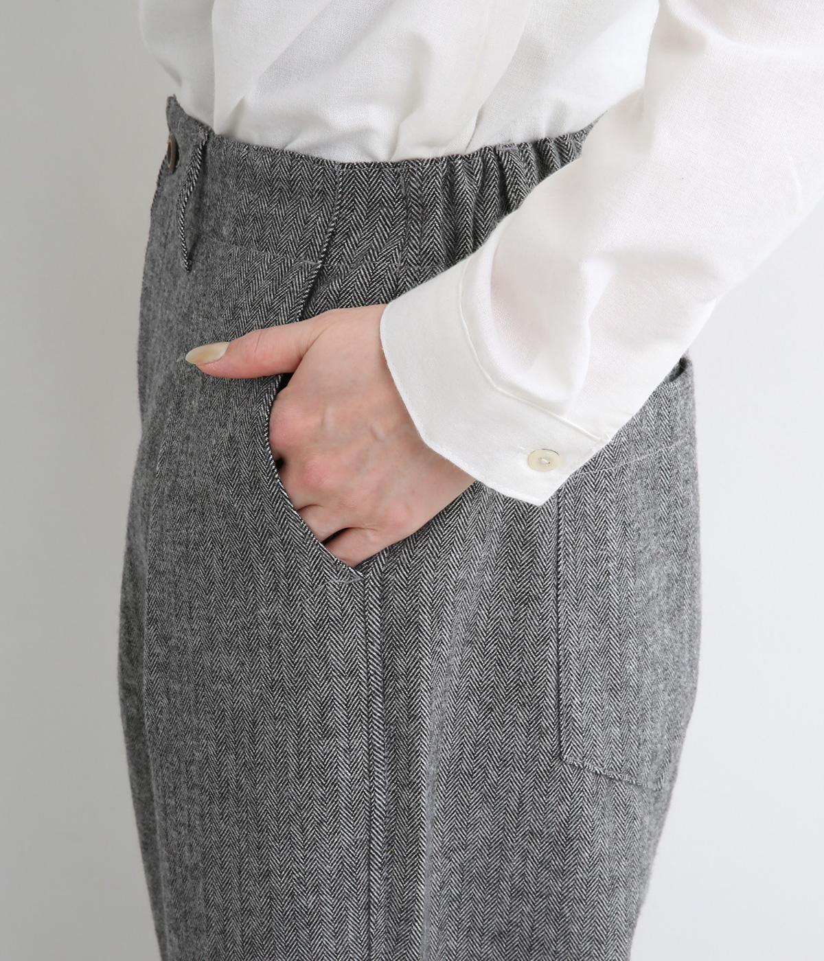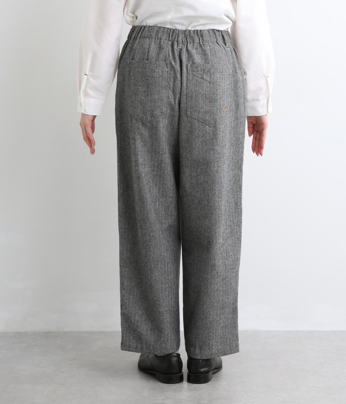 ほどよいハリがきれいなストレートシルエットを保ちます。ウエストは前ボタンとファスナー仕様で、うしろにゴムを配してフィット感を高めました。うしろポケットにはワンポイント刺しゅうをほどこしました。
