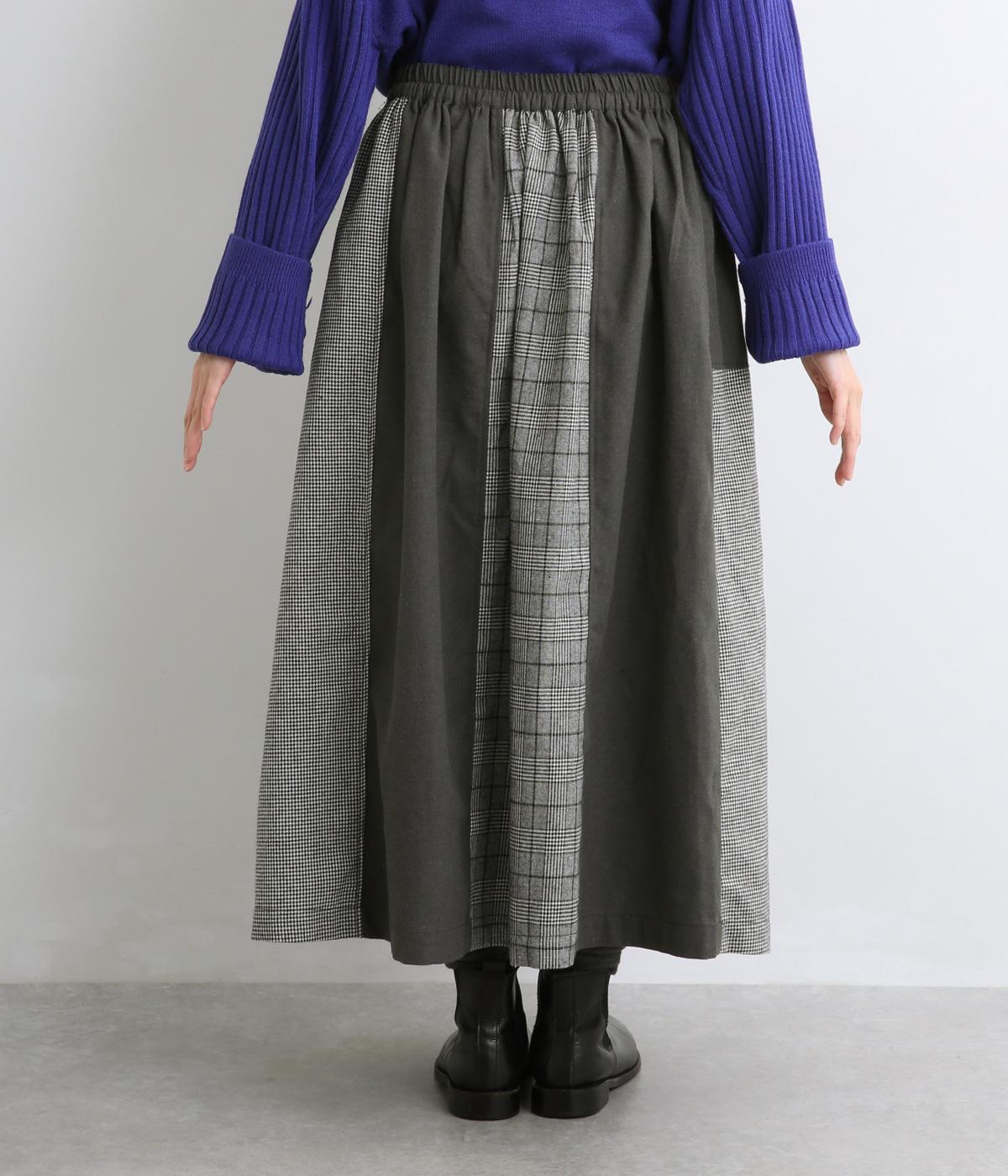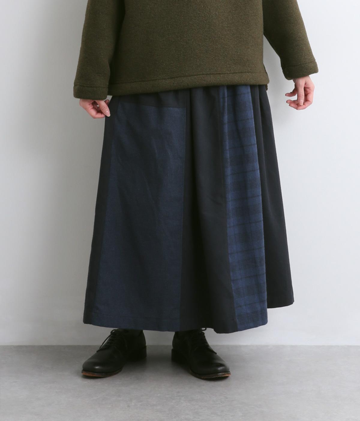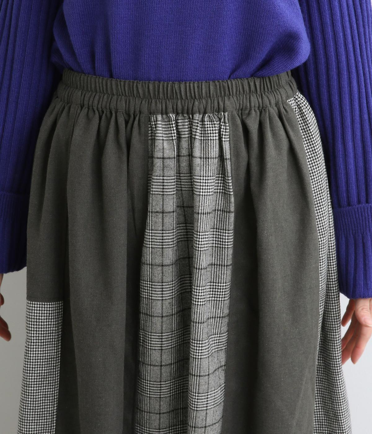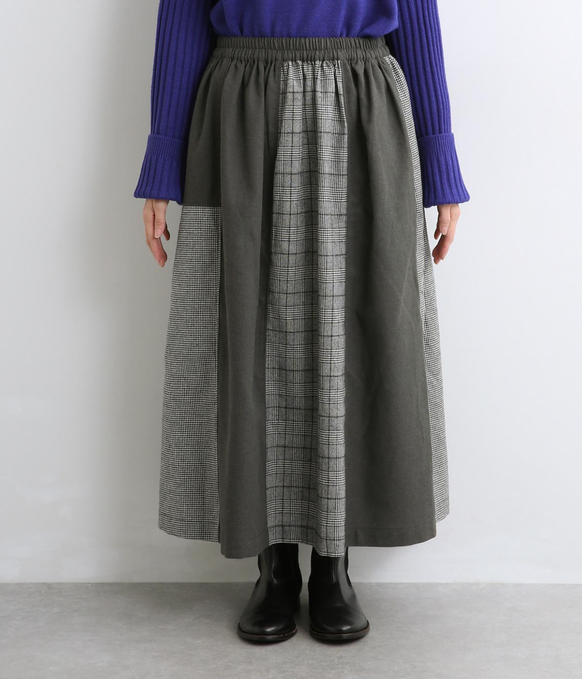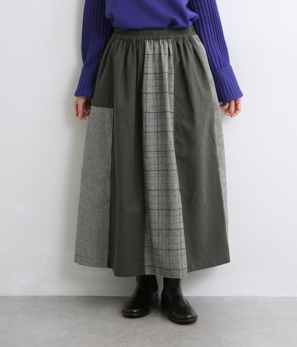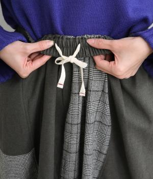 異なるチェック柄と無地をバランスよく配したパッチワークスカートです。個性的ながらシックな雰囲気に仕上げました。シンプルなトップスと合わせるだけでスタイリングが完成します。ウエストは総ゴム使用で紐でサイズ調節が可能です。