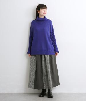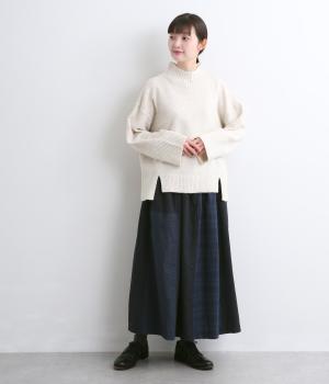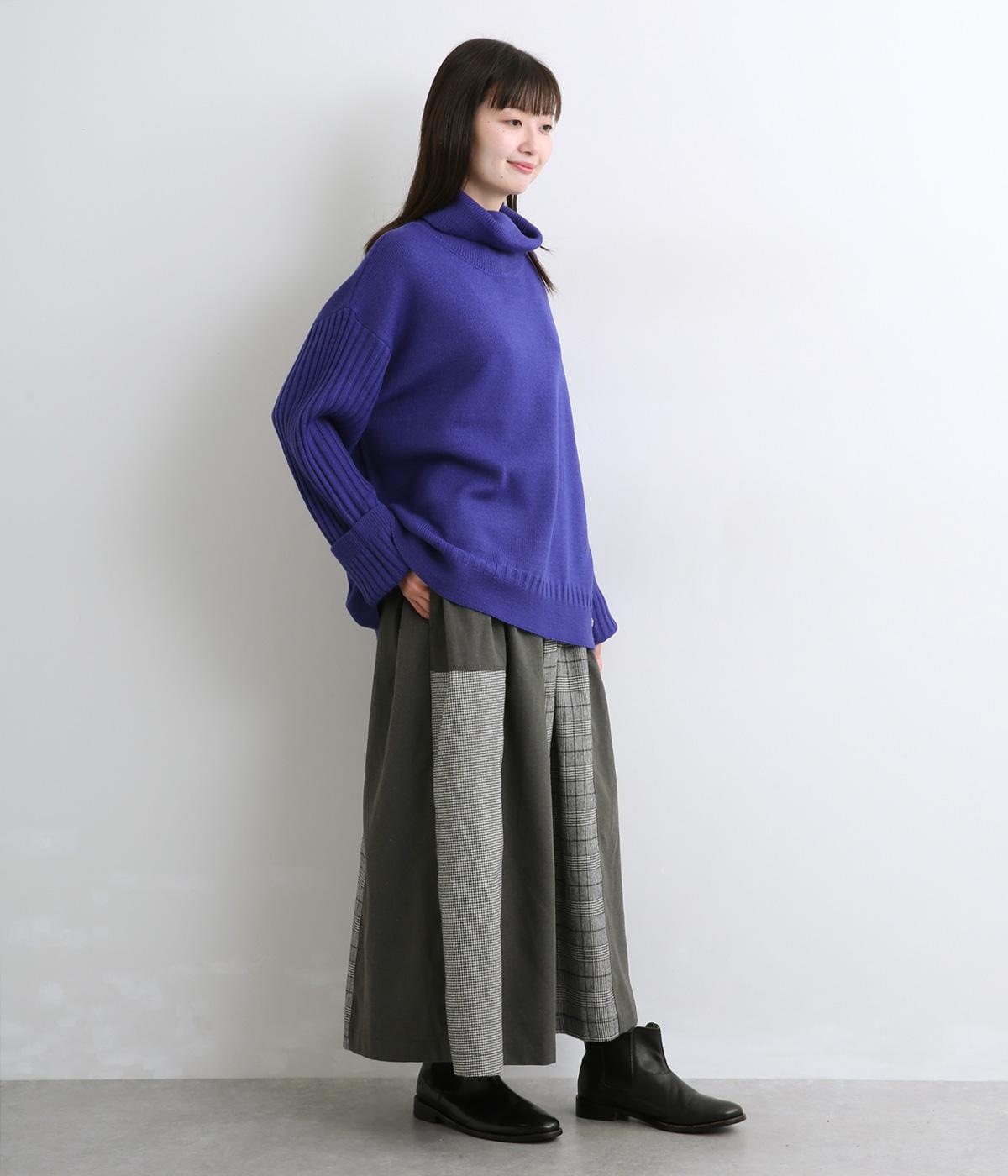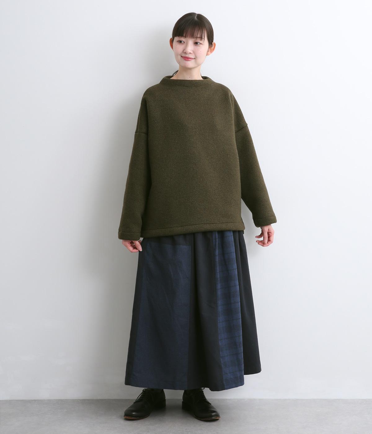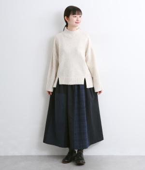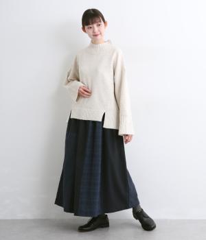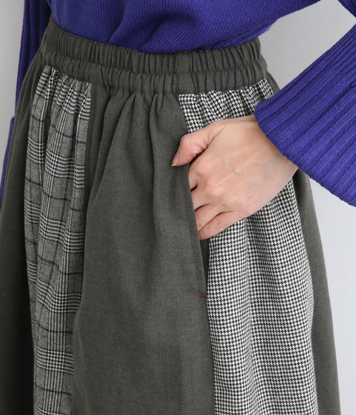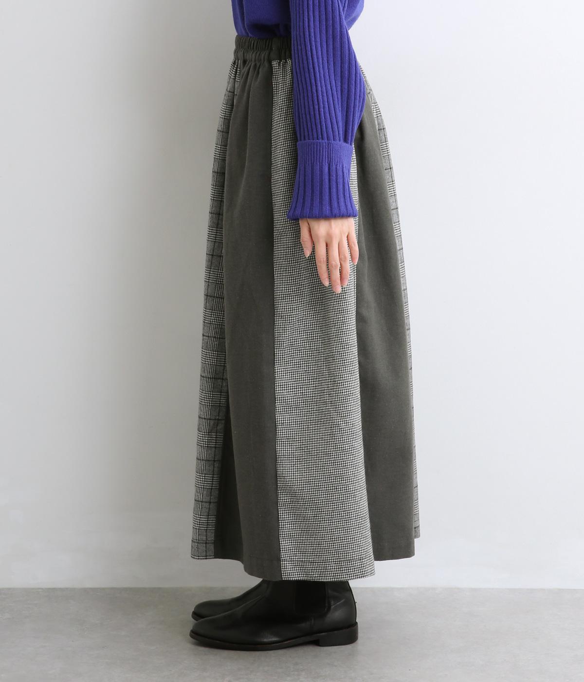 異なるチェック柄と無地をバランスよく配したパッチワークスカートです。個性的ながらシックな雰囲気に仕上げました。シンプルなトップスと合わせるだけでスタイリングが完成します。ウエストは総ゴム使用で紐でサイズ調節が可能です。