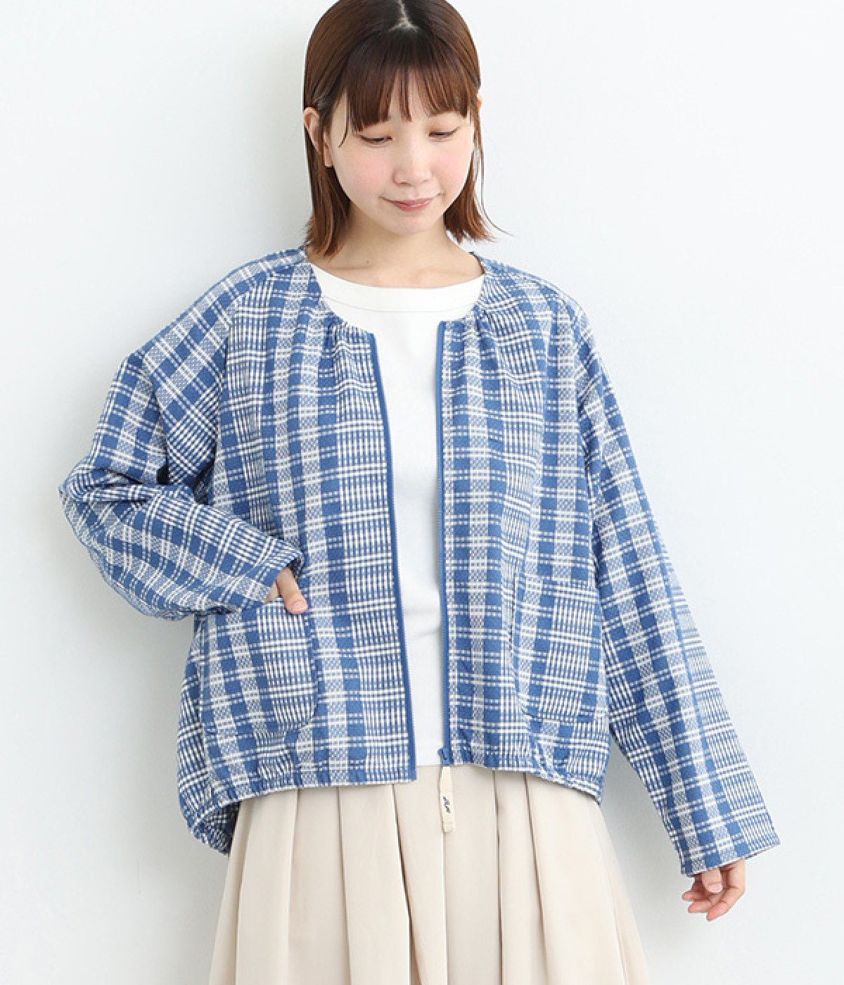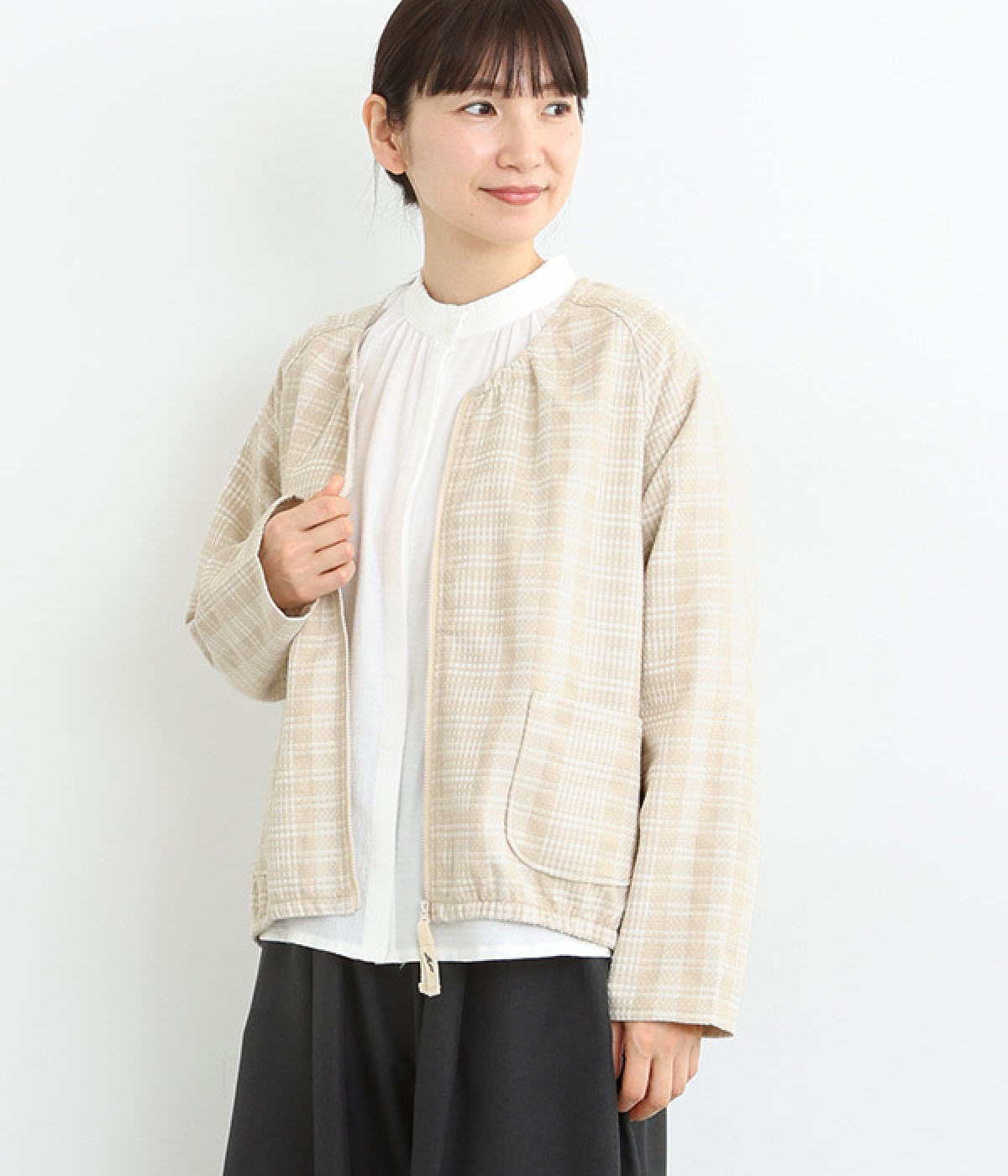 アームホールの可動域を大きくしたラグランスリーブにゆとりのあるシルエットで、さまざまなインナーに合わせやすい一着。着脱しやすいファスナー開閉がほどよくカジュアルダウン。季節の変わりめにも重宝します。