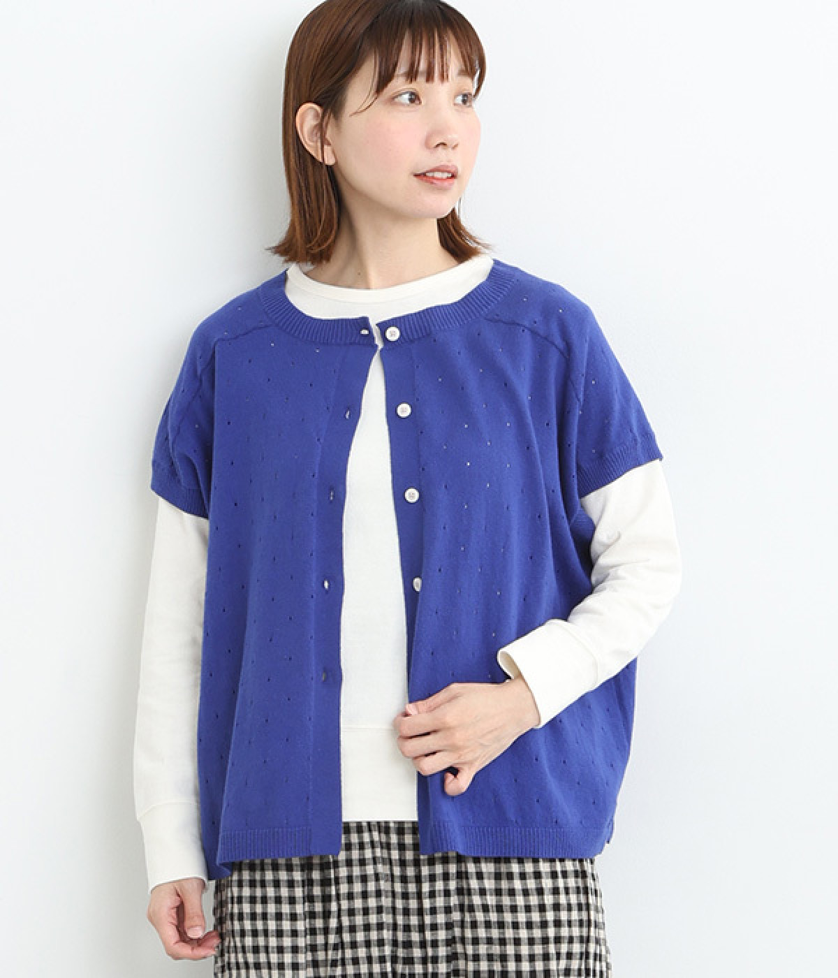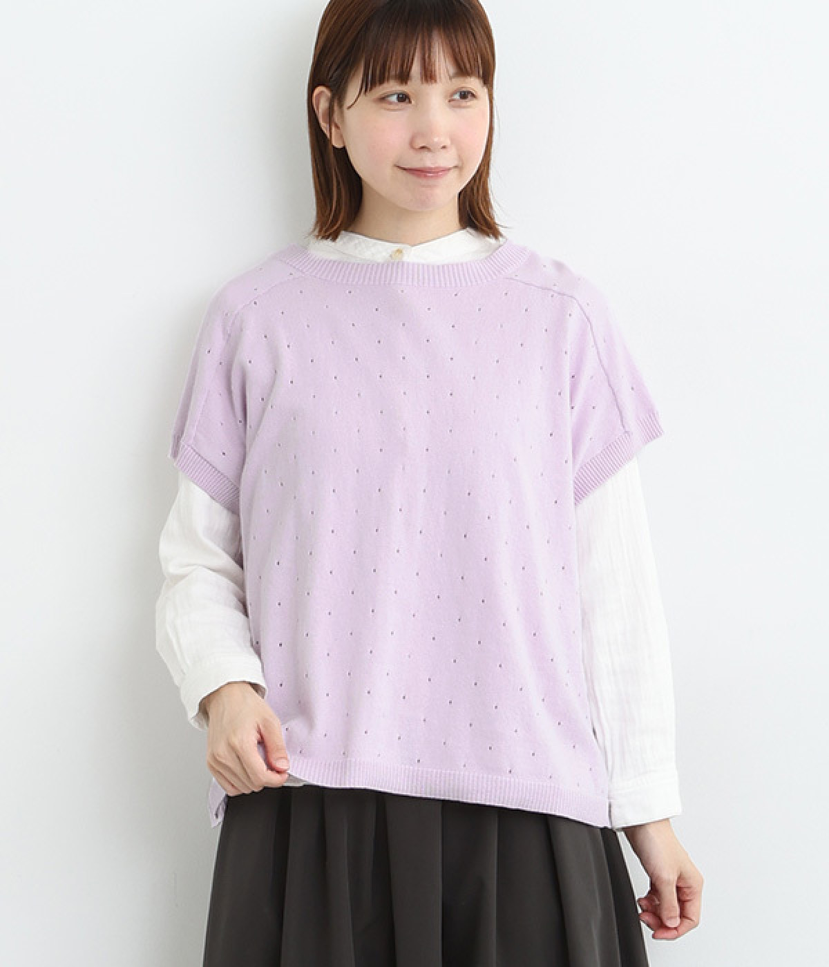 ドットの針抜き編地が特徴的な綿ニット仕立て。やわらかで着心地が良く、ドット部分からインナーがほんのり透けてレイヤードが楽しめる生地感。羽織りも合わせやすい薄めの中厚地です。