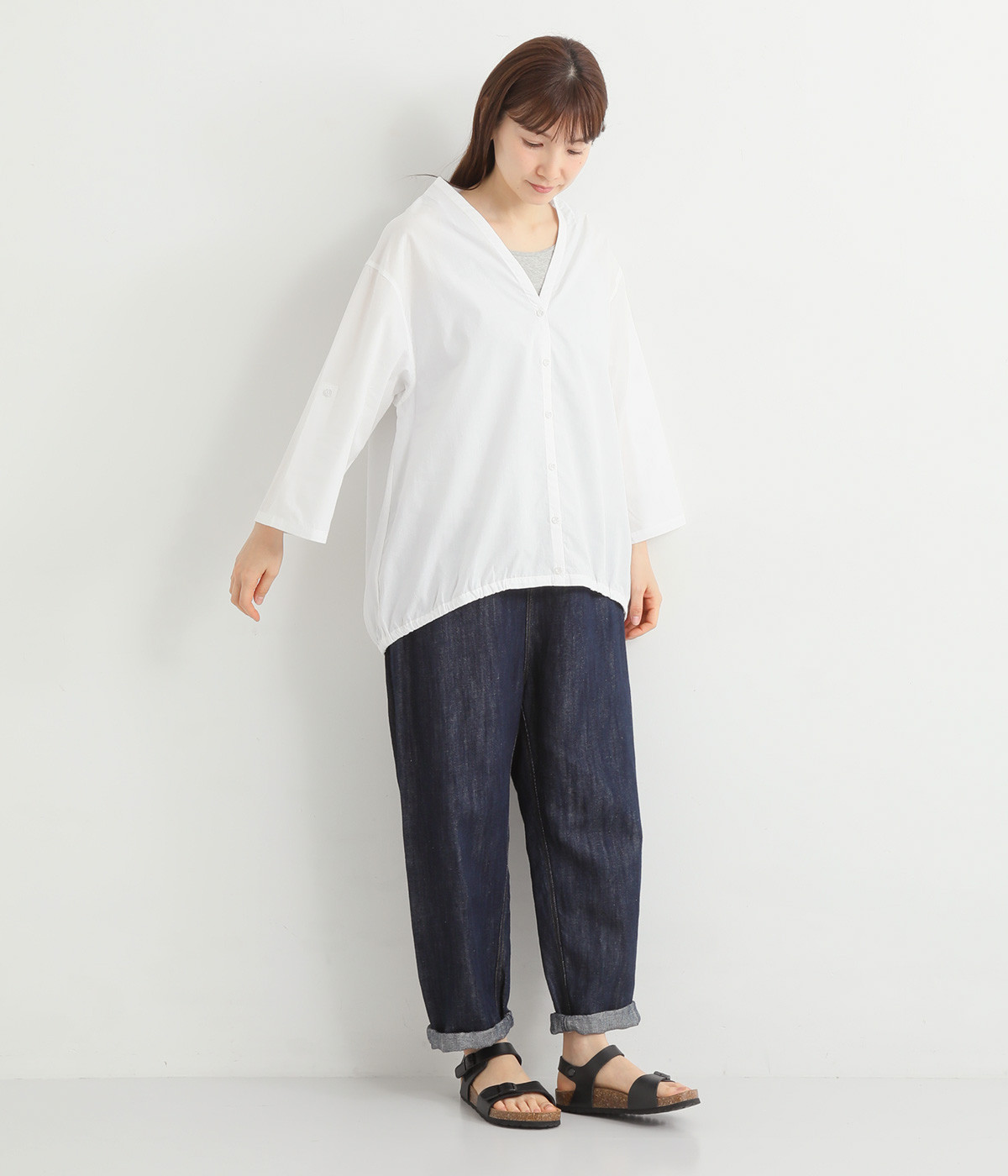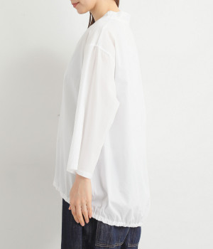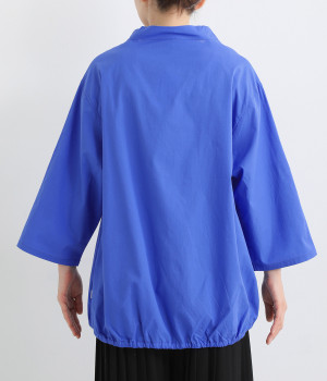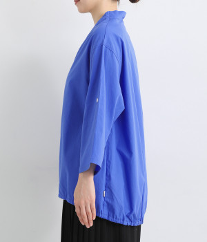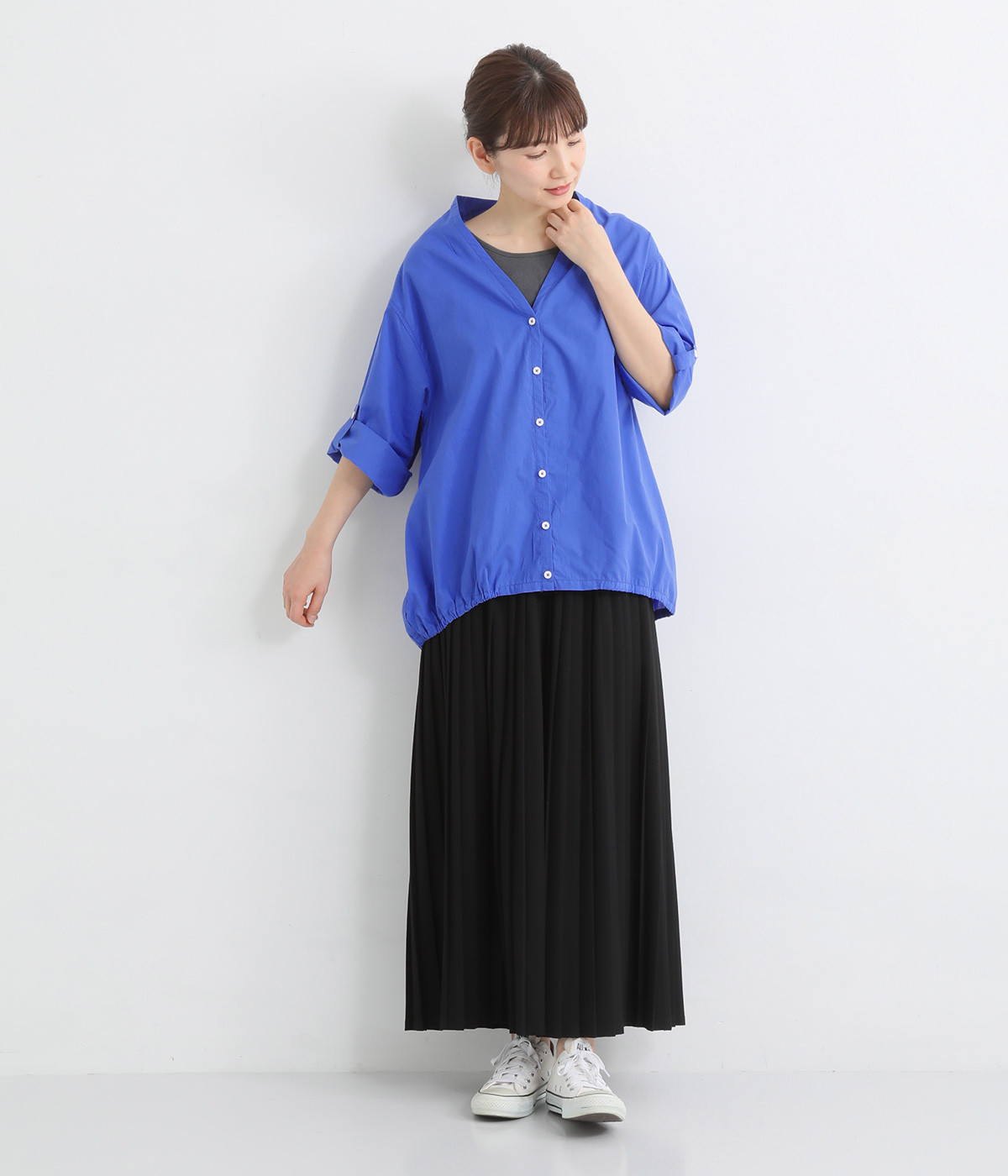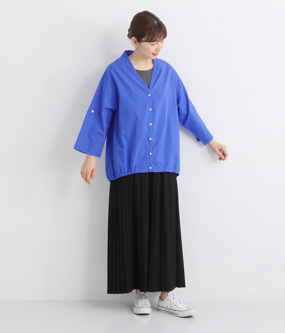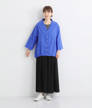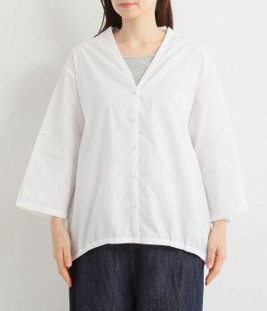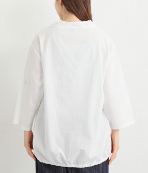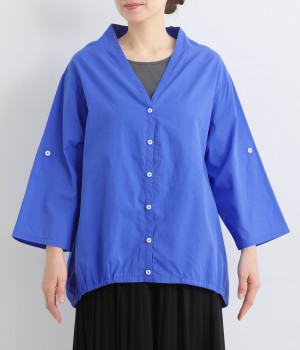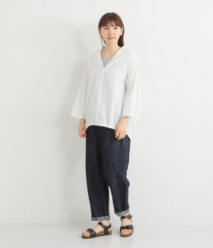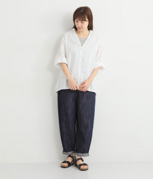 すっきりとしたVネックと裾にギャザーゴムを入れてふんわりとしたワイドシルエットの組み合わせが好バランスです。こなれ感のある袖のロールアップが可能なターンバックつき。袖丈に変化を加えるだけでも着こなしの印象が変わります。