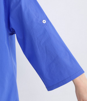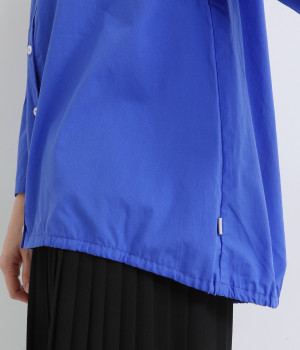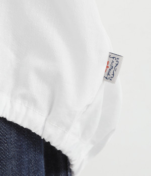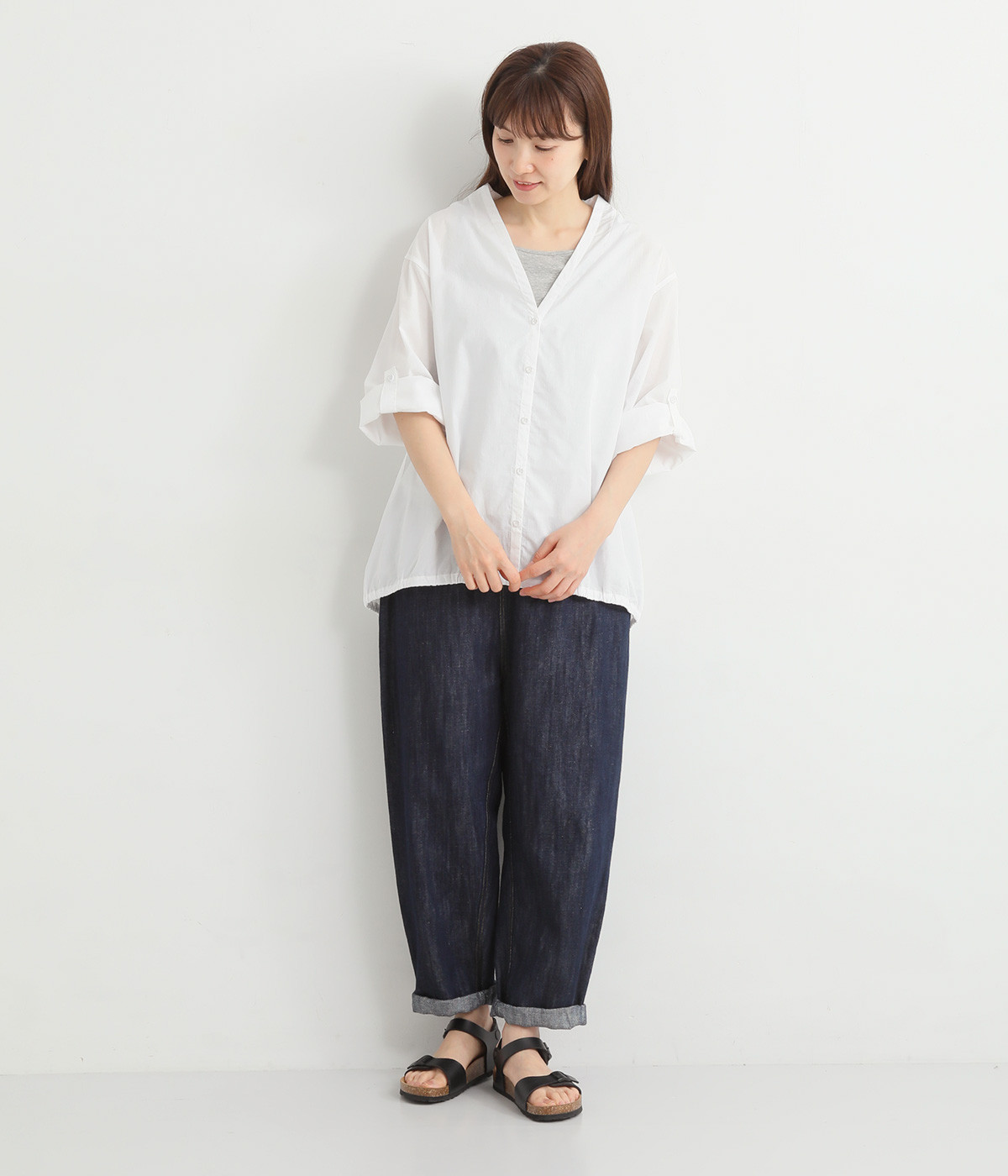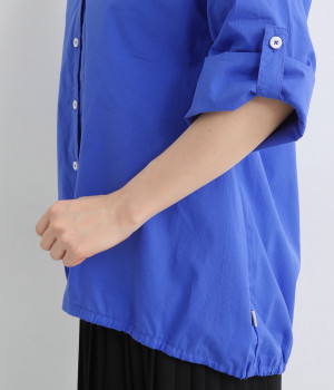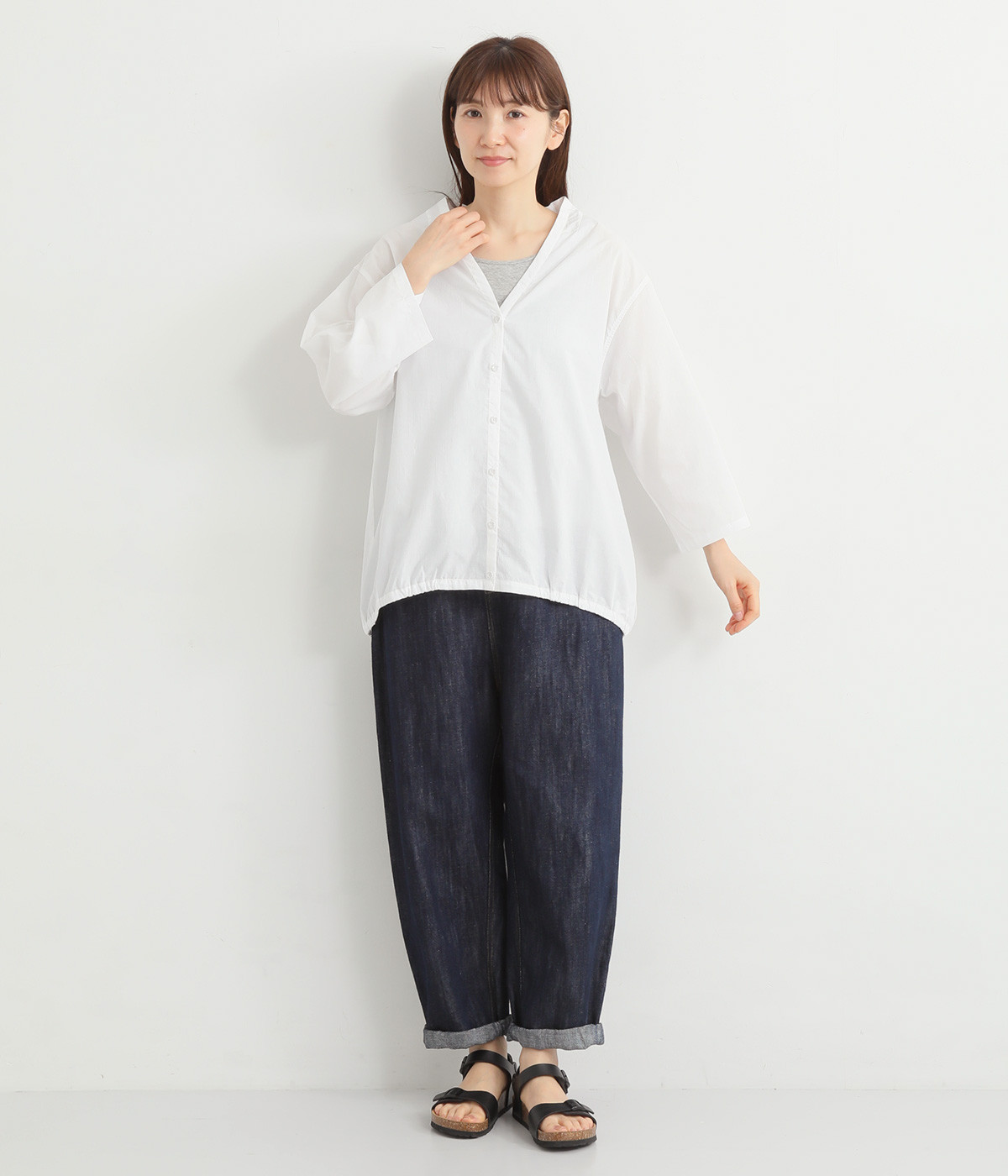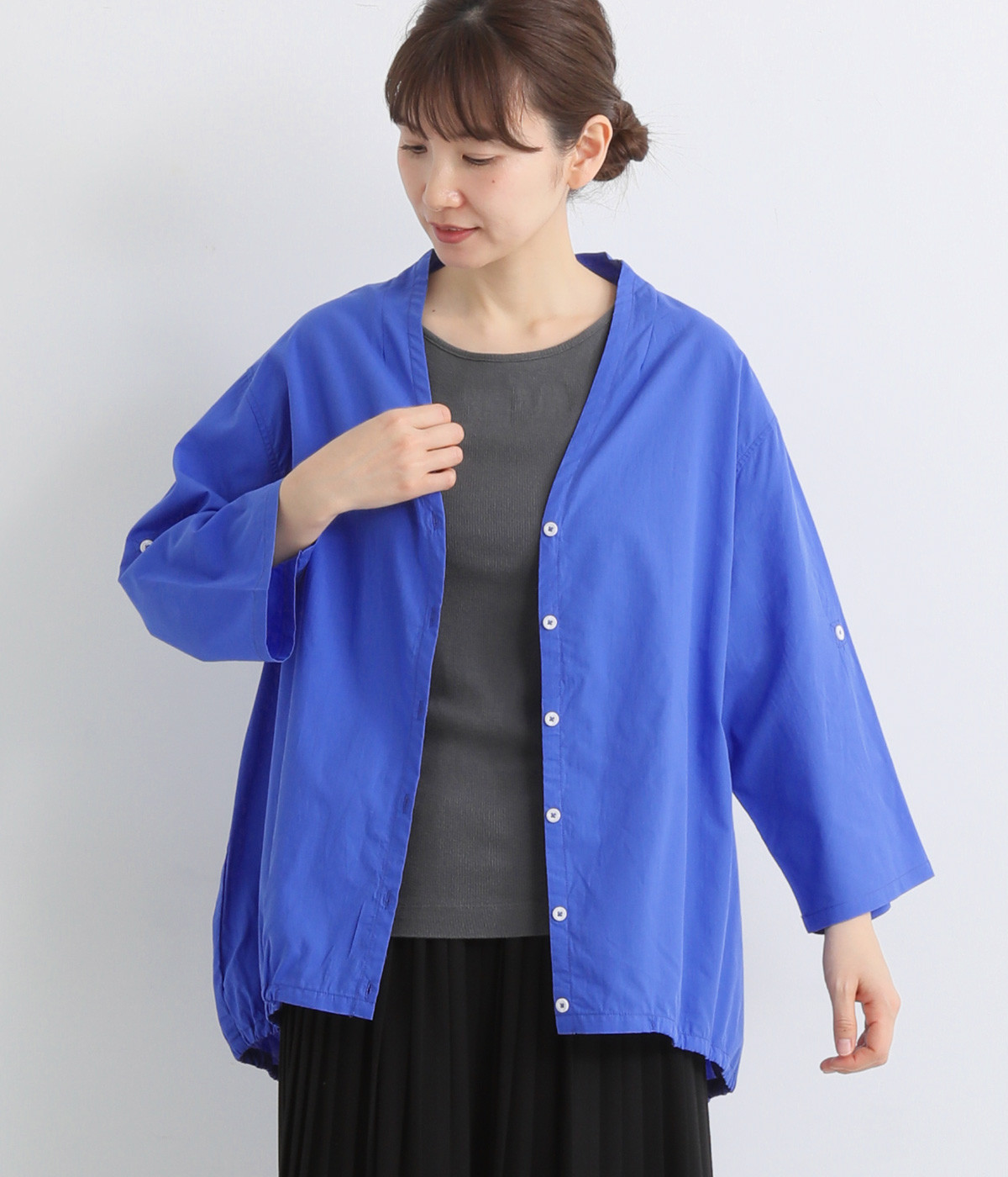 すっきりとしたVネックと裾にギャザーゴムを入れてふんわりとしたワイドシルエットの組み合わせが好バランスです。こなれ感のある袖のロールアップが可能なターンバックつき。袖丈に変化を加えるだけでも着こなしの印象が変わります。