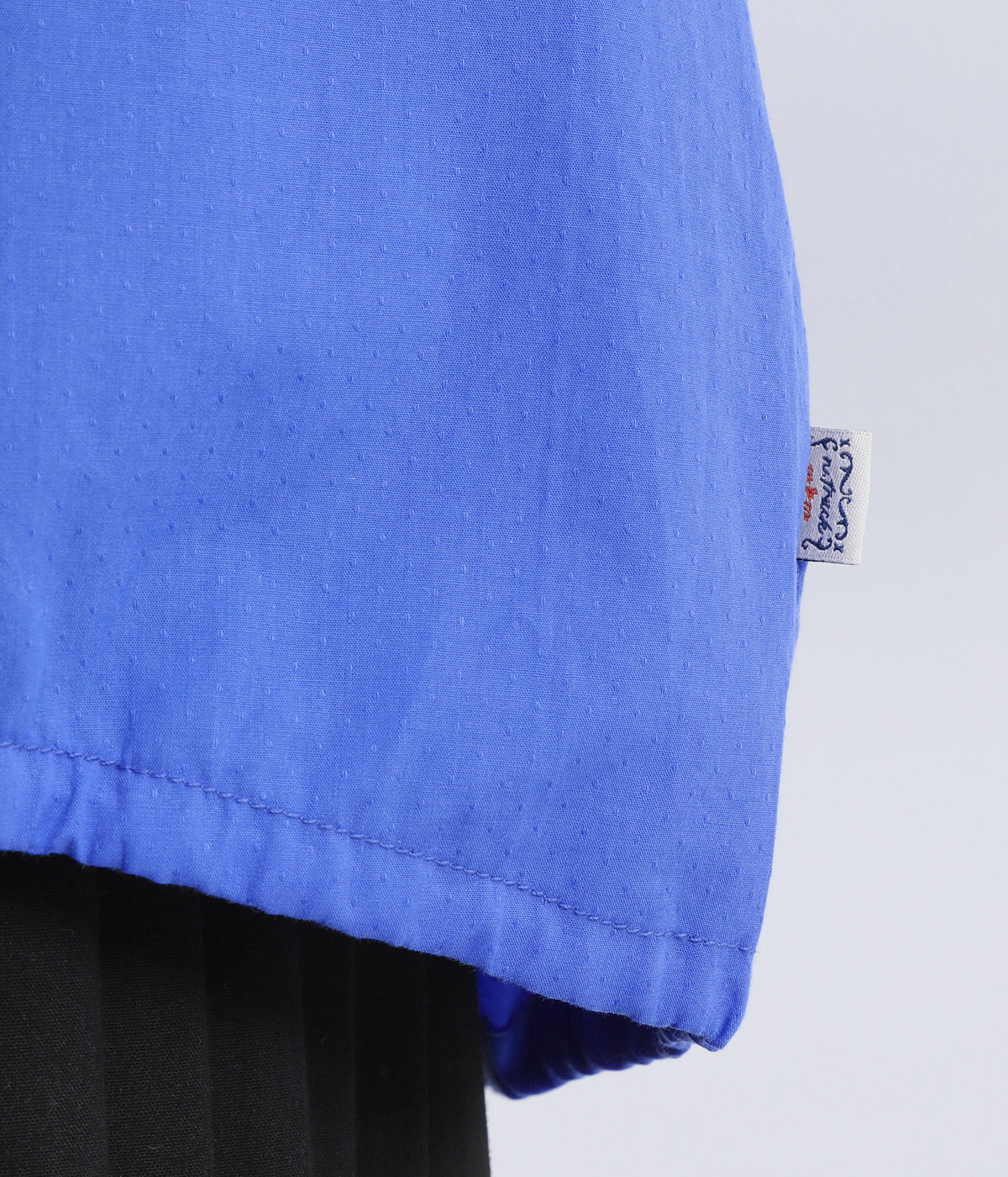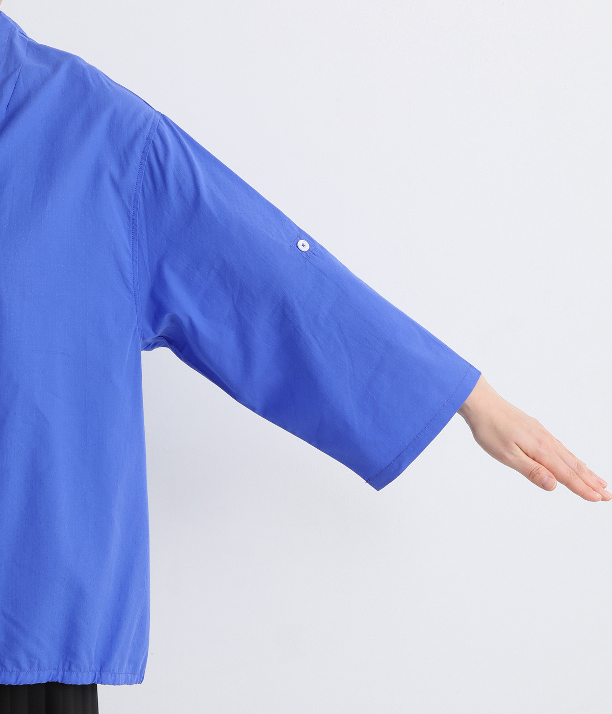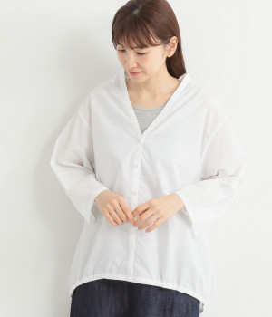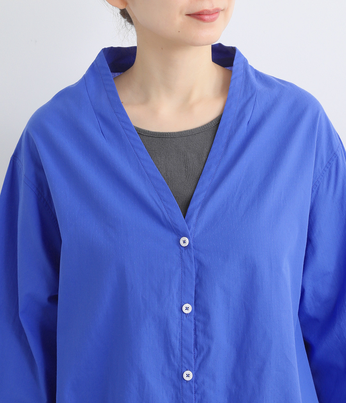 無地のように着まわし力の高い、小さなドットを織り上げたドビー生地です。薄手でやわらかく、適度にハリのある風合いに仕上げました。さっと軽やかに着用できるのが魅力です。
