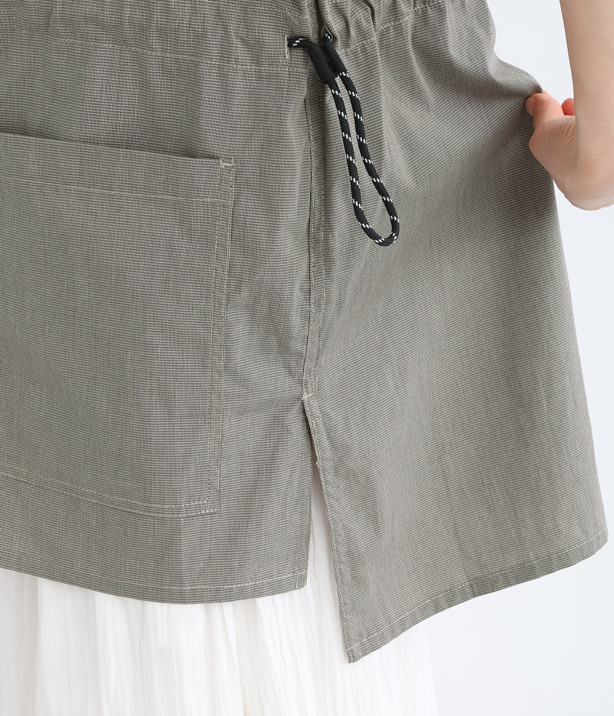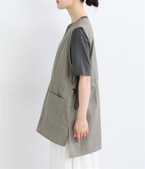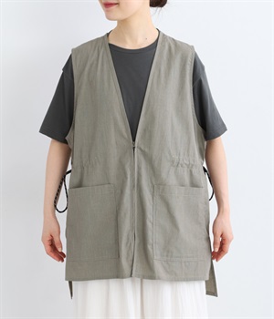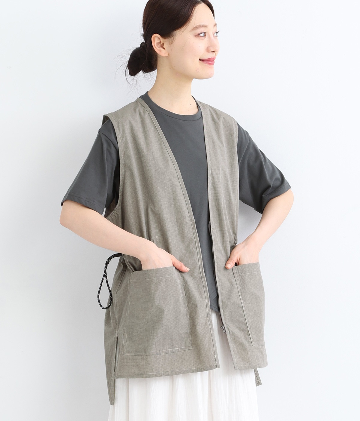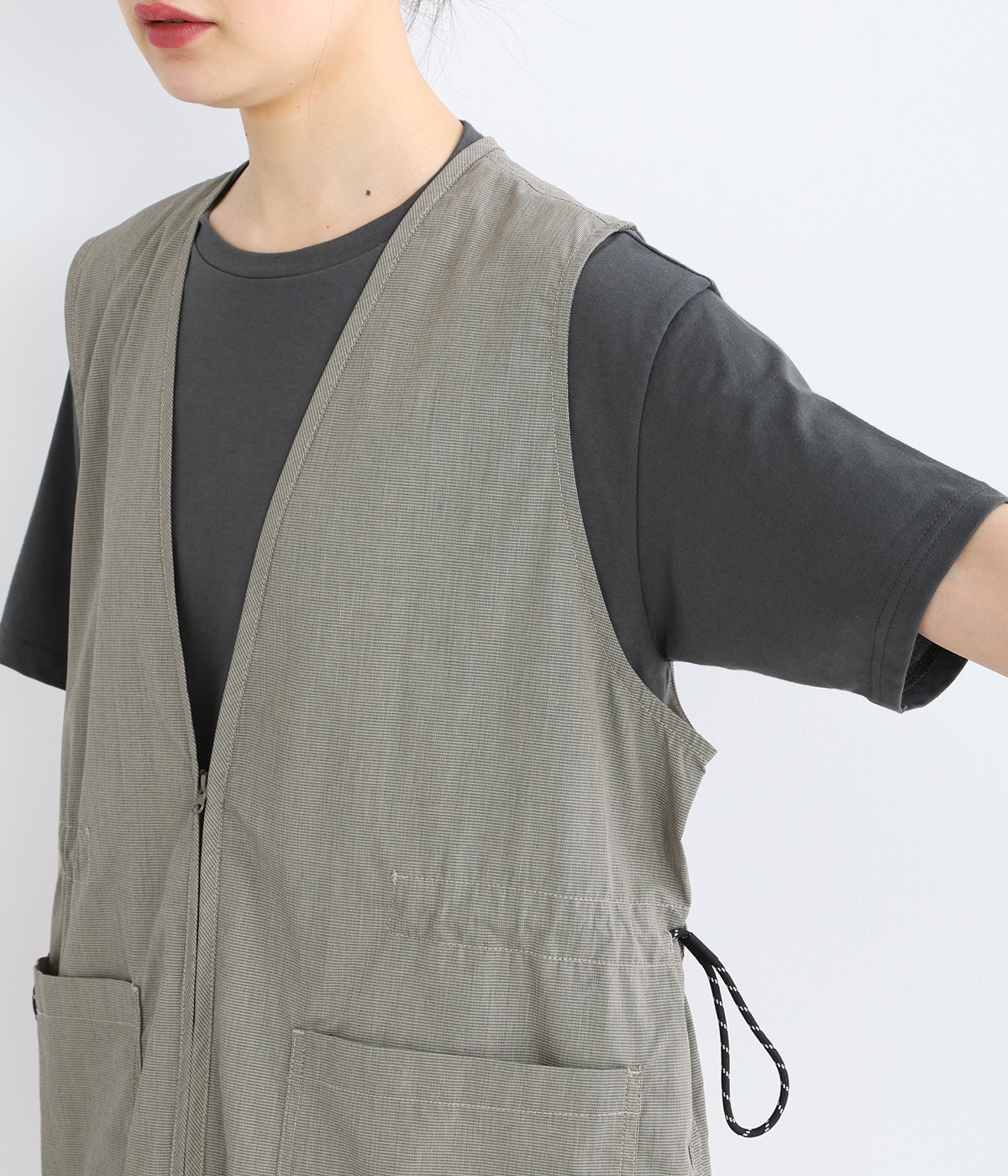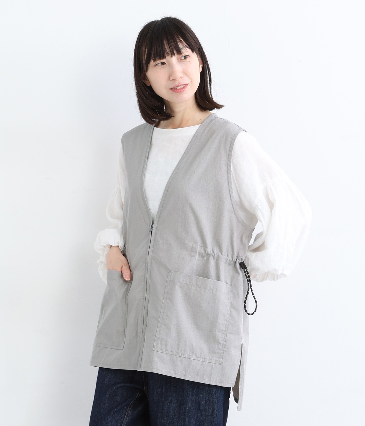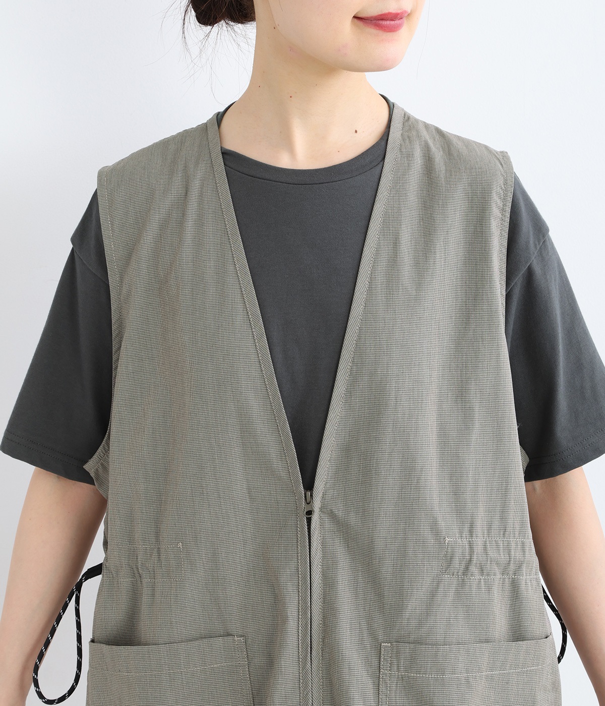 腰まわりをすっぽりとカバーしてくれるチュニック丈。きれいめからカジュアルまで合わせられるバランスにこだわりました。深めのVネックで顔まわりに抜け感を。着脱しやすいジップアップや胸下サイドのドロストコードなど、ディテールも多彩。