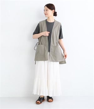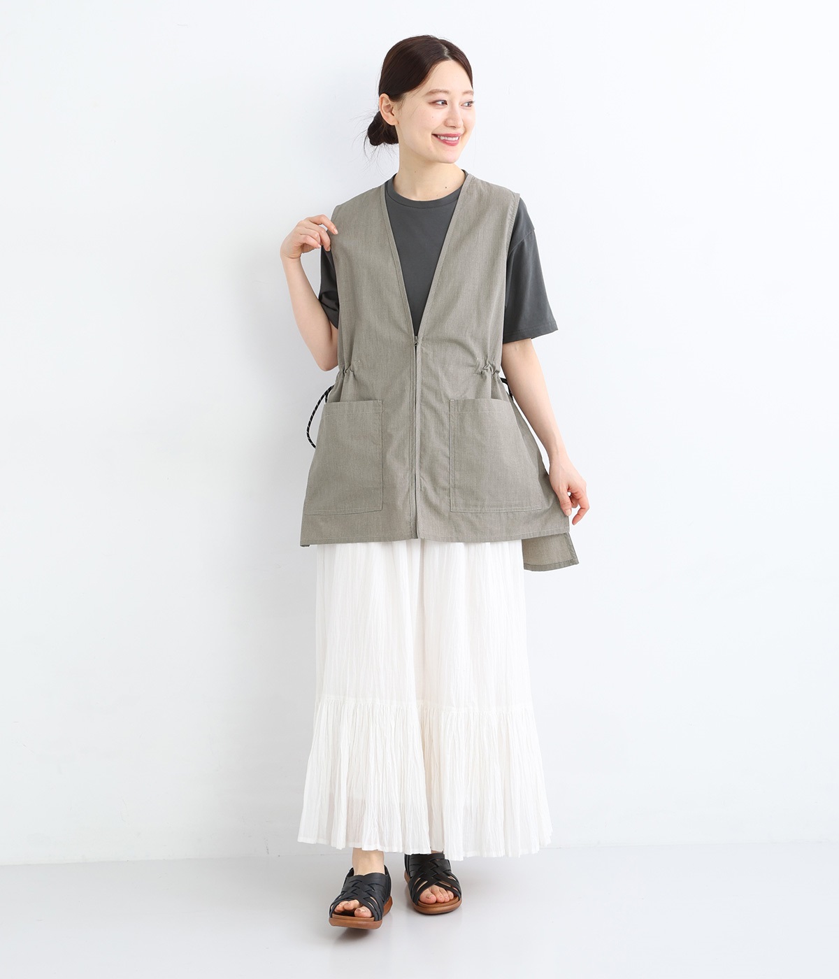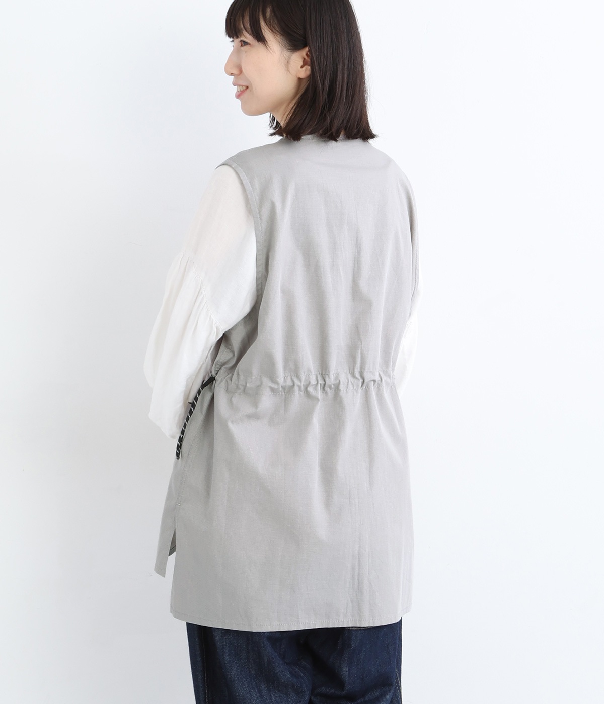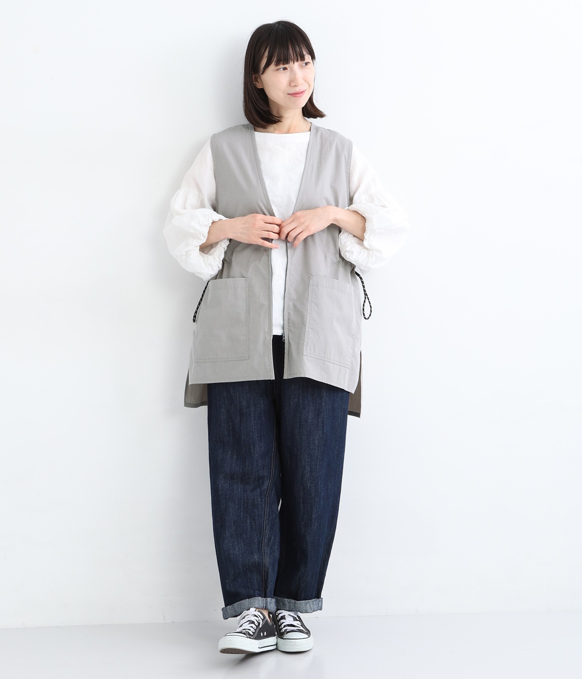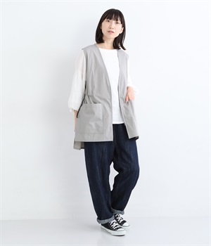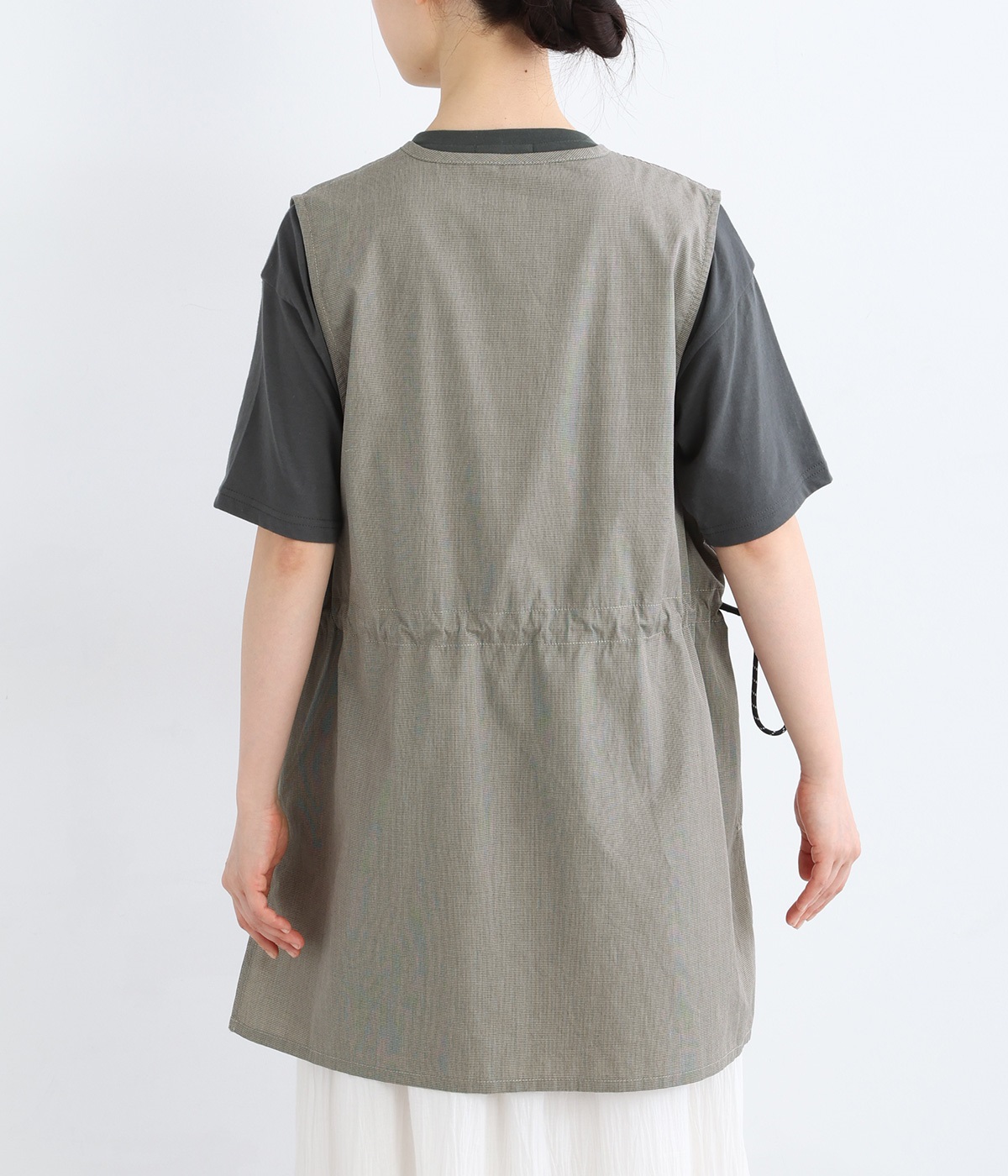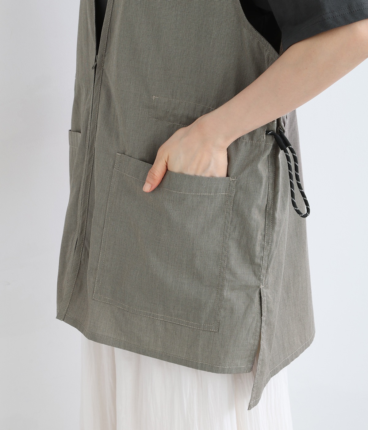 腰まわりをすっぽりとカバーしてくれるチュニック丈。きれいめからカジュアルまで合わせられるバランスにこだわりました。深めのVネックで顔まわりに抜け感を。着脱しやすいジップアップや胸下サイドのドロストコードなど、ディテールも多彩。