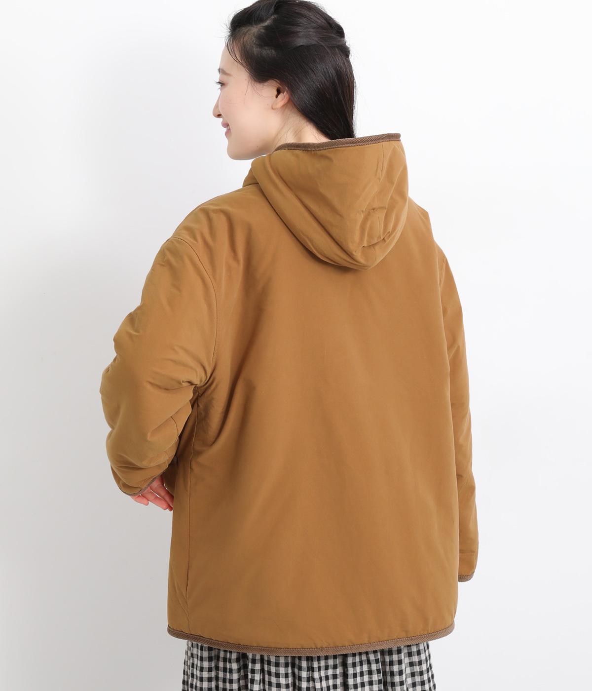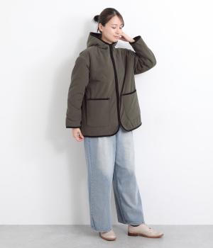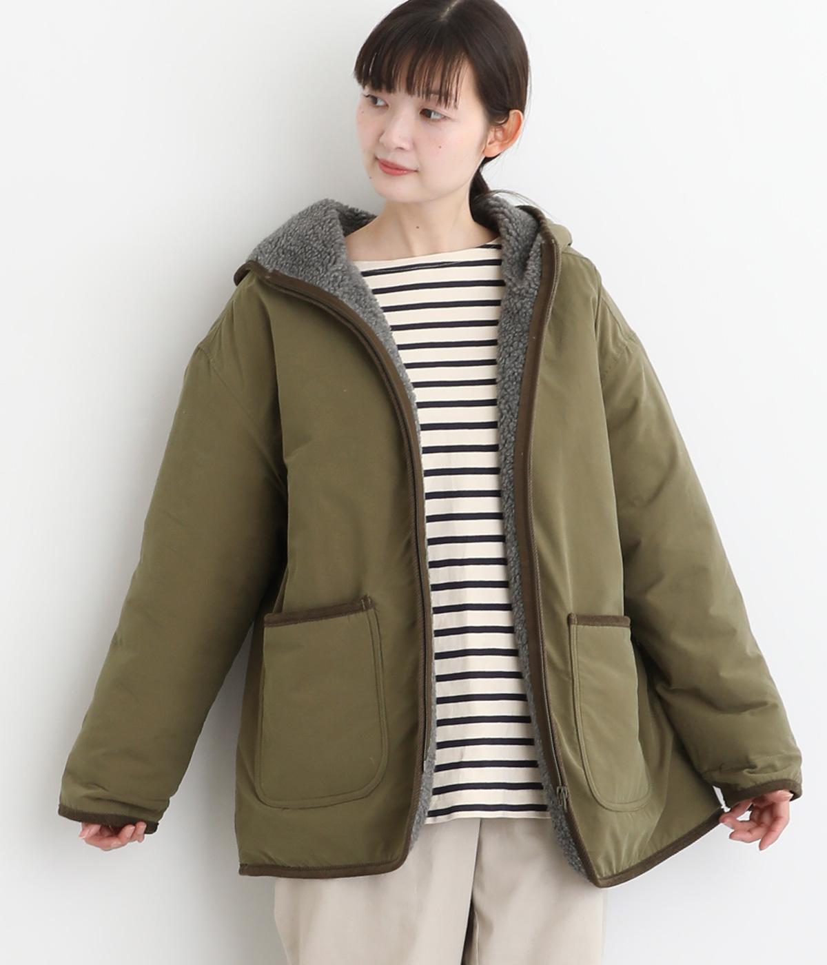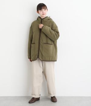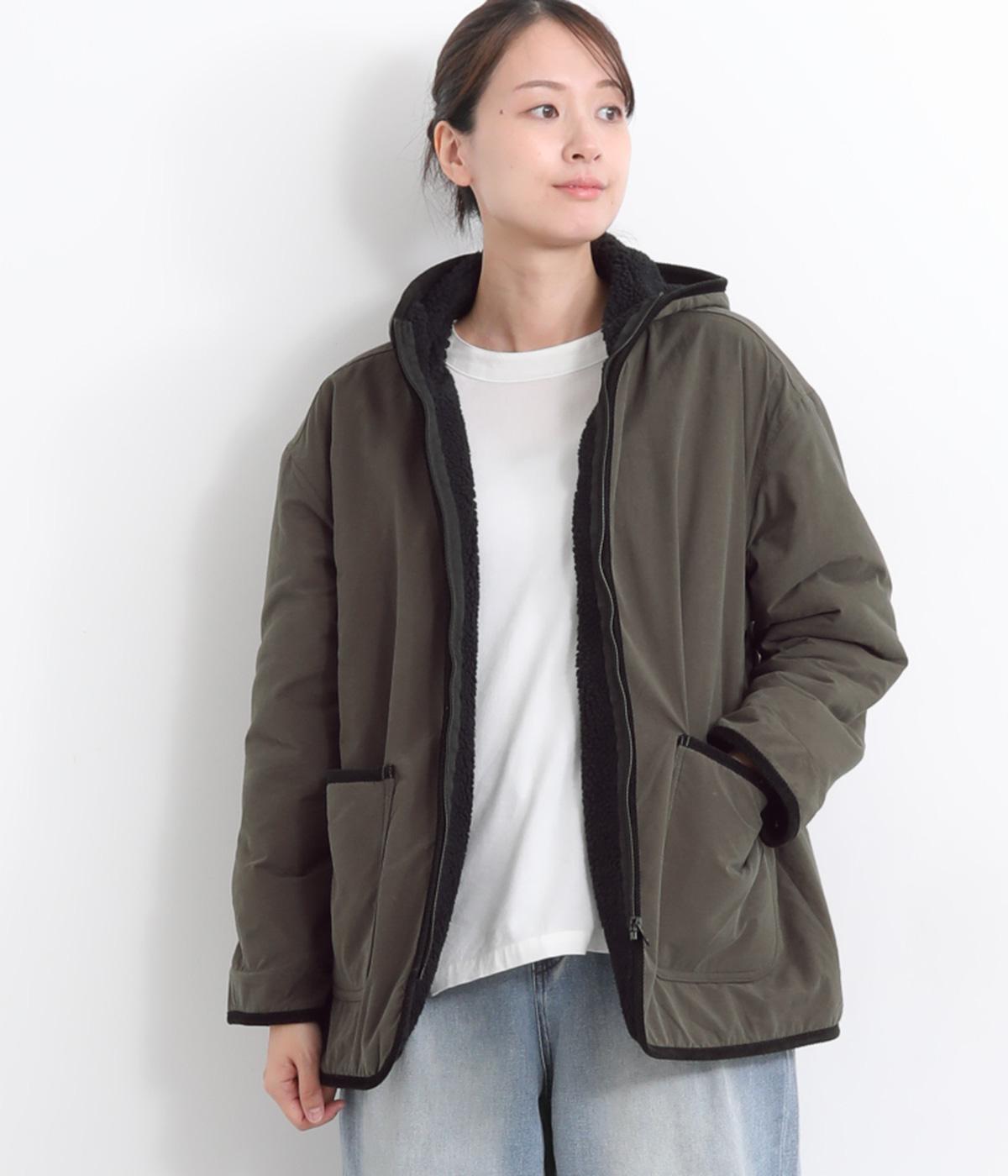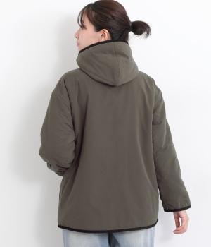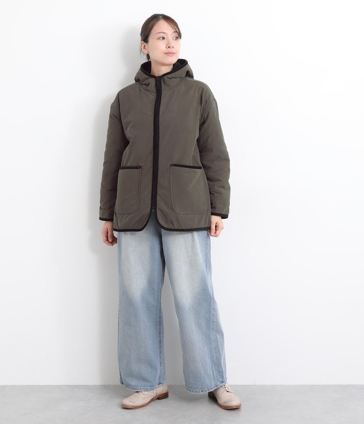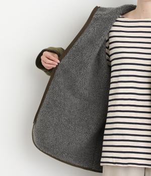 フードつきに異素材パイピングでカジュアルテイストに仕立てたハーフジャケット。前をあければ裏面のボアがのぞいてお洒落ポイントにもなります。ポケット裏もボアで手をあたためてくれます。