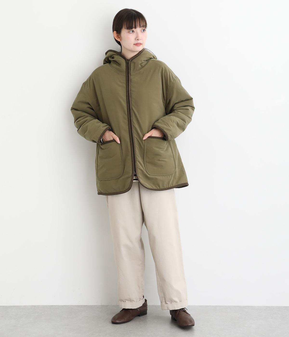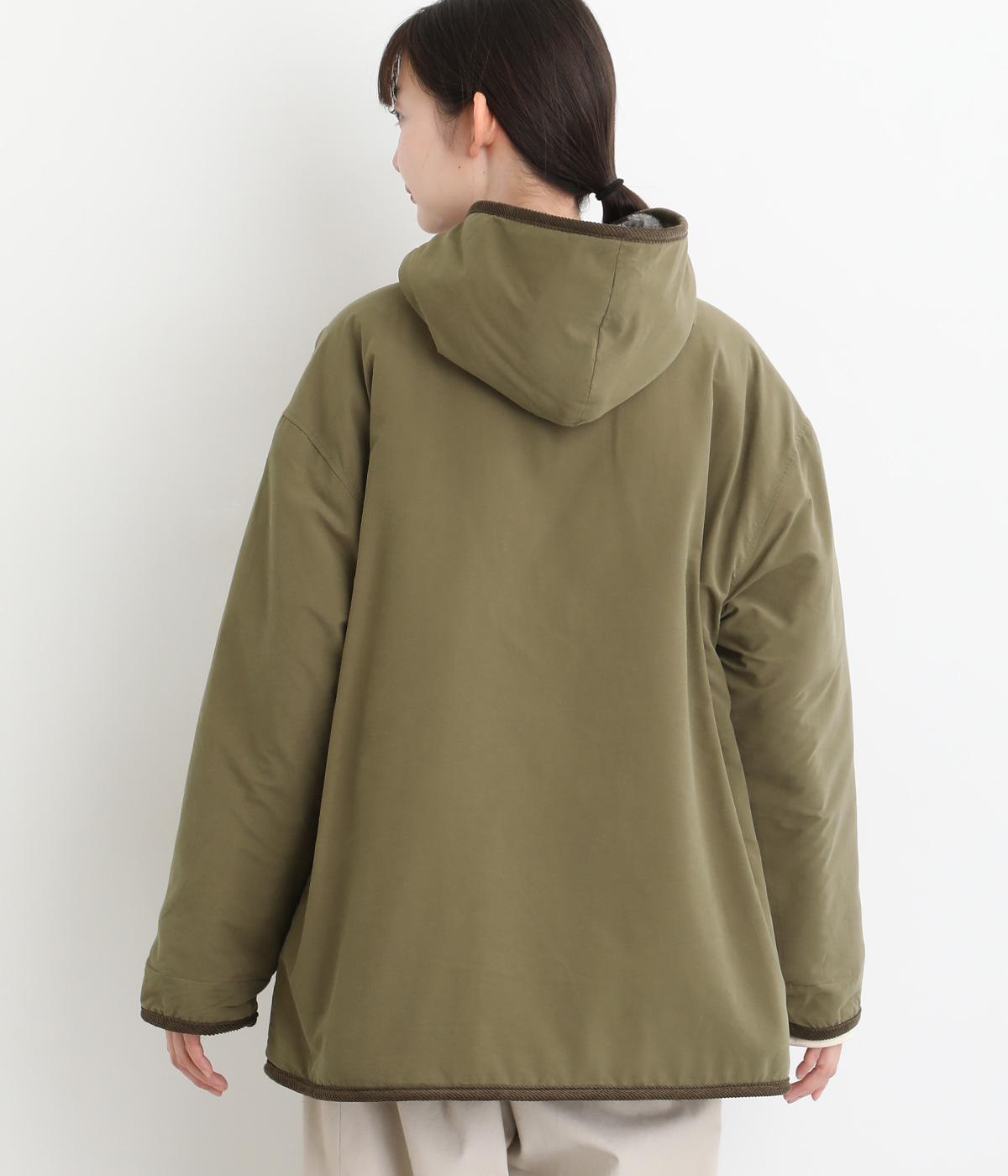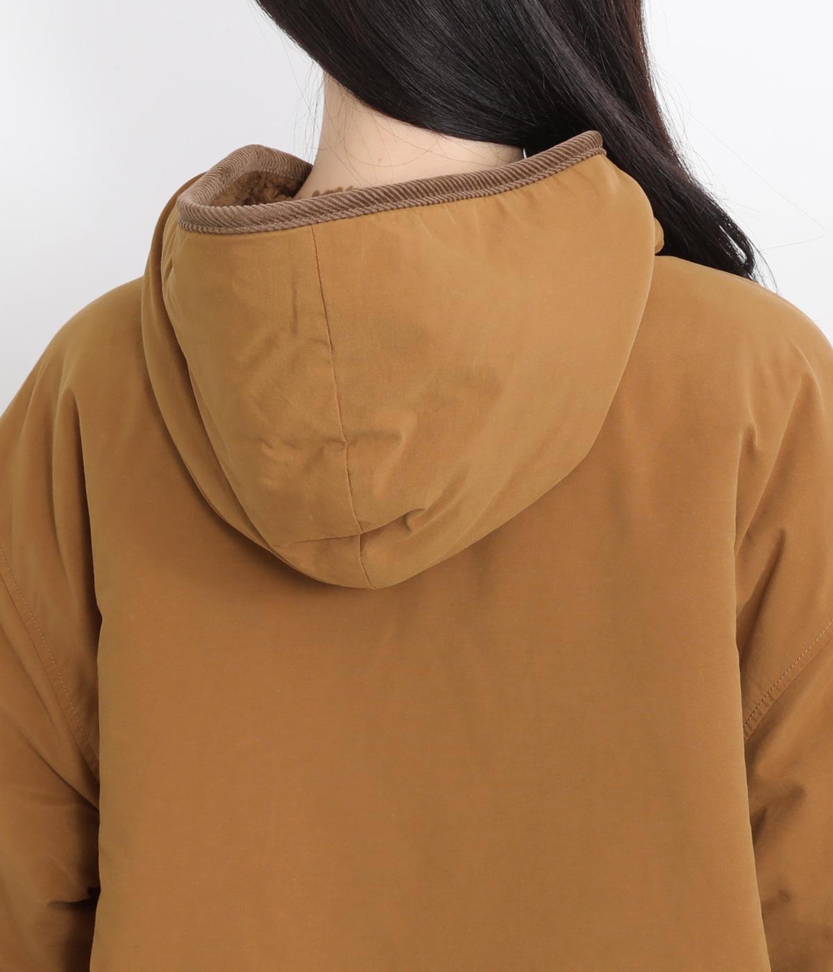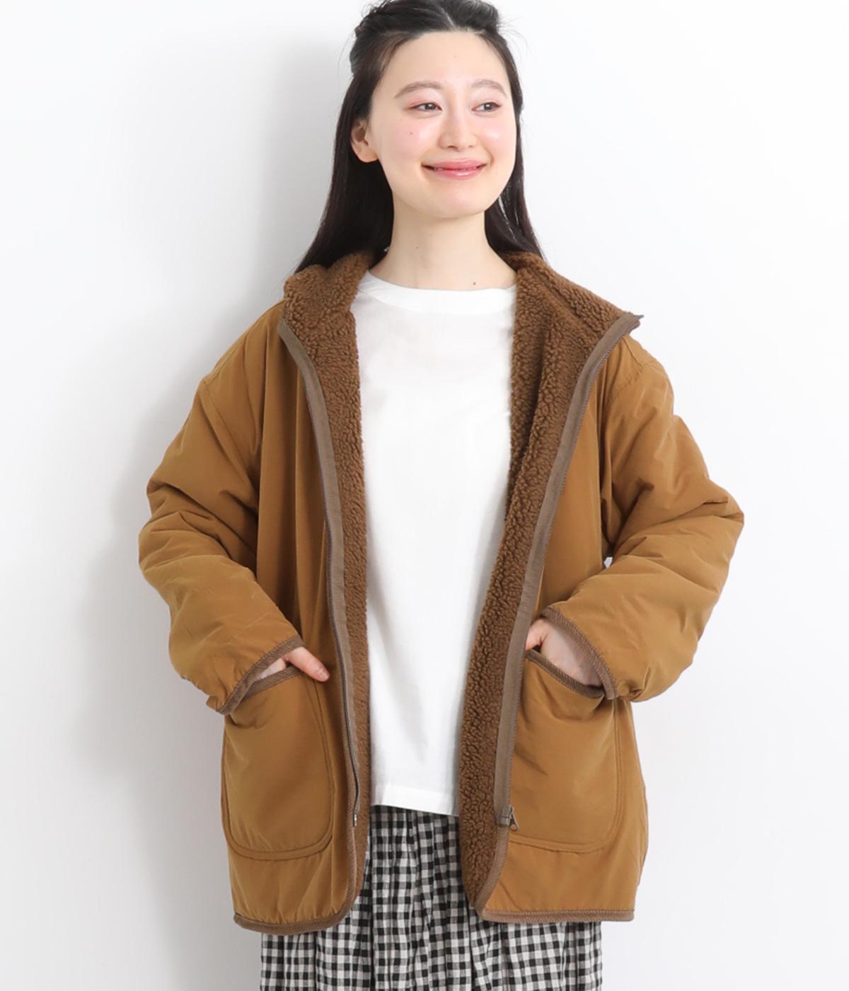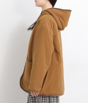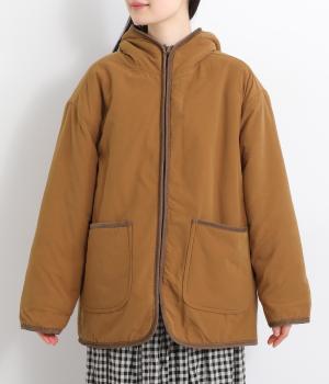 フードつきに異素材パイピングでカジュアルテイストに仕立てたハーフジャケット。前をあければ裏面のボアがのぞいてお洒落ポイントにもなります。ポケット裏もボアで手をあたためてくれます。