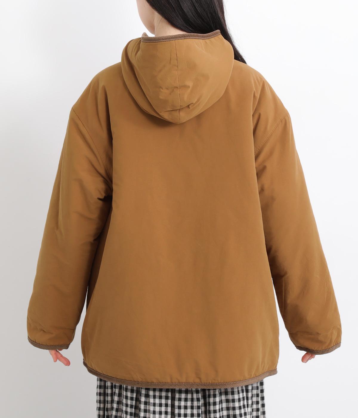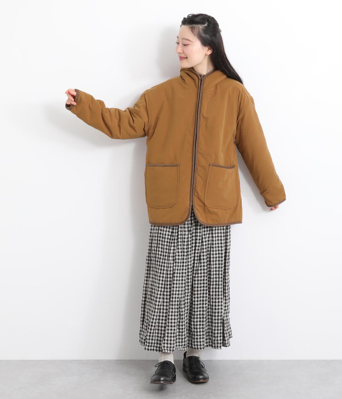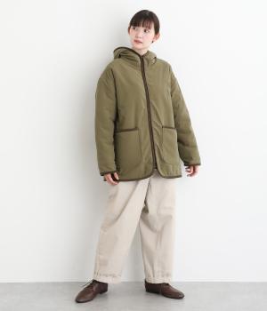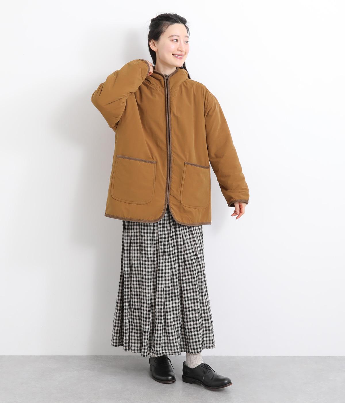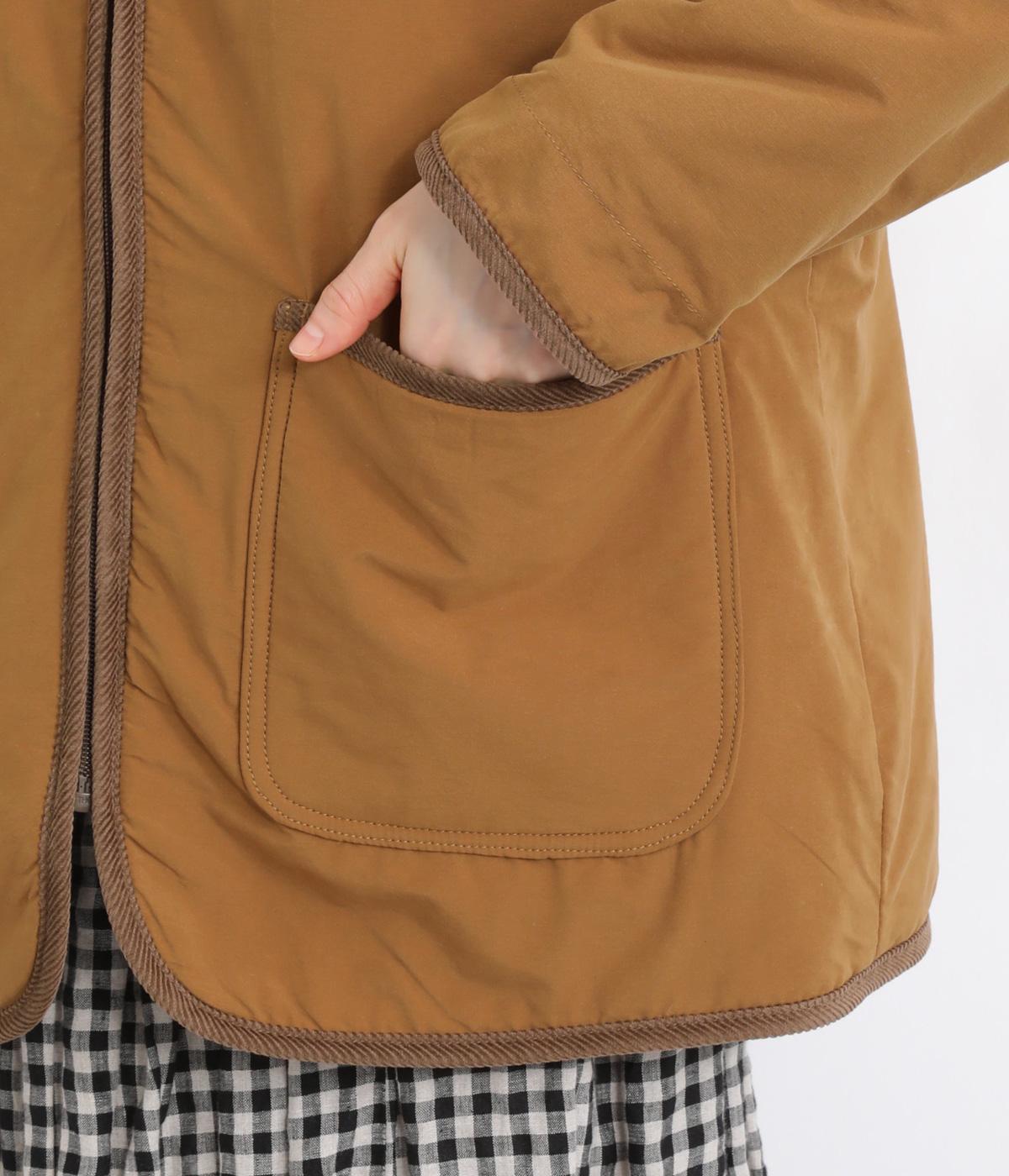 フードつきに異素材パイピングでカジュアルテイストに仕立てたハーフジャケット。前をあければ裏面のボアがのぞいてお洒落ポイントにもなります。ポケット裏もボアで手をあたためてくれます。