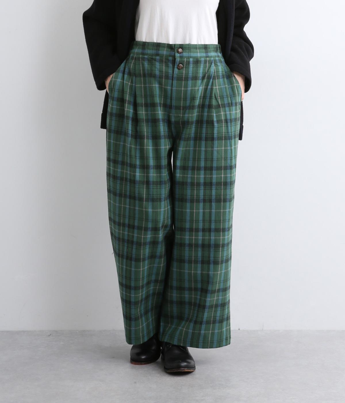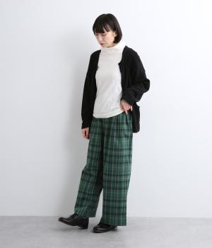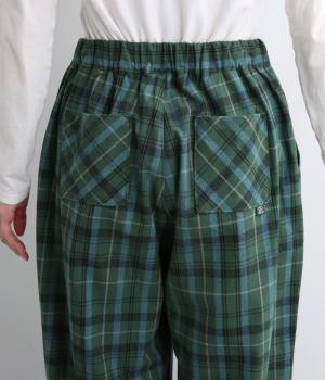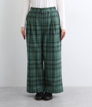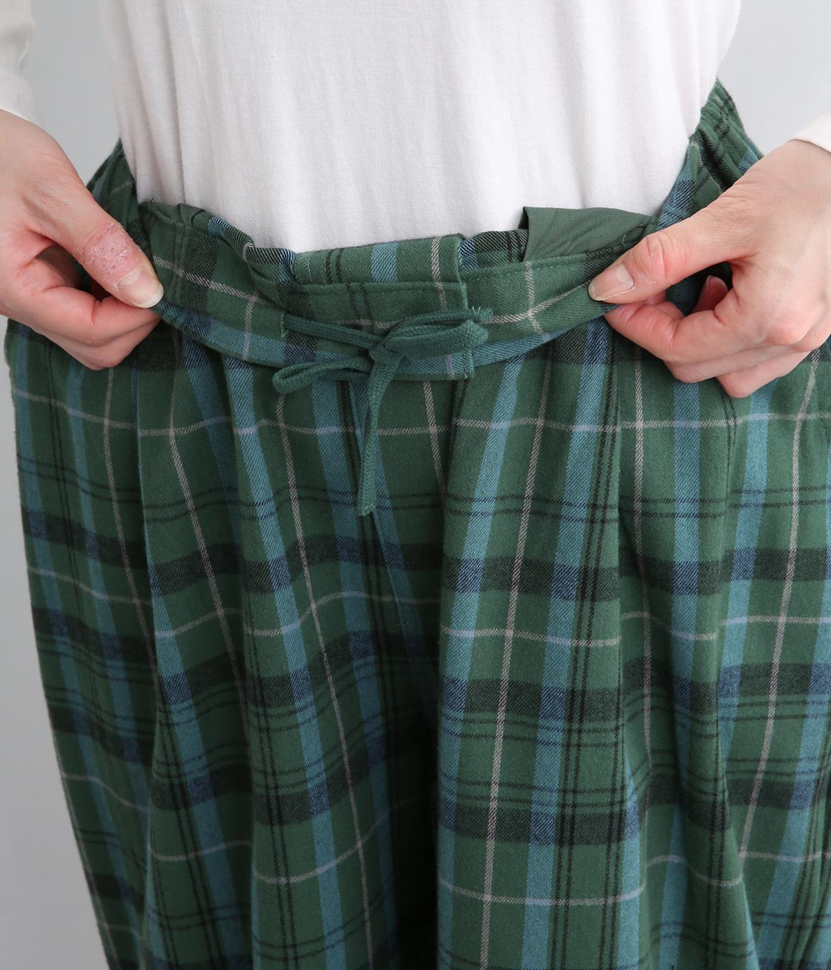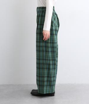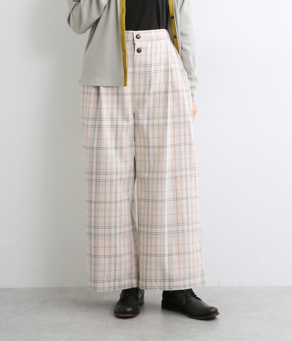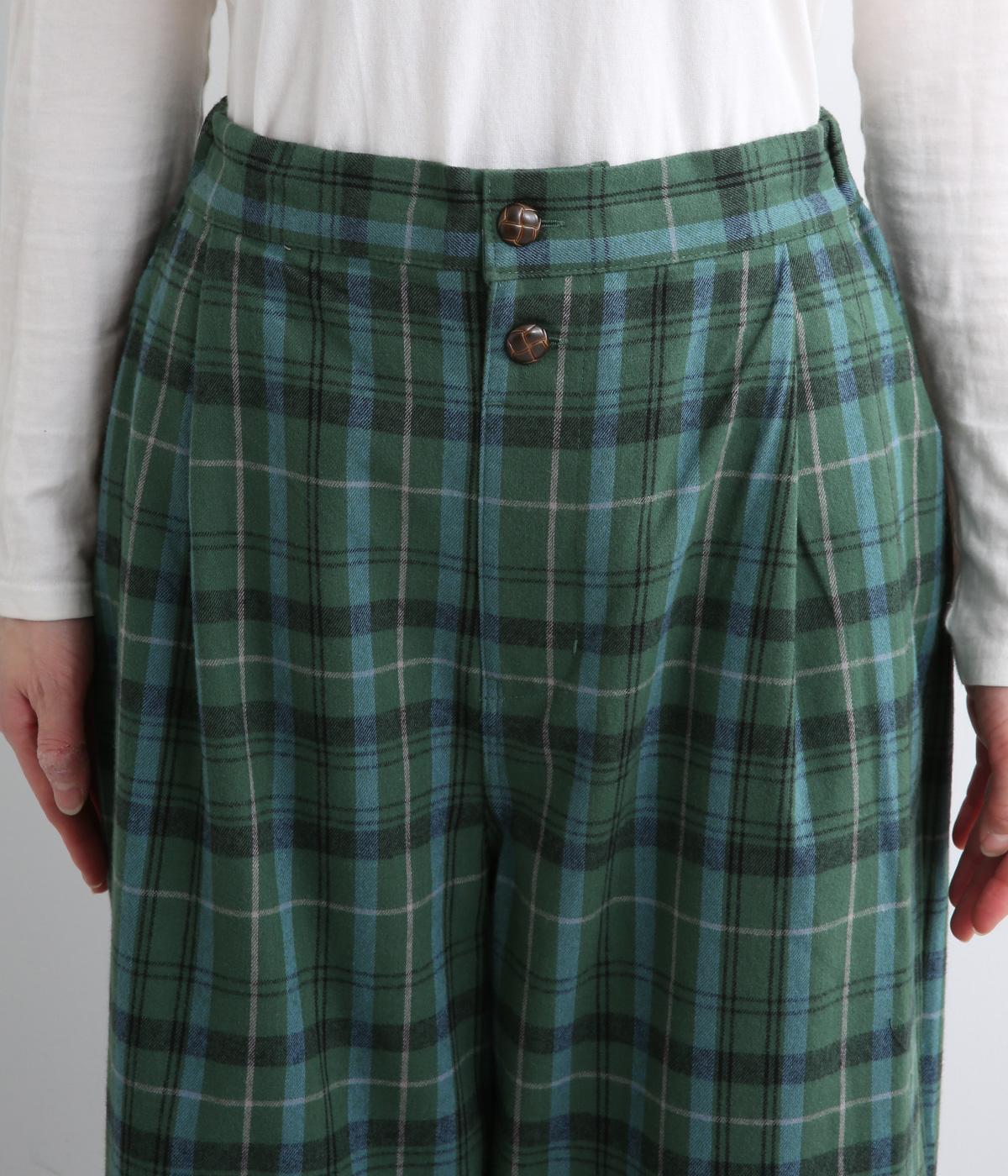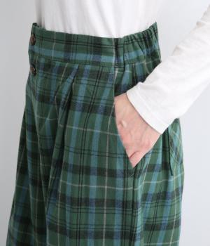 先染めのチェック柄を使用し、落ち着きのあるクラシックな雰囲気に仕上げました。ウエストのフロントタックが立体感を生み、リラクシーなはき心地ながらもシルエットをすっきりと見せてくれます。二つ並んだボタンがアクセントとなり、トップスをインしてもきれいに決まるのがうれしいポイント。