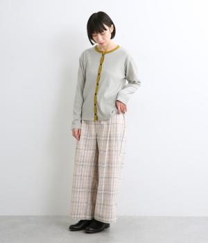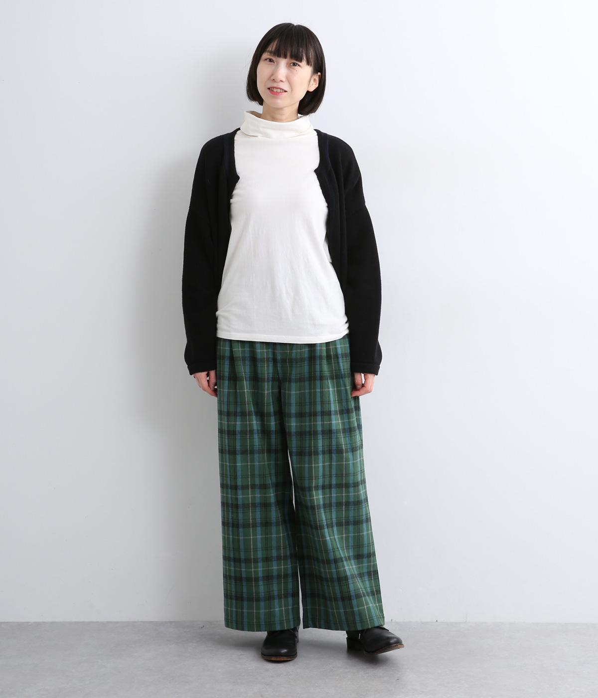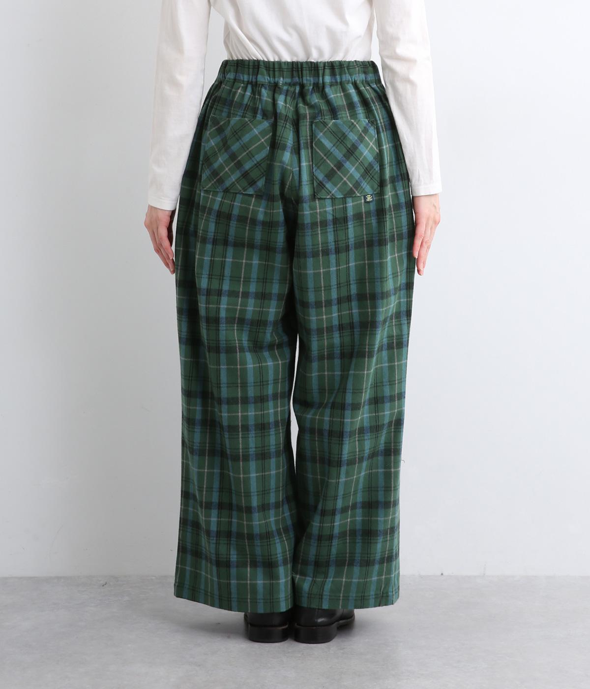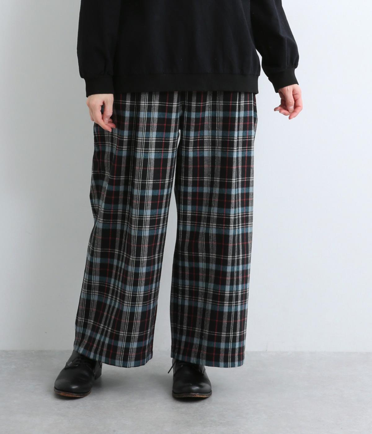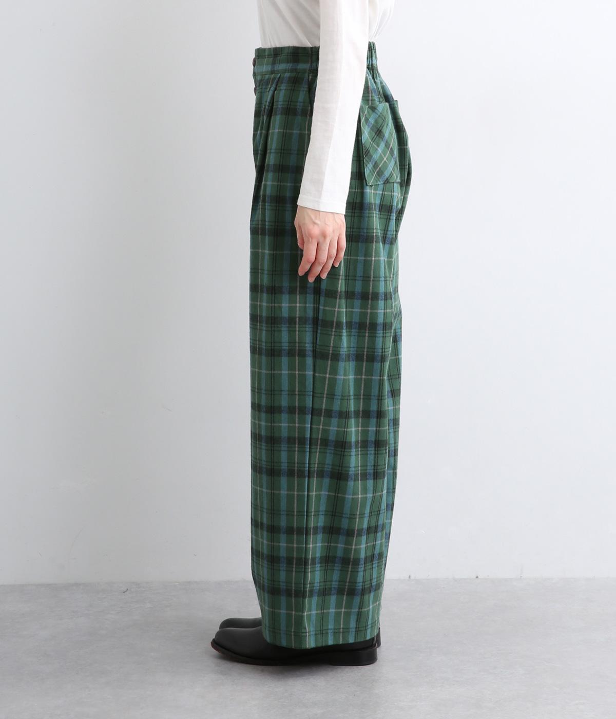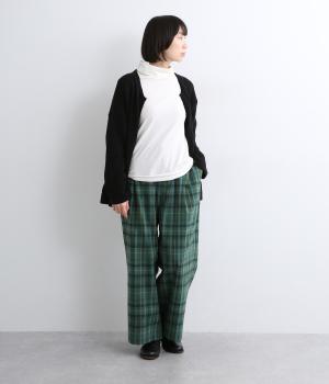 先染めのチェック柄を使用し、落ち着きのあるクラシックな雰囲気に仕上げました。ウエストのフロントタックが立体感を生み、リラクシーなはき心地ながらもシルエットをすっきりと見せてくれます。二つ並んだボタンがアクセントとなり、トップスをインしてもきれいに決まるのがうれしいポイント。
