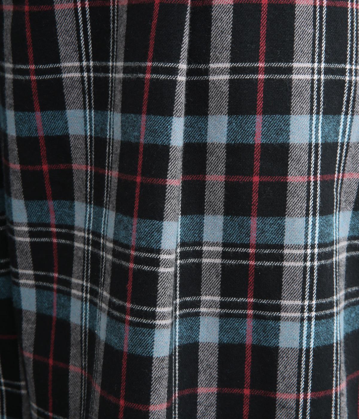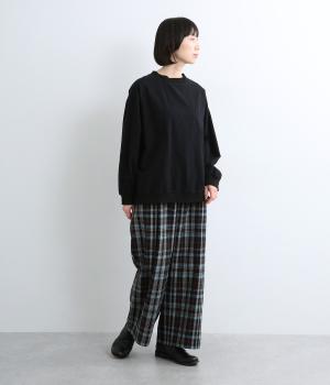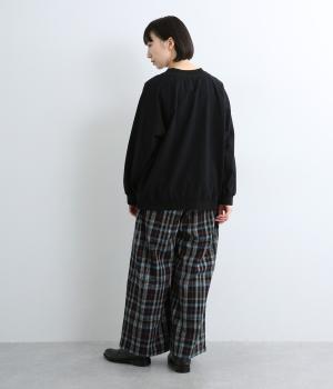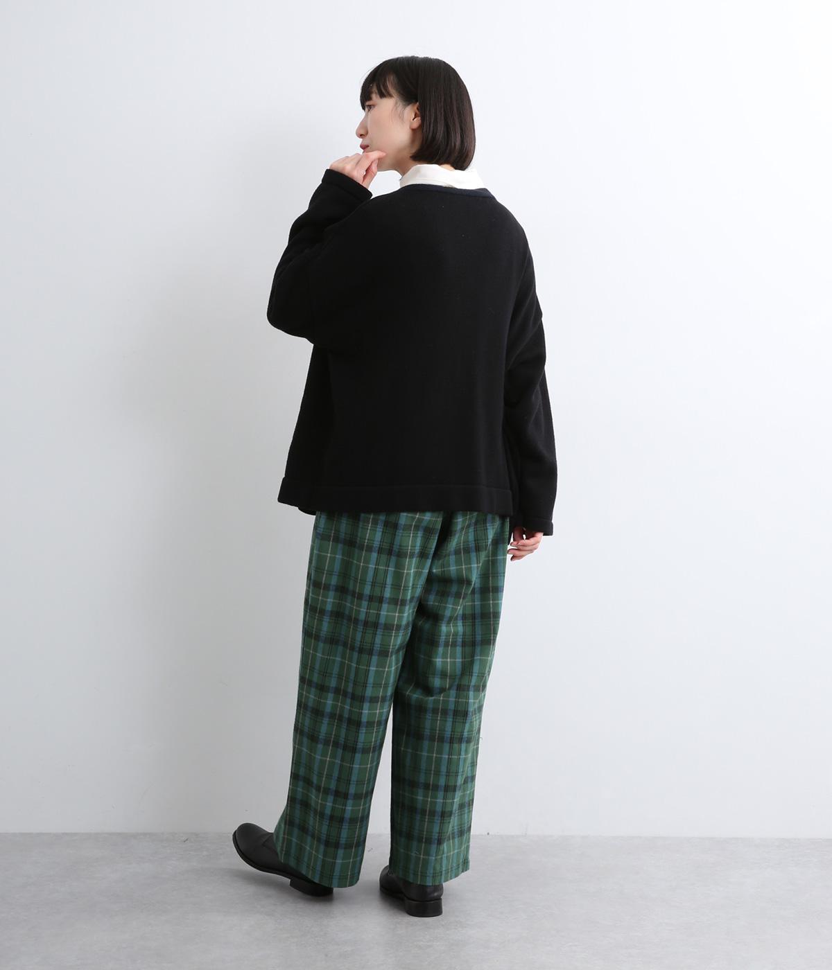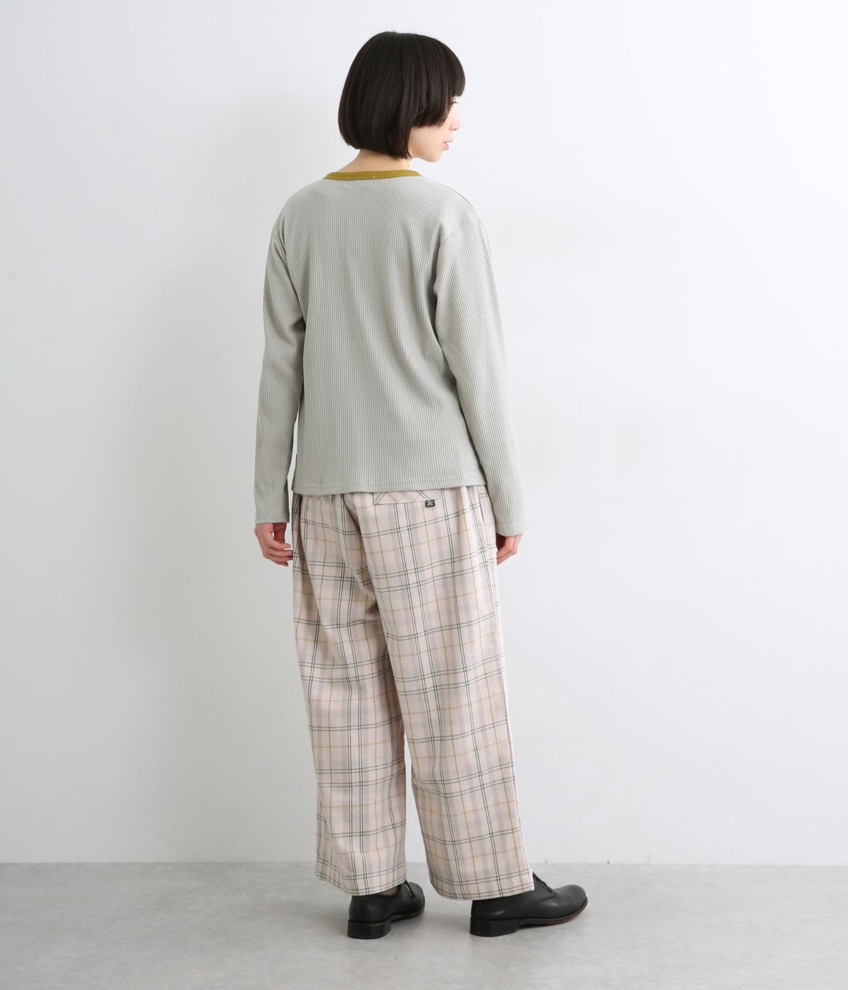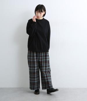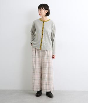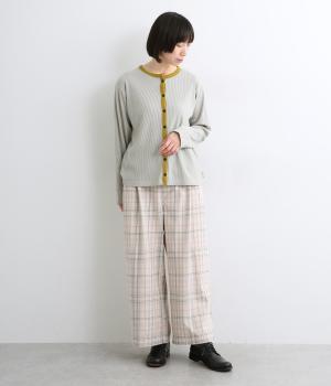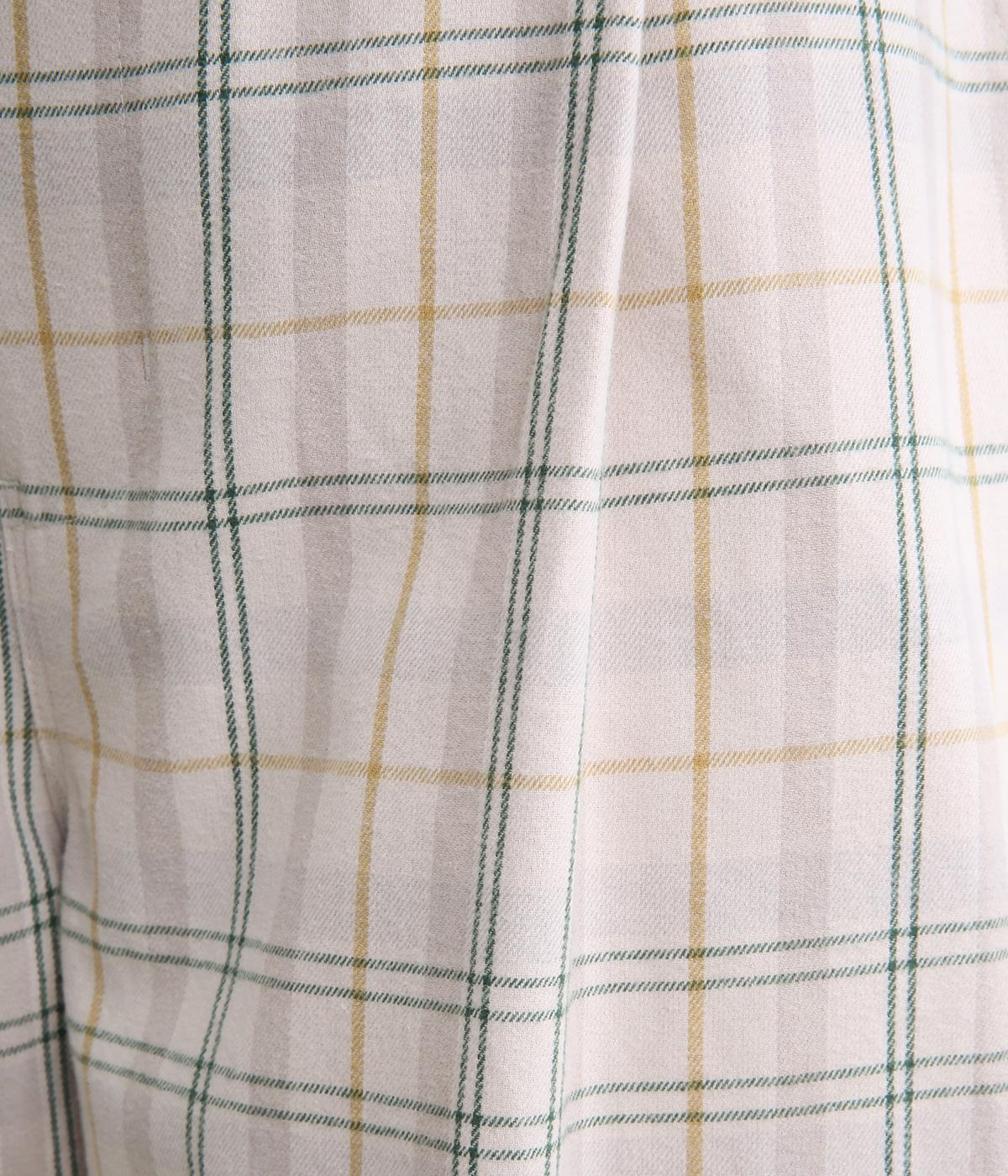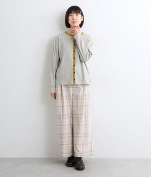 先染めのチェック柄を使用し、落ち着きのあるクラシックな雰囲気に仕上げました。ウエストのフロントタックが立体感を生み、リラクシーなはき心地ながらもシルエットをすっきりと見せてくれます。二つ並んだボタンがアクセントとなり、トップスをインしてもきれいに決まるのがうれしいポイント。
