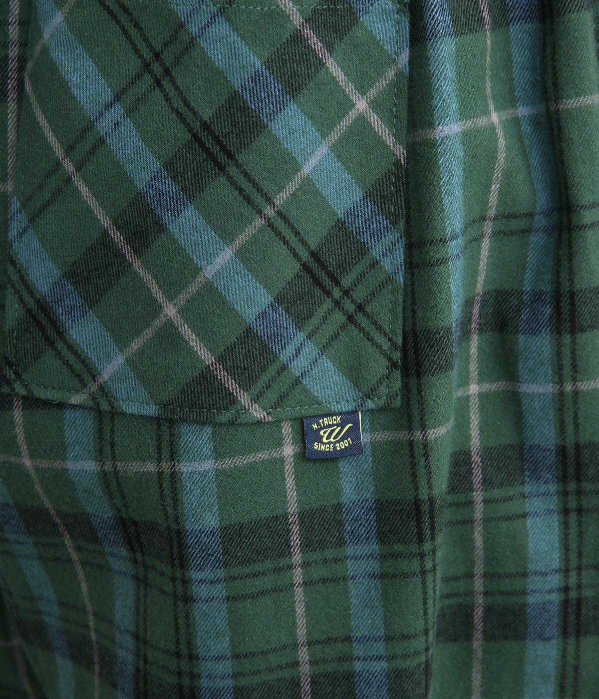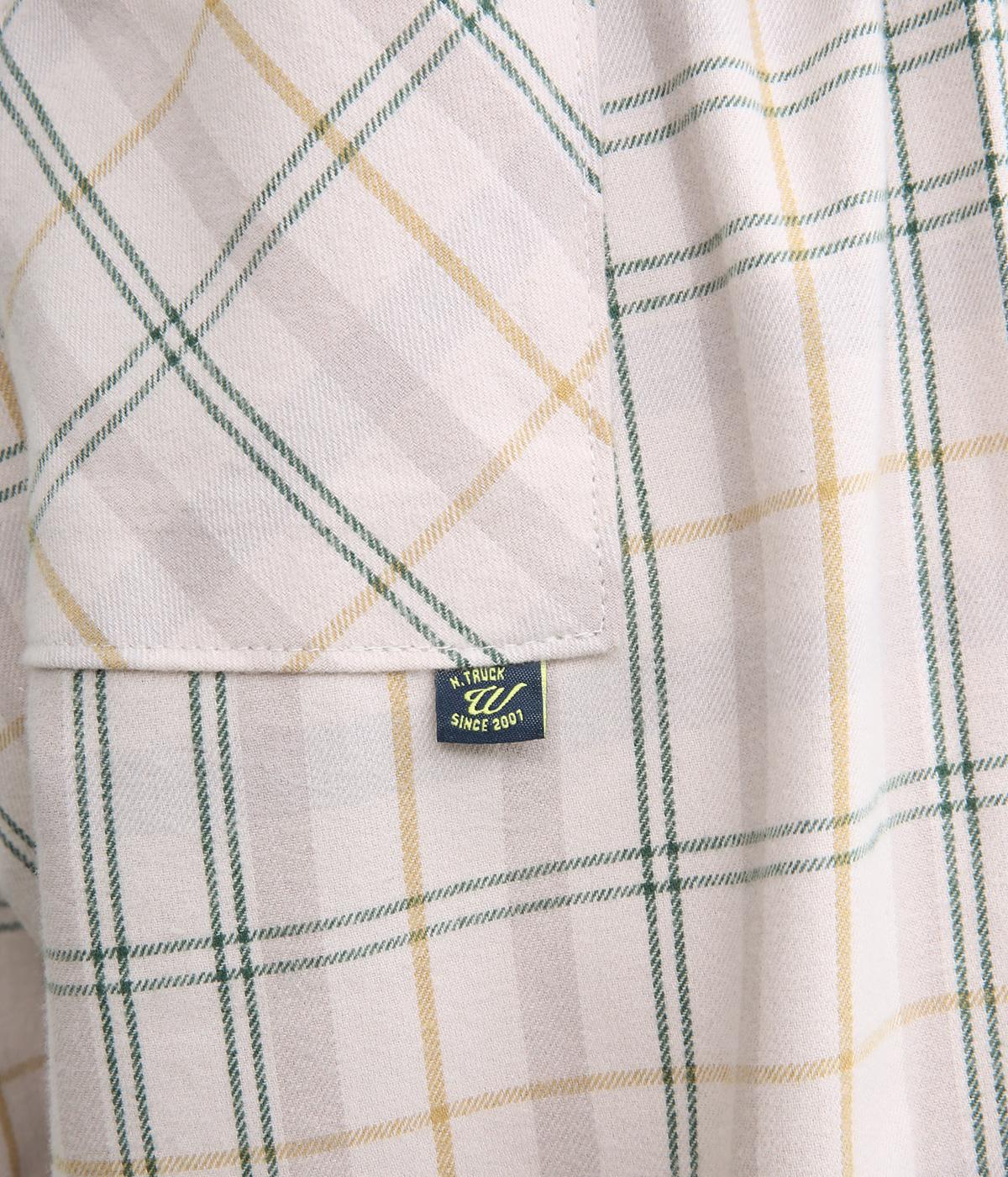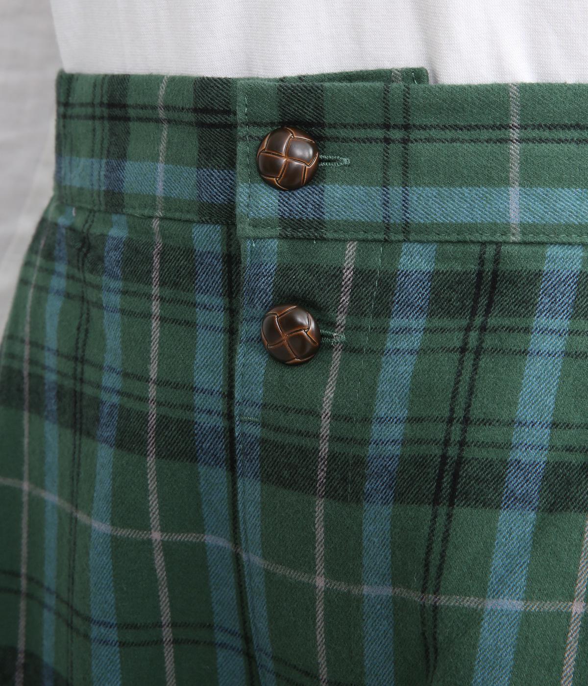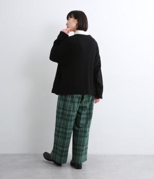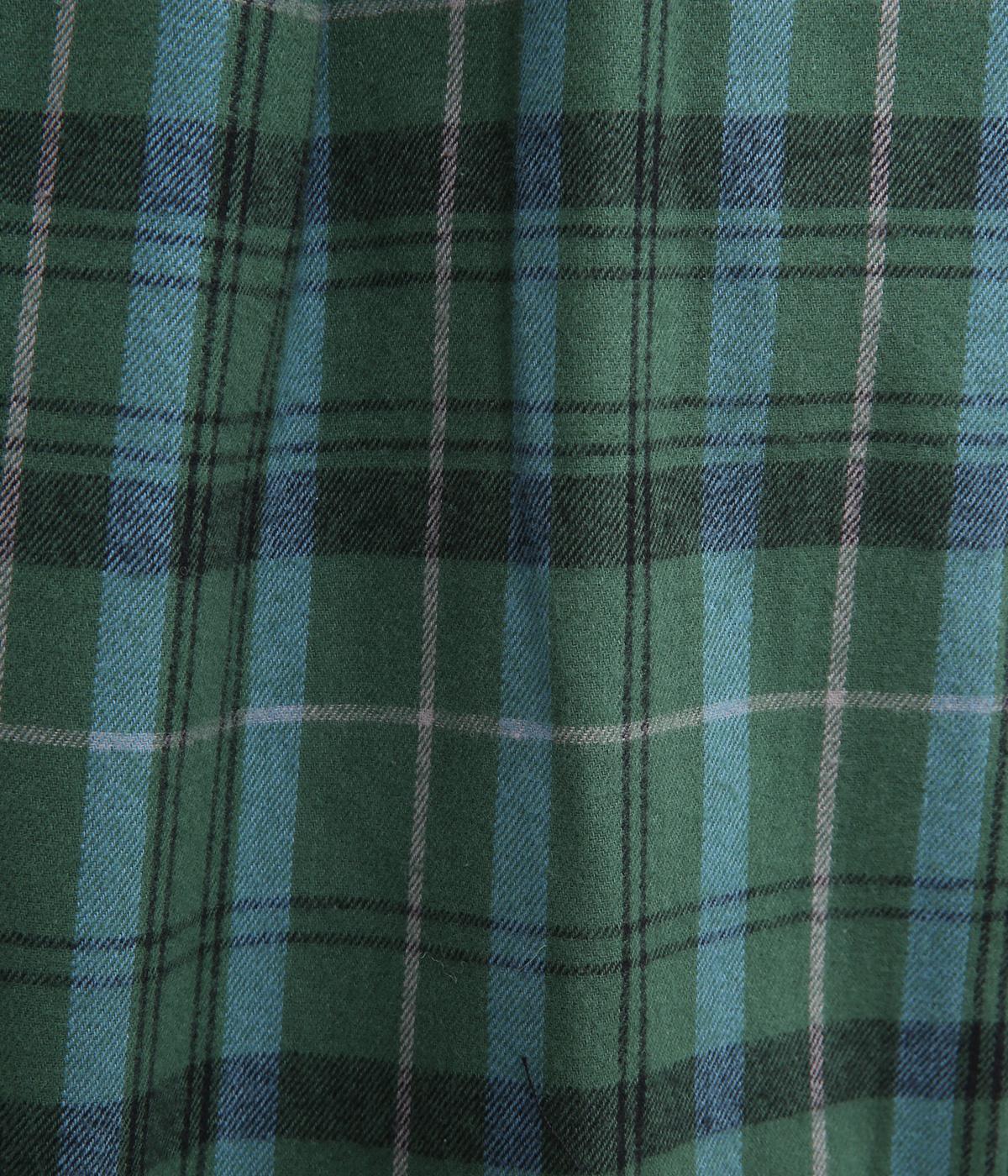 先染めのチェック柄を使用し、落ち着きのあるクラシックな雰囲気に仕上げました。ウエストのフロントタックが立体感を生み、リラクシーなはき心地ながらもシルエットをすっきりと見せてくれます。二つ並んだボタンがアクセントとなり、トップスをインしてもきれいに決まるのがうれしいポイント。