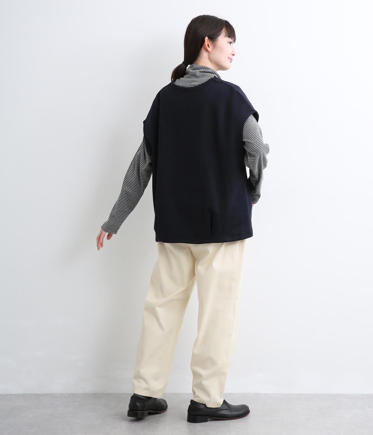 デイリー使いに最適な素材感とシルエットです。縦に走る切り替えがきれいなラインを後押しします。ウエストはボタンとファスナー仕様で、うしろにゴムをほどこして安心感ある穿き心地です。