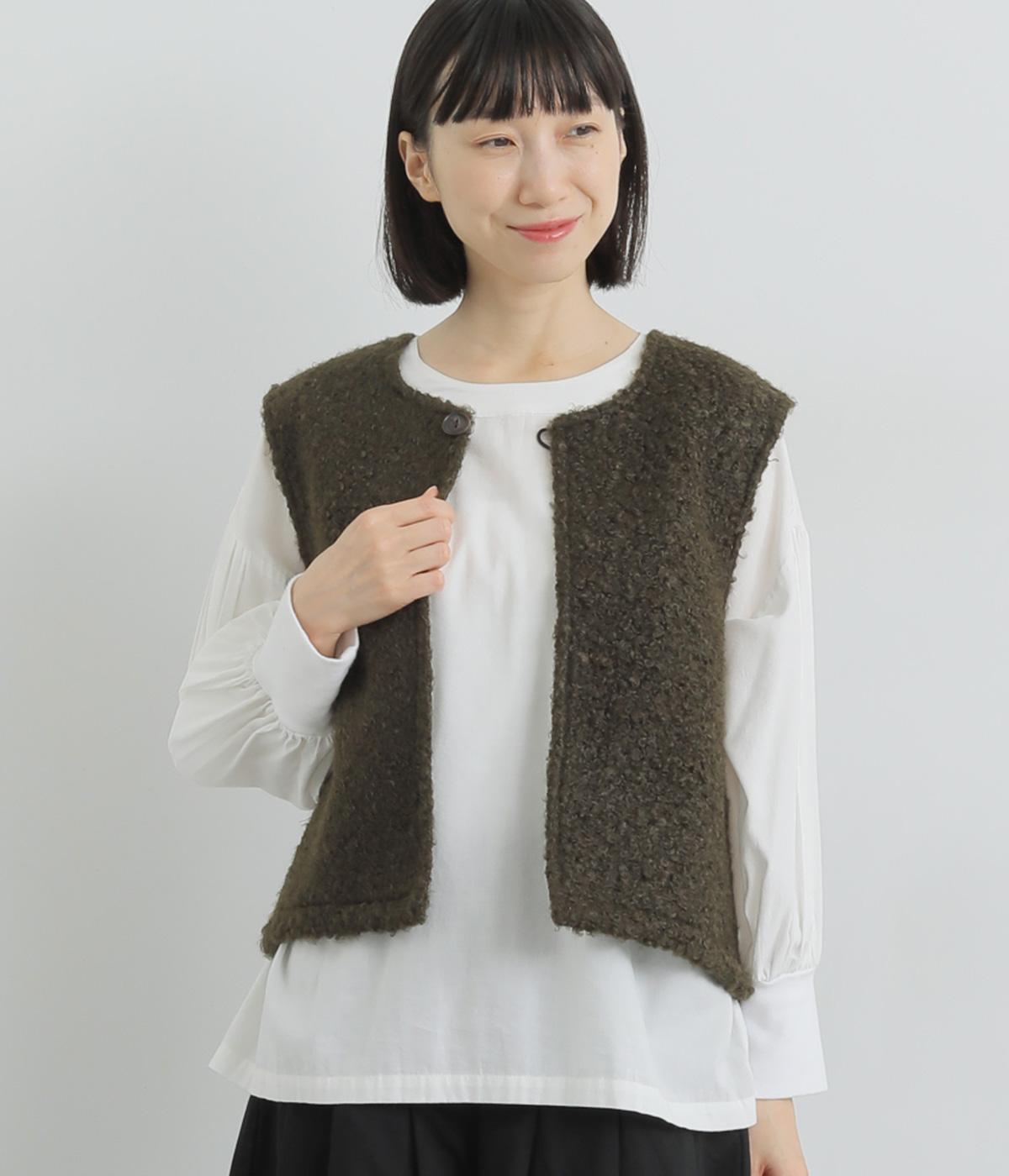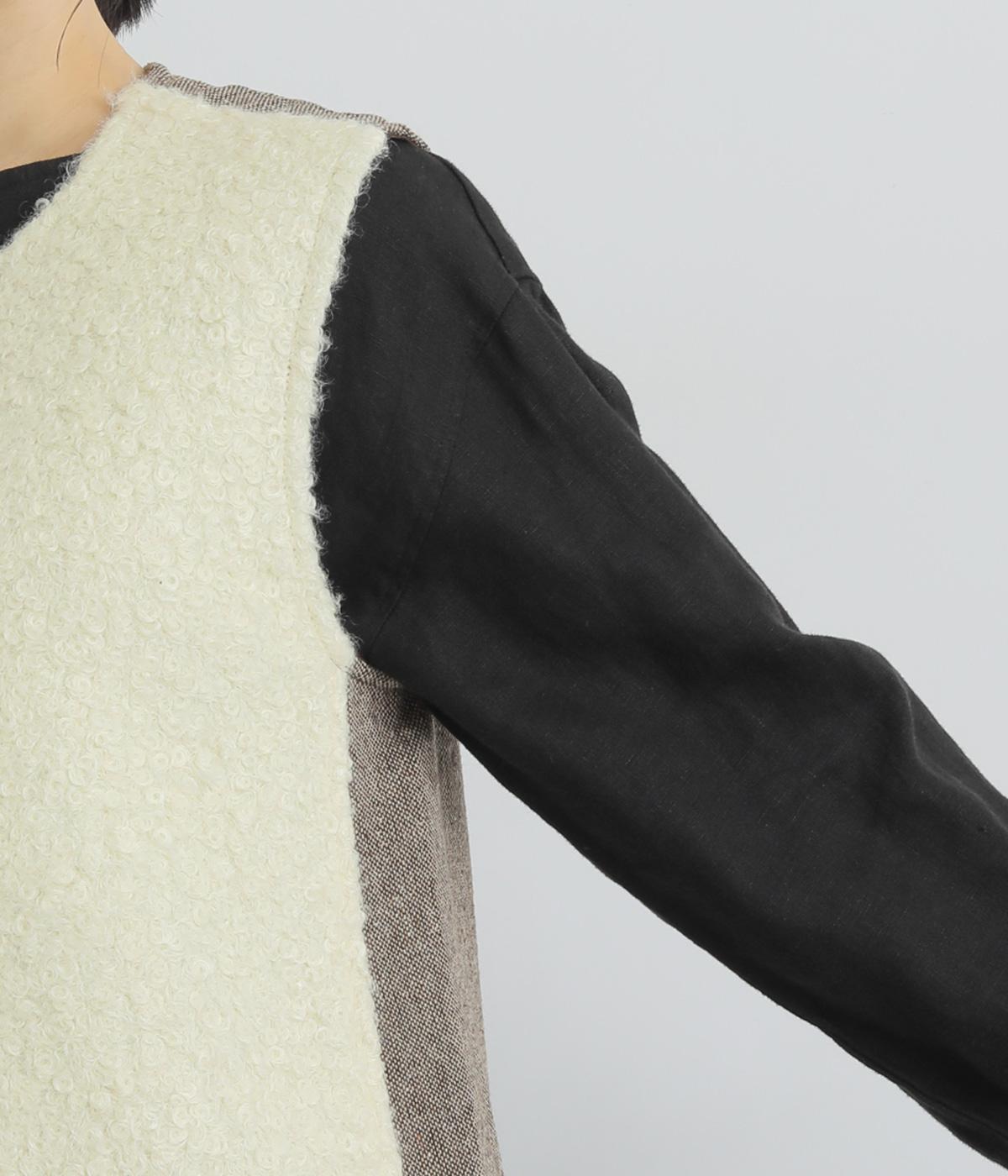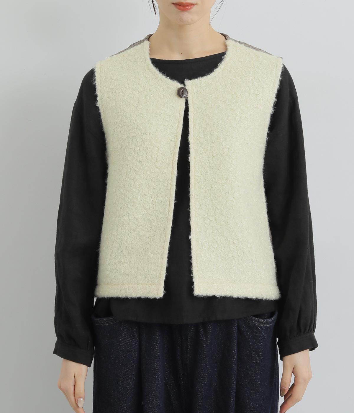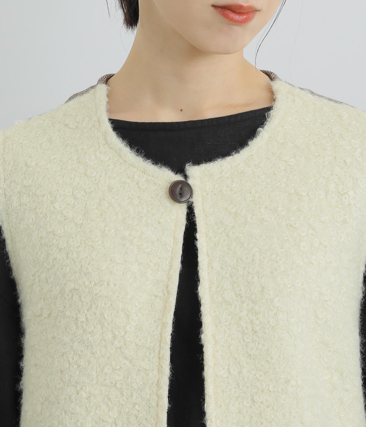 くるくるとカールした愛らしいボアが印象的なベスト。後ろにはツイード生地を使用し、ボリュームをおさえつつ表情豊かに仕上げました。前立てのひとつボタンがさりげないアクセントに。軽い着心地でレイヤードしやすく、普段のコーディネートに温もりと華やかさを添えてくれます。