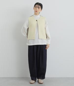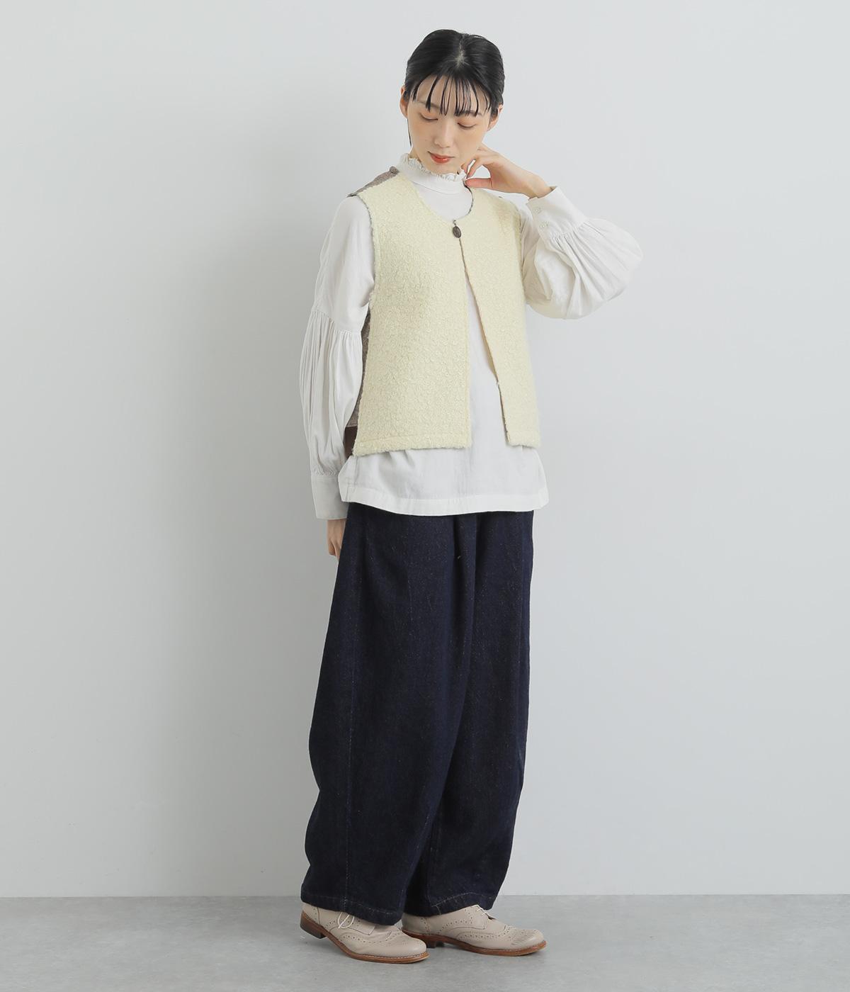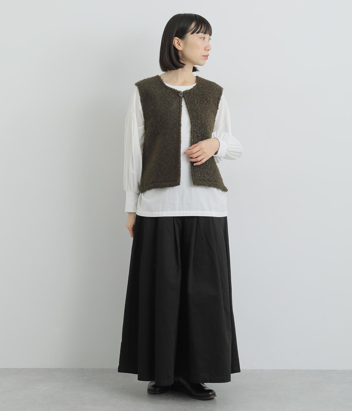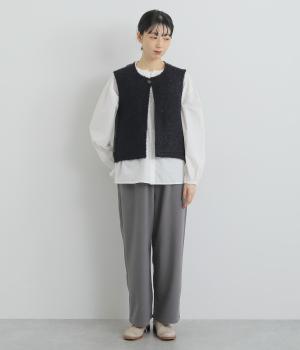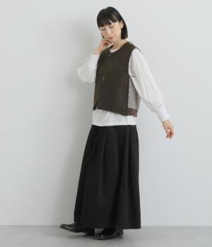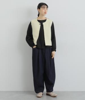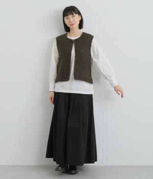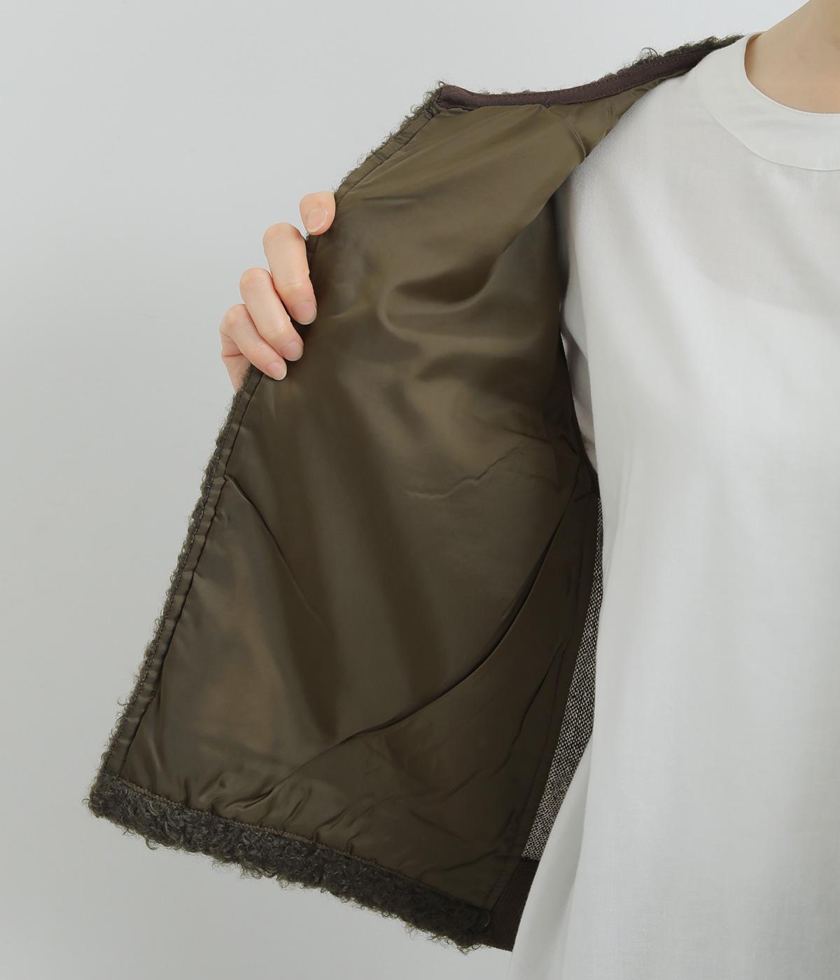 くるくるとカールした愛らしいボアが印象的なベスト。後ろにはツイード生地を使用し、ボリュームをおさえつつ表情豊かに仕上げました。前立てのひとつボタンがさりげないアクセントに。軽い着心地でレイヤードしやすく、普段のコーディネートに温もりと華やかさを添えてくれます。