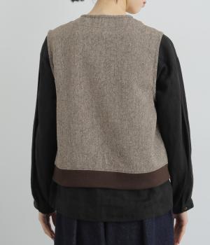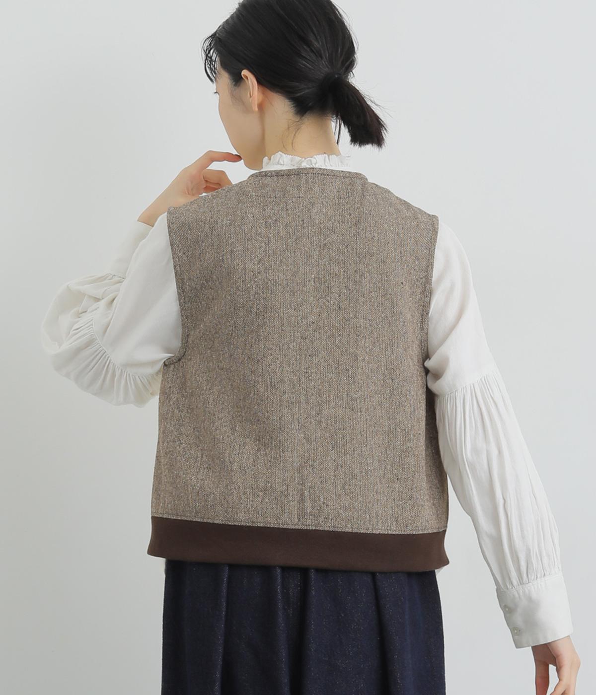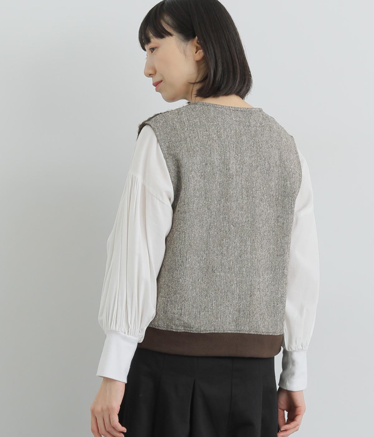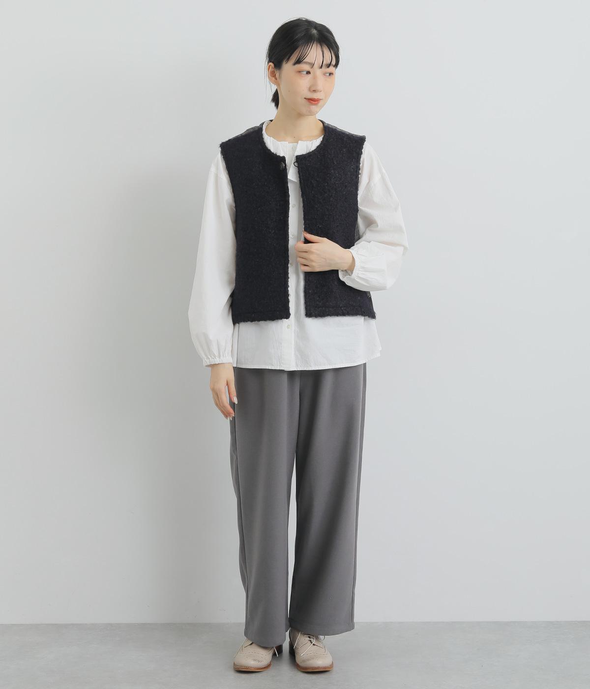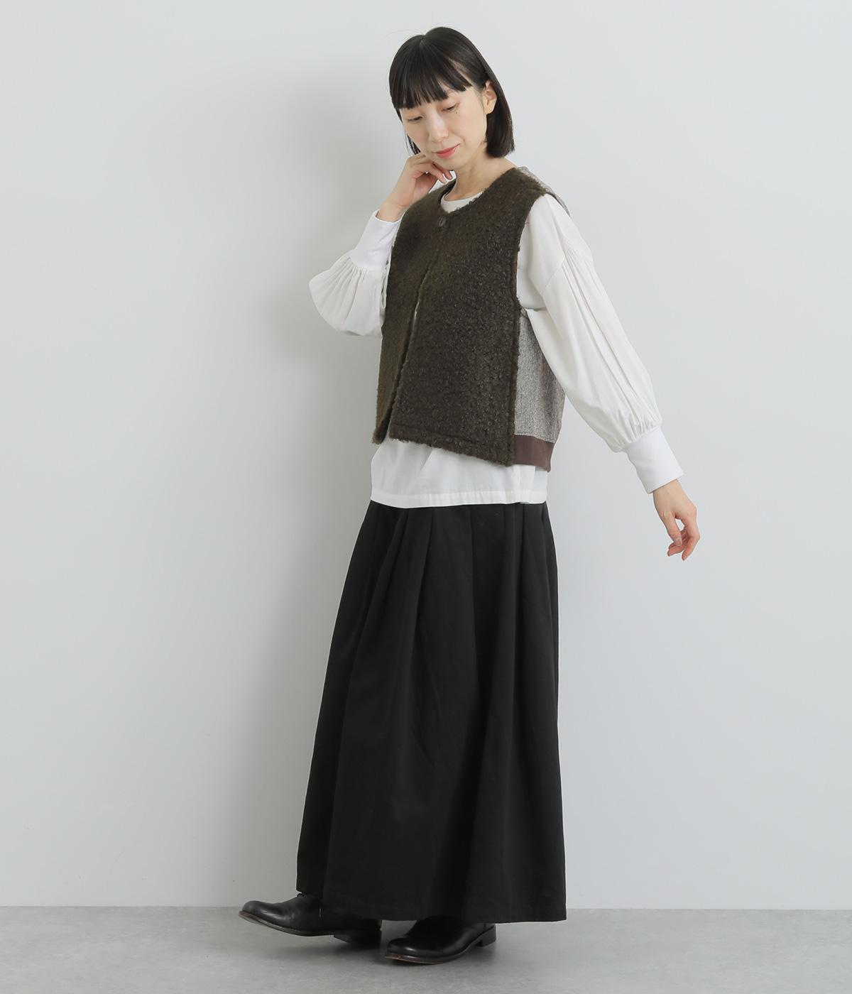 くるくるとカールした愛らしいボアが印象的なベスト。後ろにはツイード生地を使用し、ボリュームをおさえつつ表情豊かに仕上げました。前立てのひとつボタンがさりげないアクセントに。軽い着心地でレイヤードしやすく、普段のコーディネートに温もりと華やかさを添えてくれます。