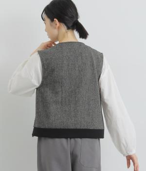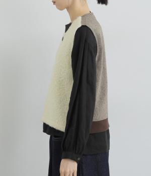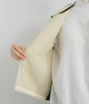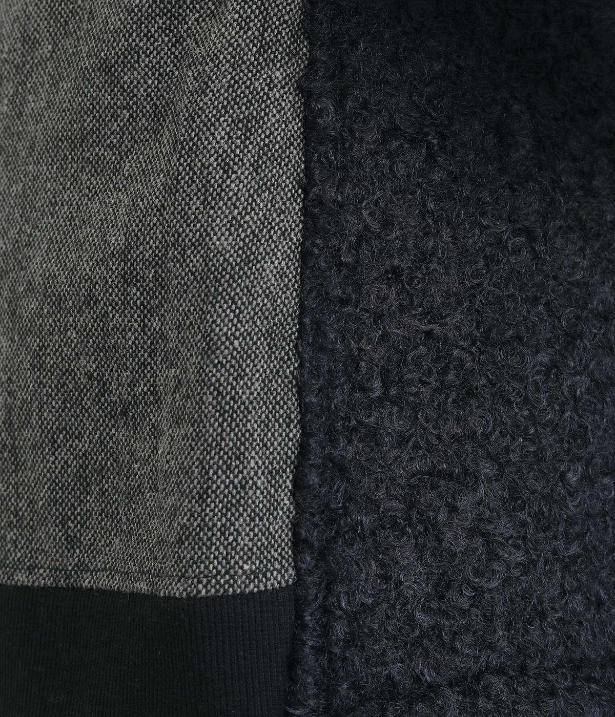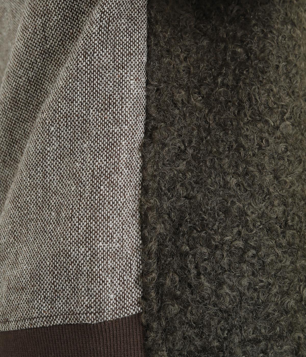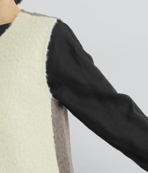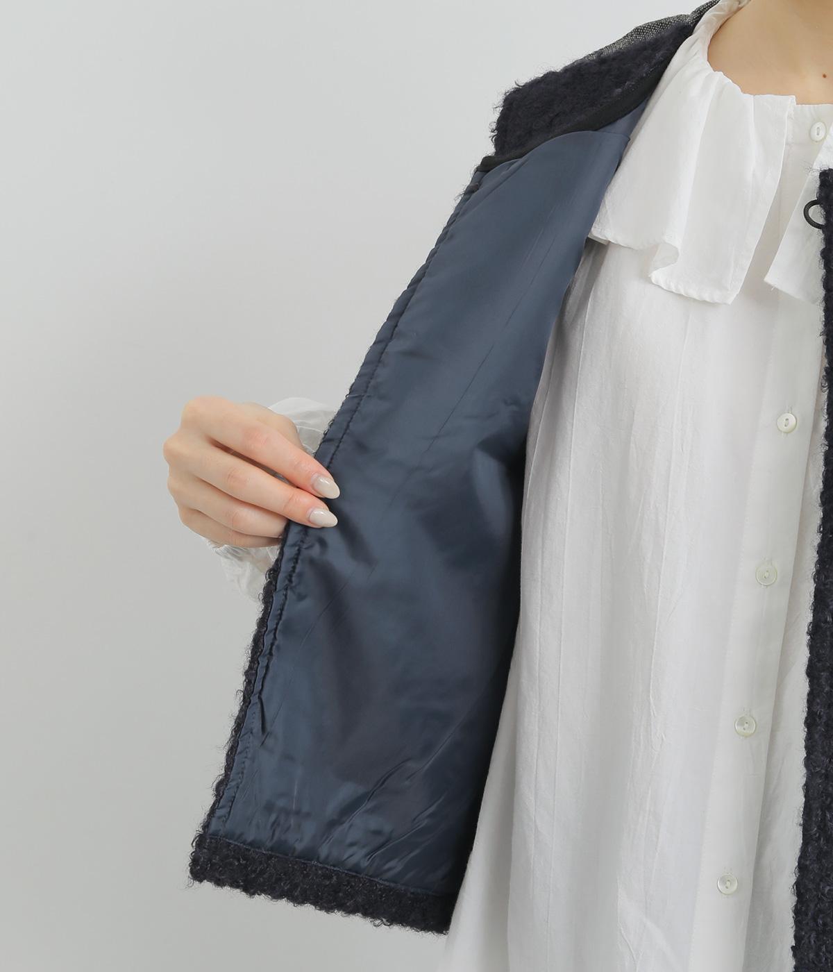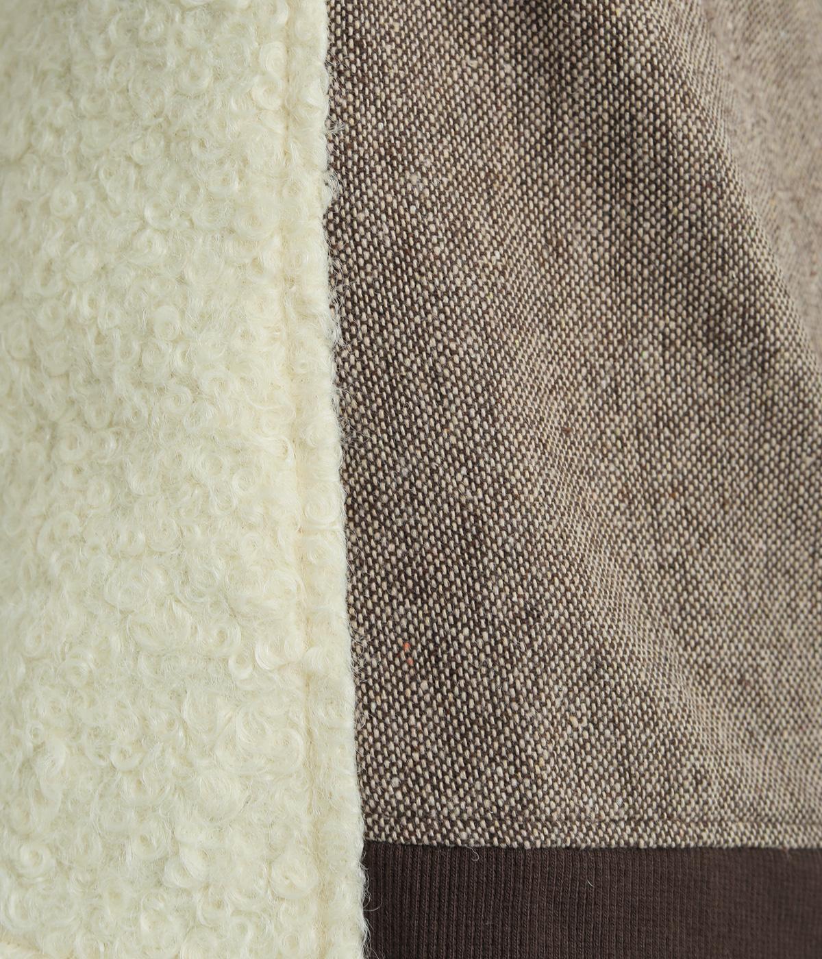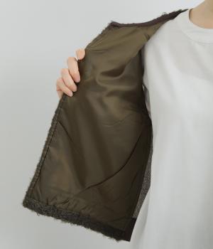 前身頃にはふんわりとしたあたたかみのあるボア素材を、後ろ身頃には上品なツイード布帛生地を使用しています。ボアの裏には滑りのよい裏地をつけました。