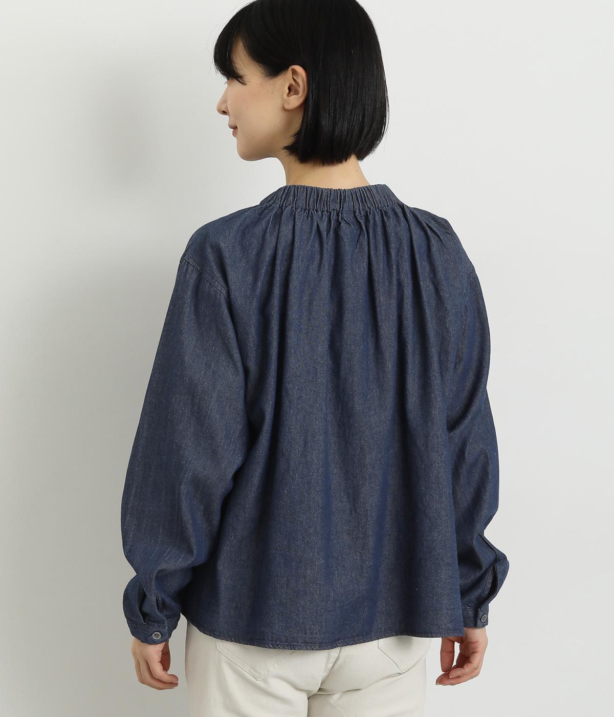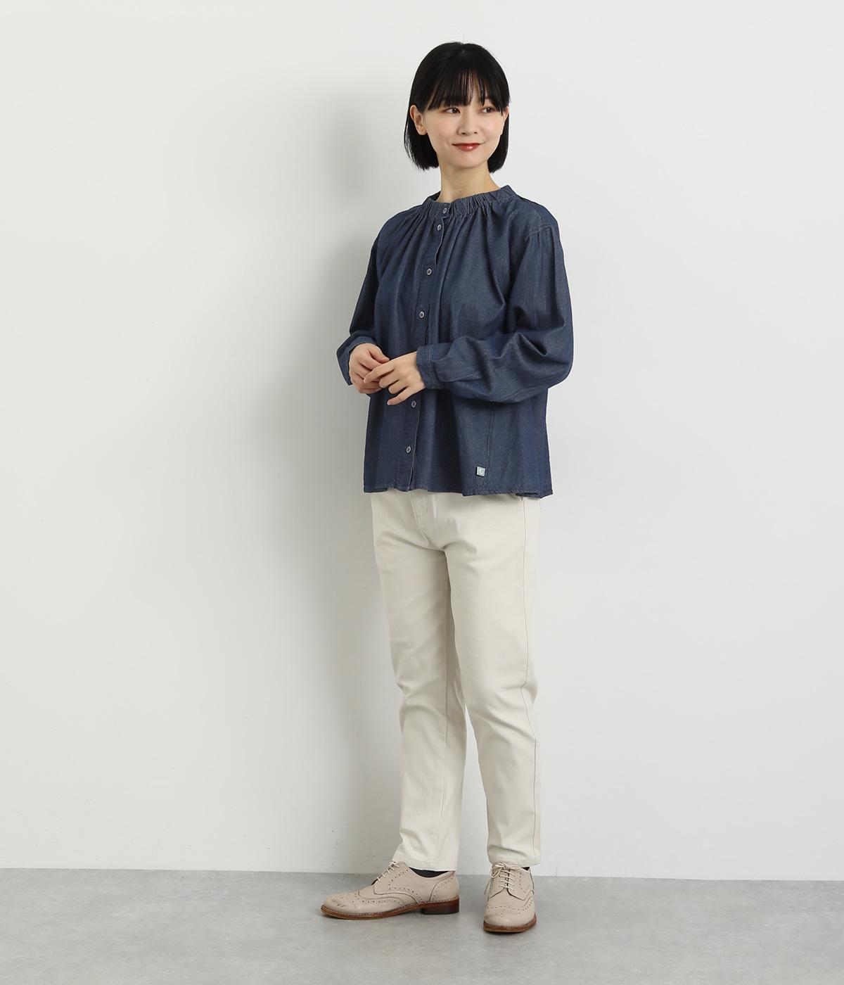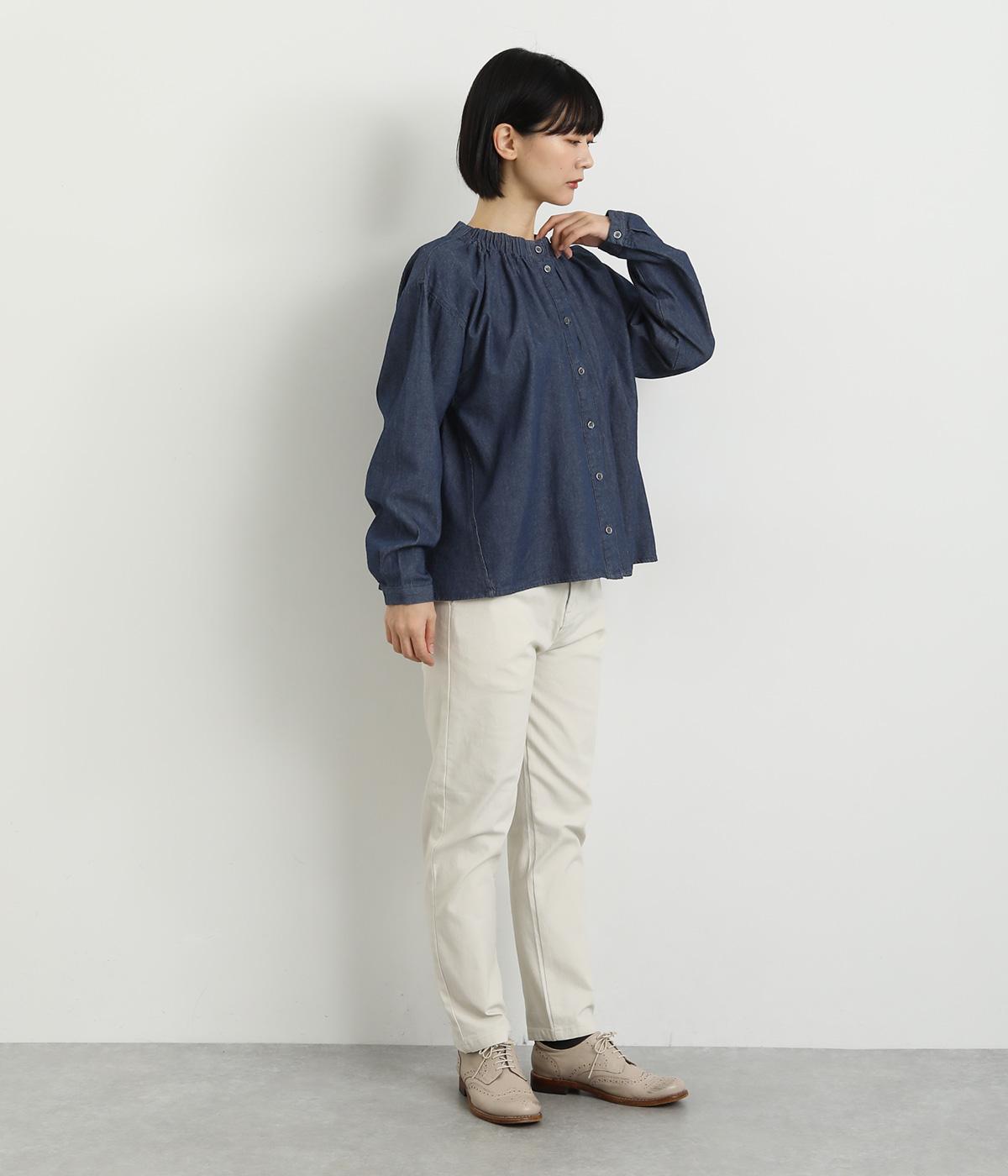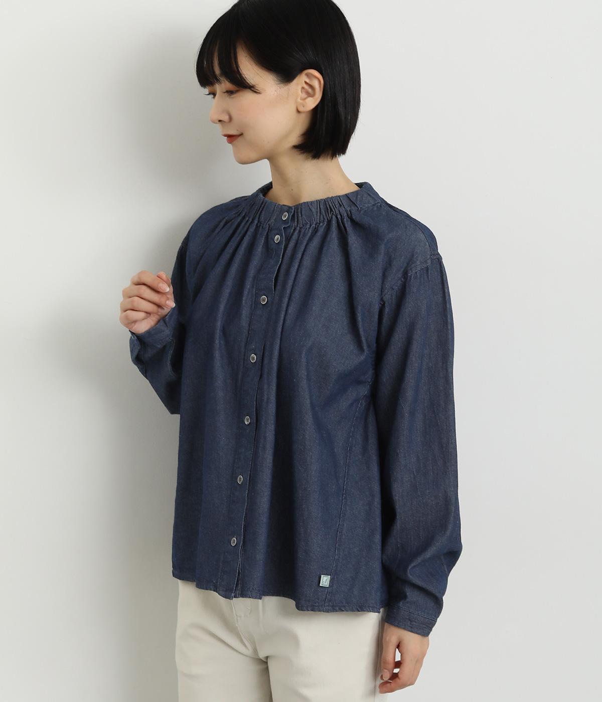 くしゅっとギャザーを寄せたバンドカラーが特徴ながら、ワーク感のある素材で甘くなりすぎないよう仕上げたブラウス。首元はゴム仕様で、きちんと見えとストレスのない着心地を両立。ゆるやかに広がるシルエットで羽織り使いも◎。