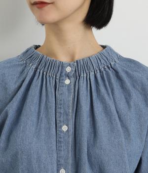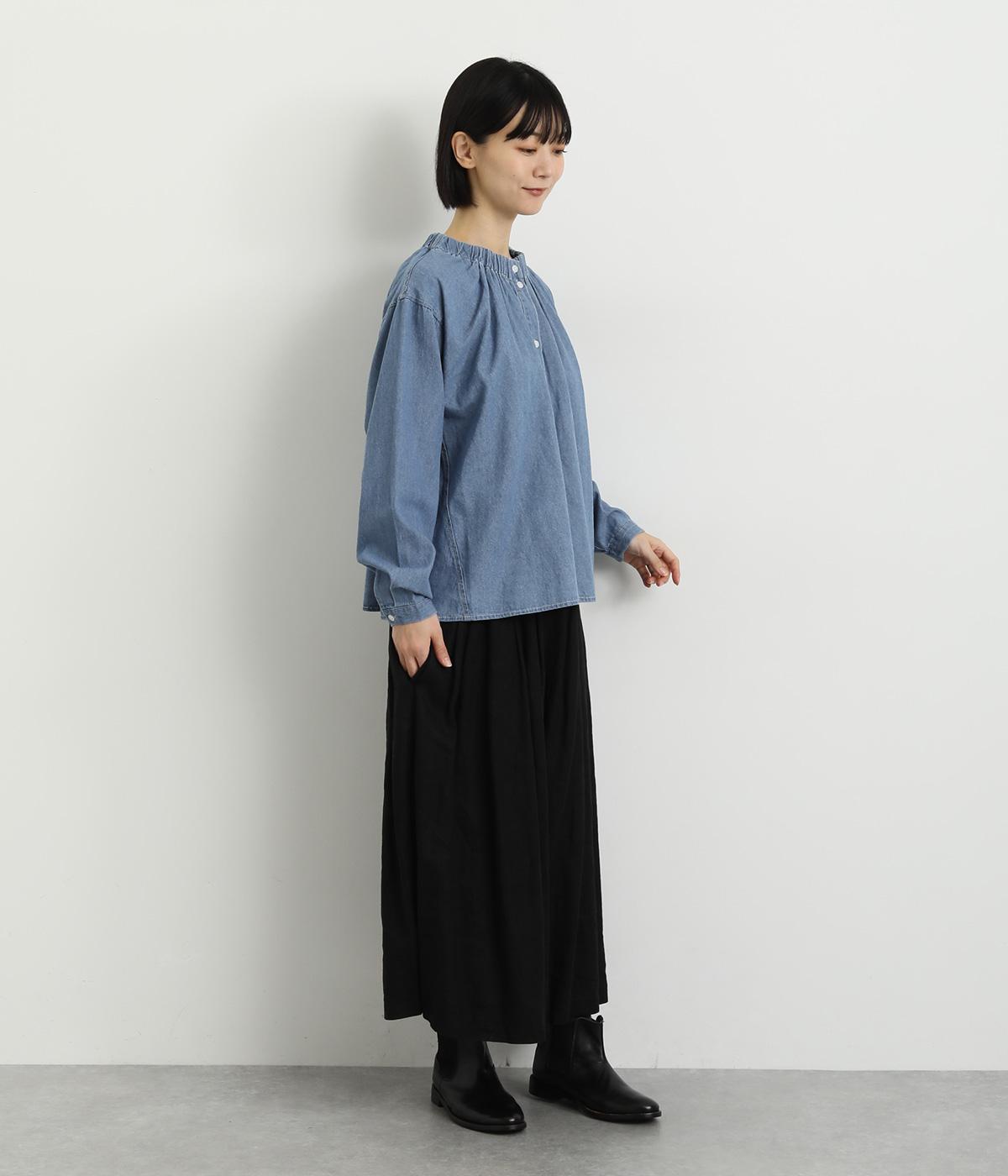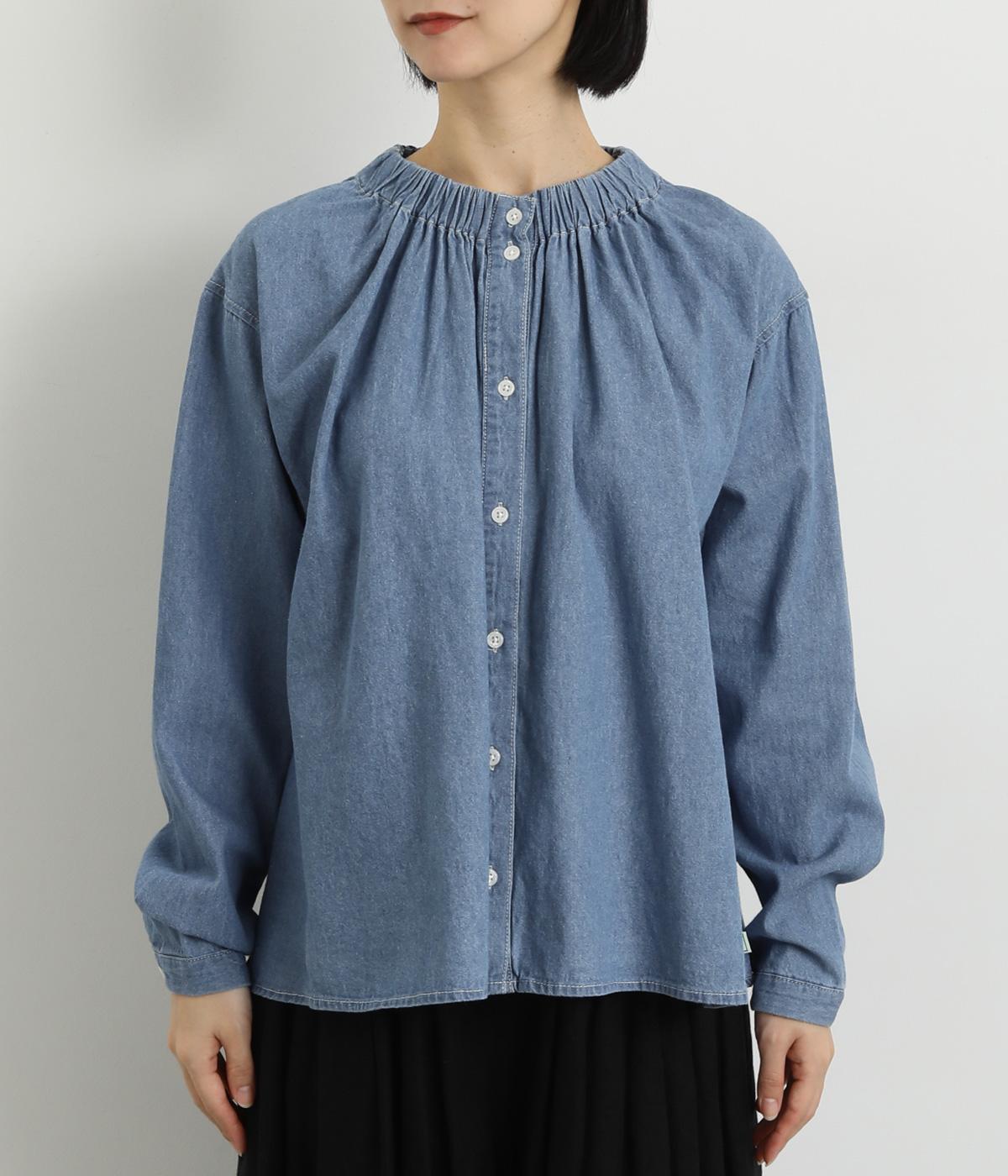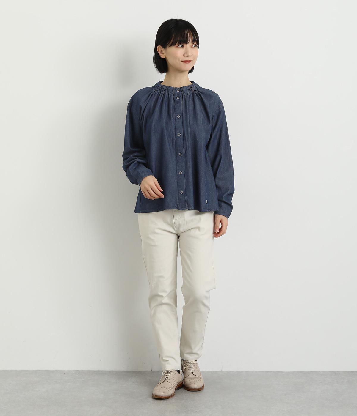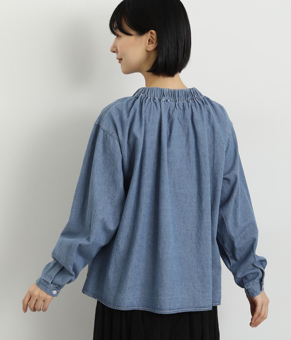 くしゅっとギャザーを寄せたバンドカラーが特徴ながら、ワーク感のある素材で甘くなりすぎないよう仕上げたブラウス。首元はゴム仕様で、きちんと見えとストレスのない着心地を両立。ゆるやかに広がるシルエットで羽織り使いも◎。