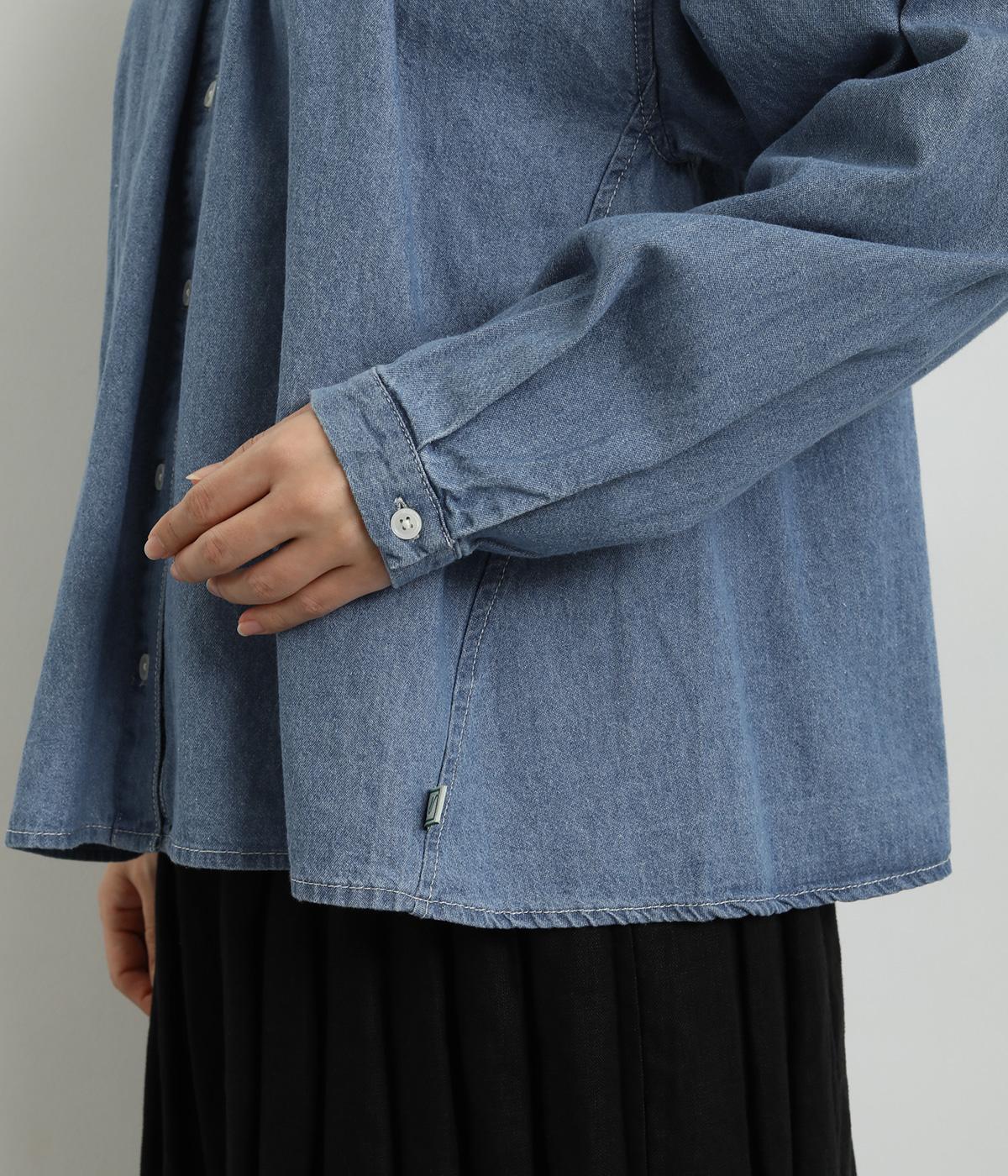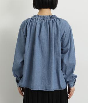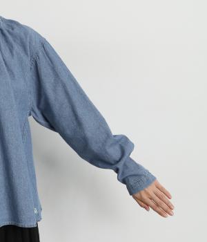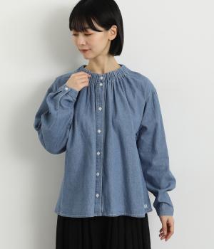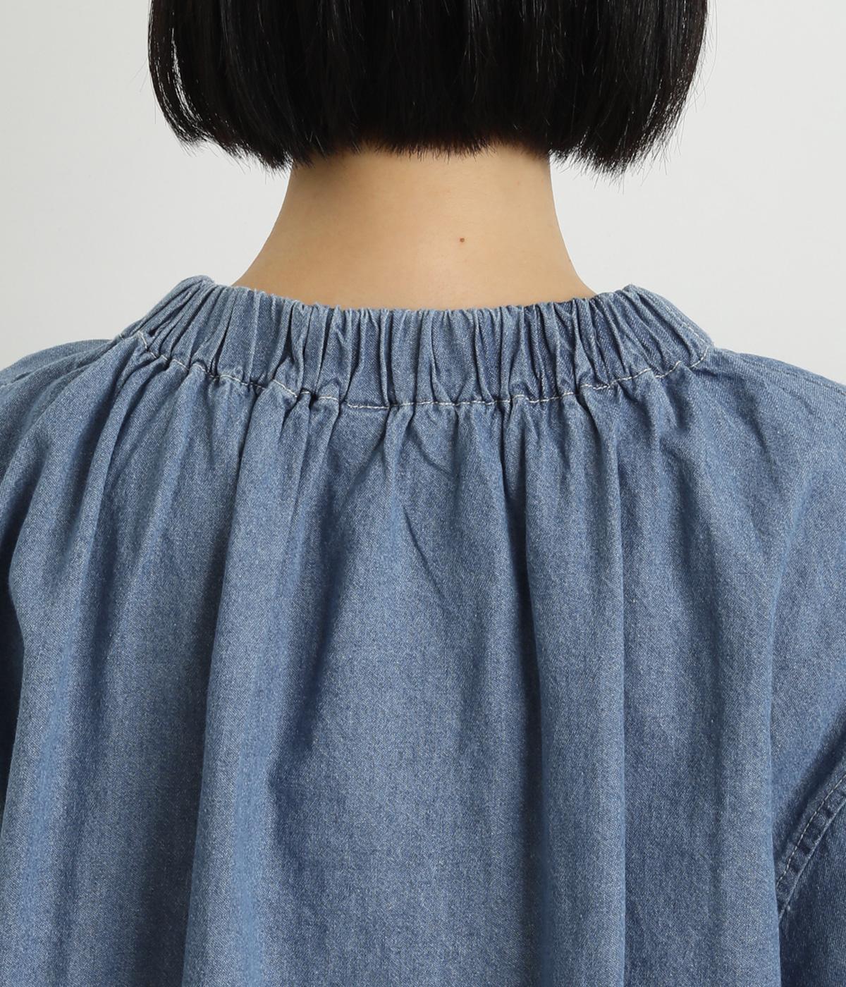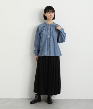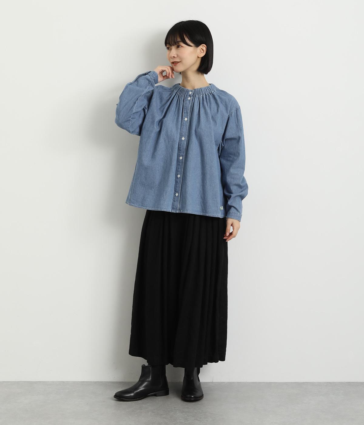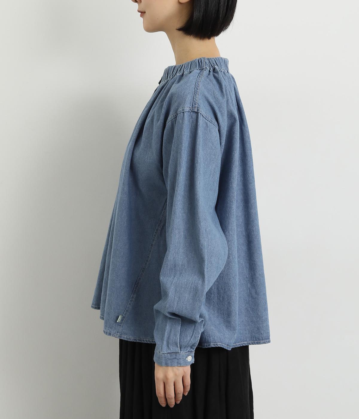 くしゅっとギャザーを寄せたバンドカラーが特徴ながら、ワーク感のある素材で甘くなりすぎないよう仕上げたブラウス。首元はゴム仕様で、きちんと見えとストレスのない着心地を両立。ゆるやかに広がるシルエットで羽織り使いも◎。