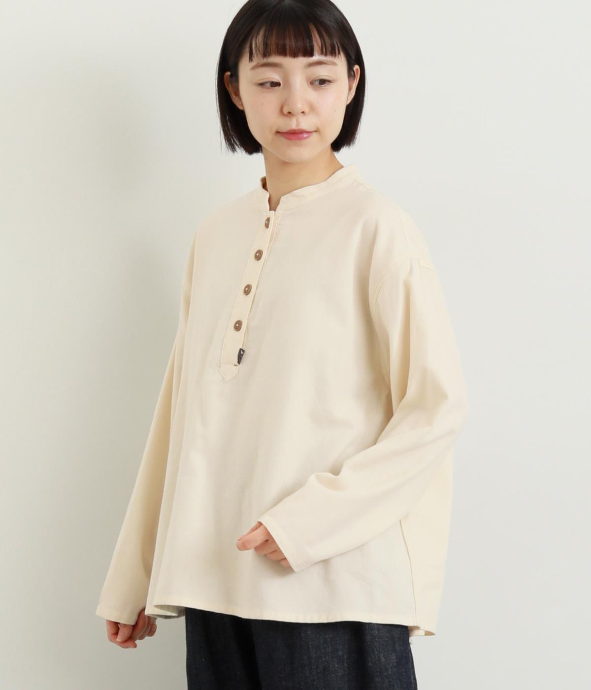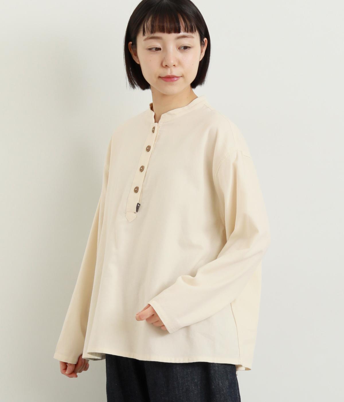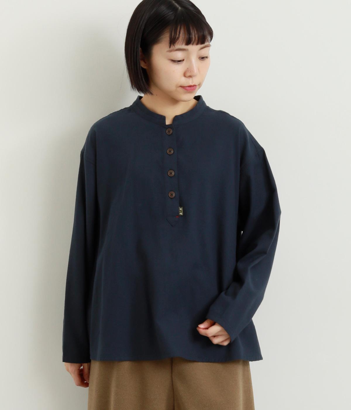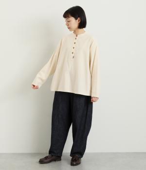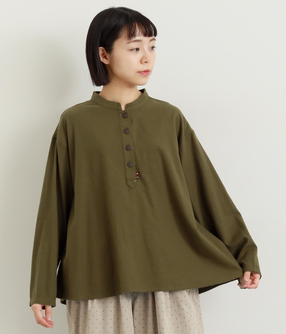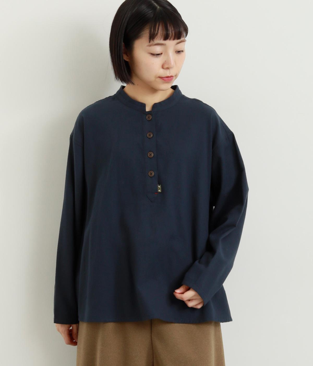 飽きのこないシルエットのプルオーバーシャツです。スタンドカラーが首元をすっきりと見せ、さりげないステッチやブランド刻印が入ったボタンが、カジュアル感を演出します。ゆるやかなAラインのシルエットで、ほどよい女性らしさもプラス。さまざまなボトムスと合わせやすい万能アイテムです。