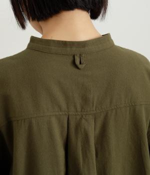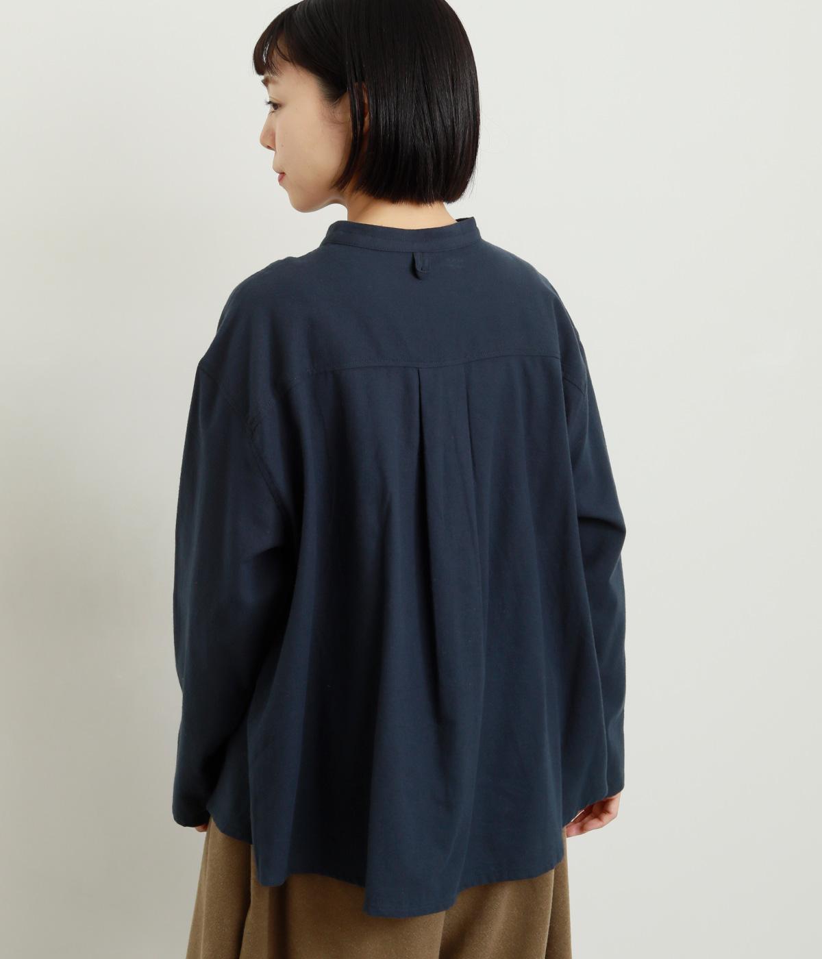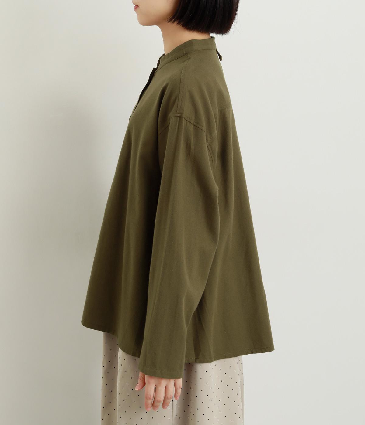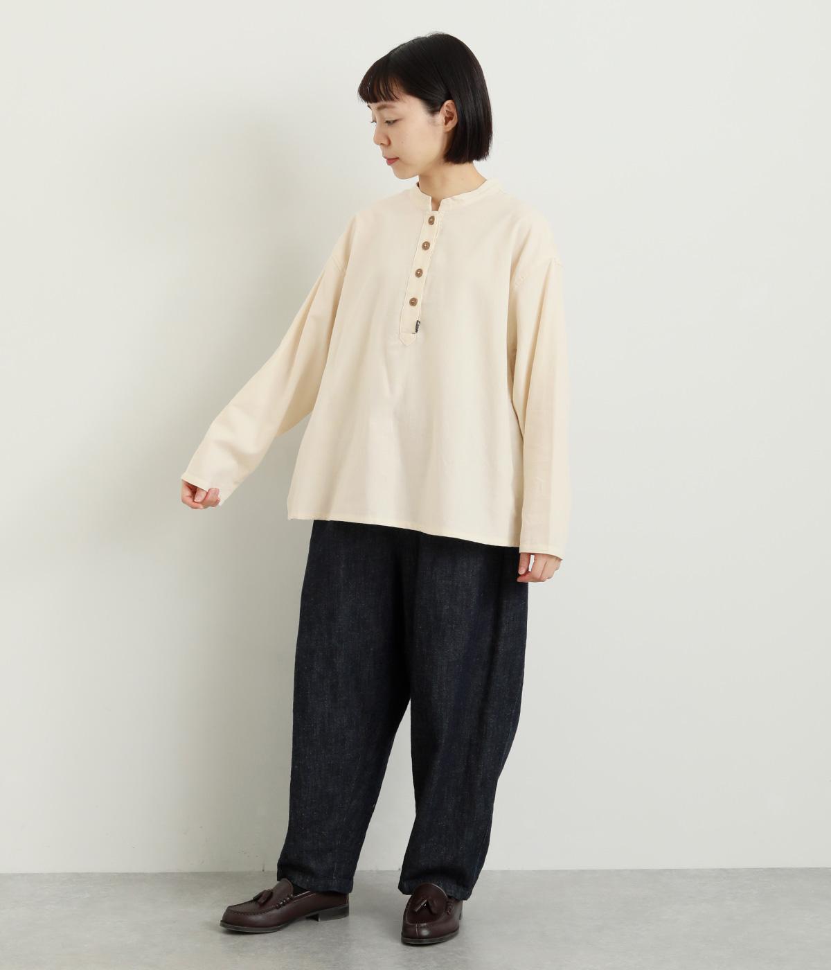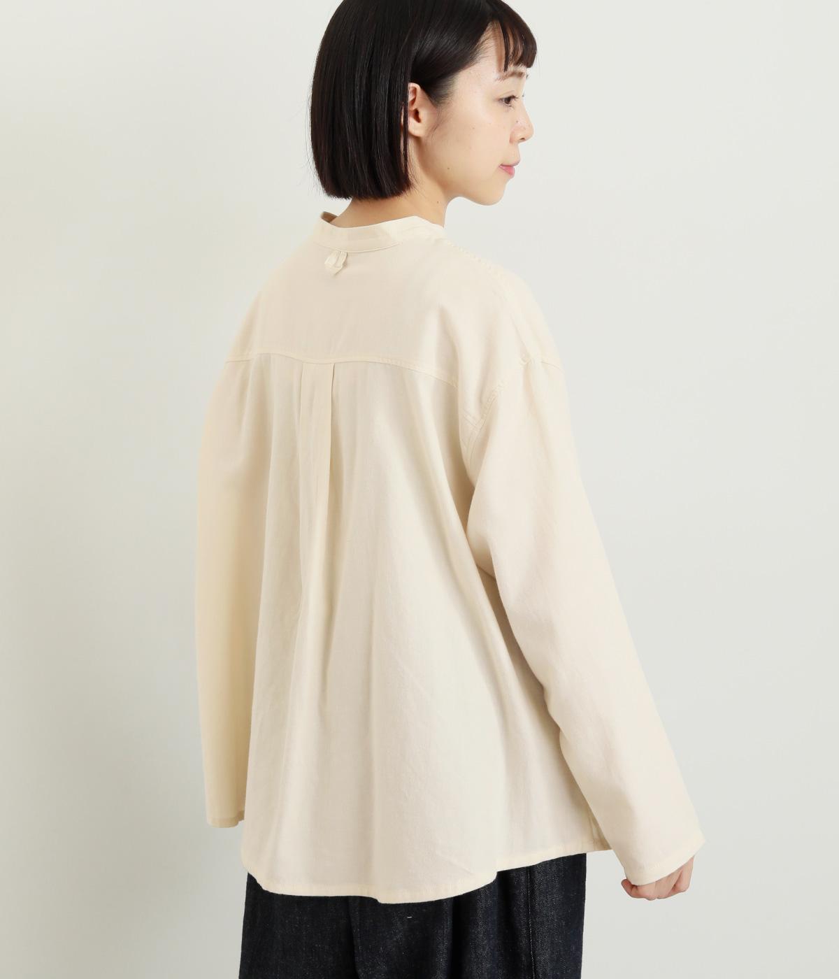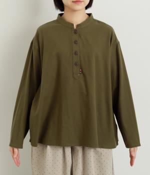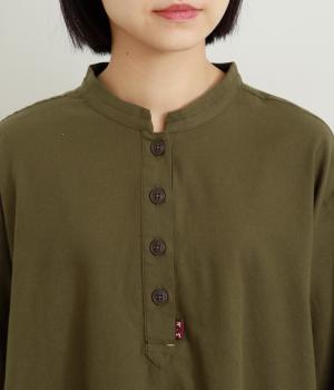 飽きのこないシルエットのプルオーバーシャツです。スタンドカラーが首元をすっきりと見せ、さりげないステッチやブランド刻印が入ったボタンが、カジュアル感を演出します。ゆるやかなAラインのシルエットで、ほどよい女性らしさもプラス。さまざまなボトムスと合わせやすい万能アイテムです。