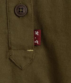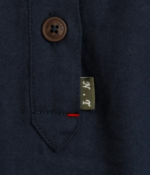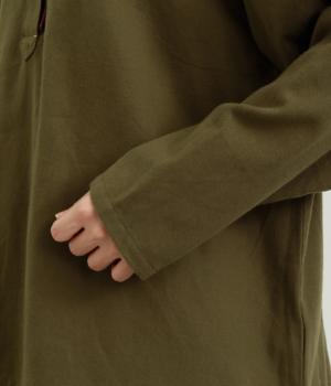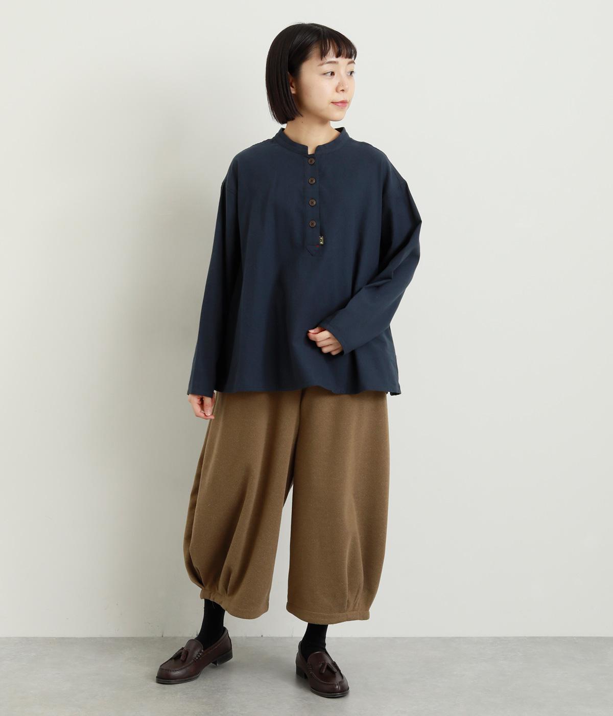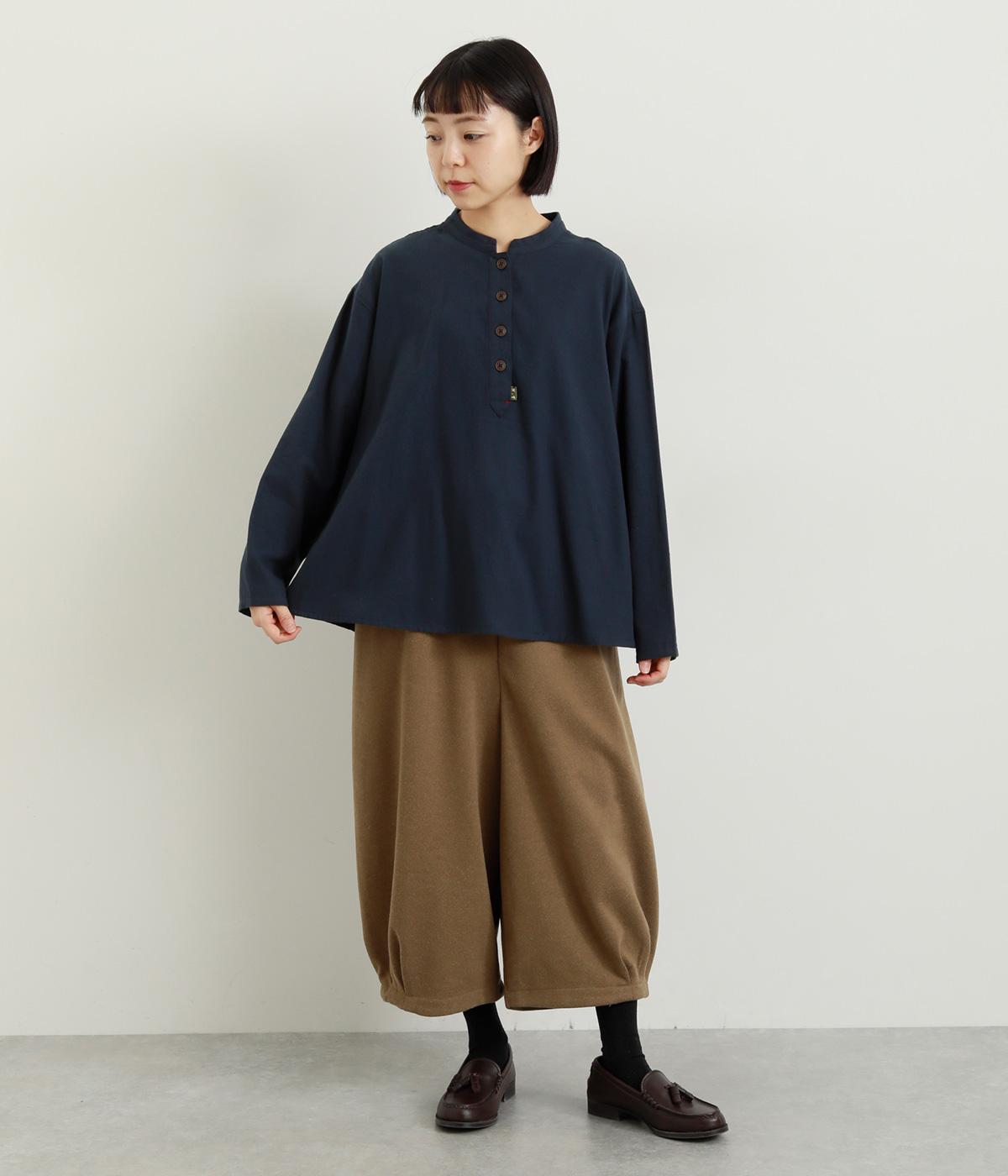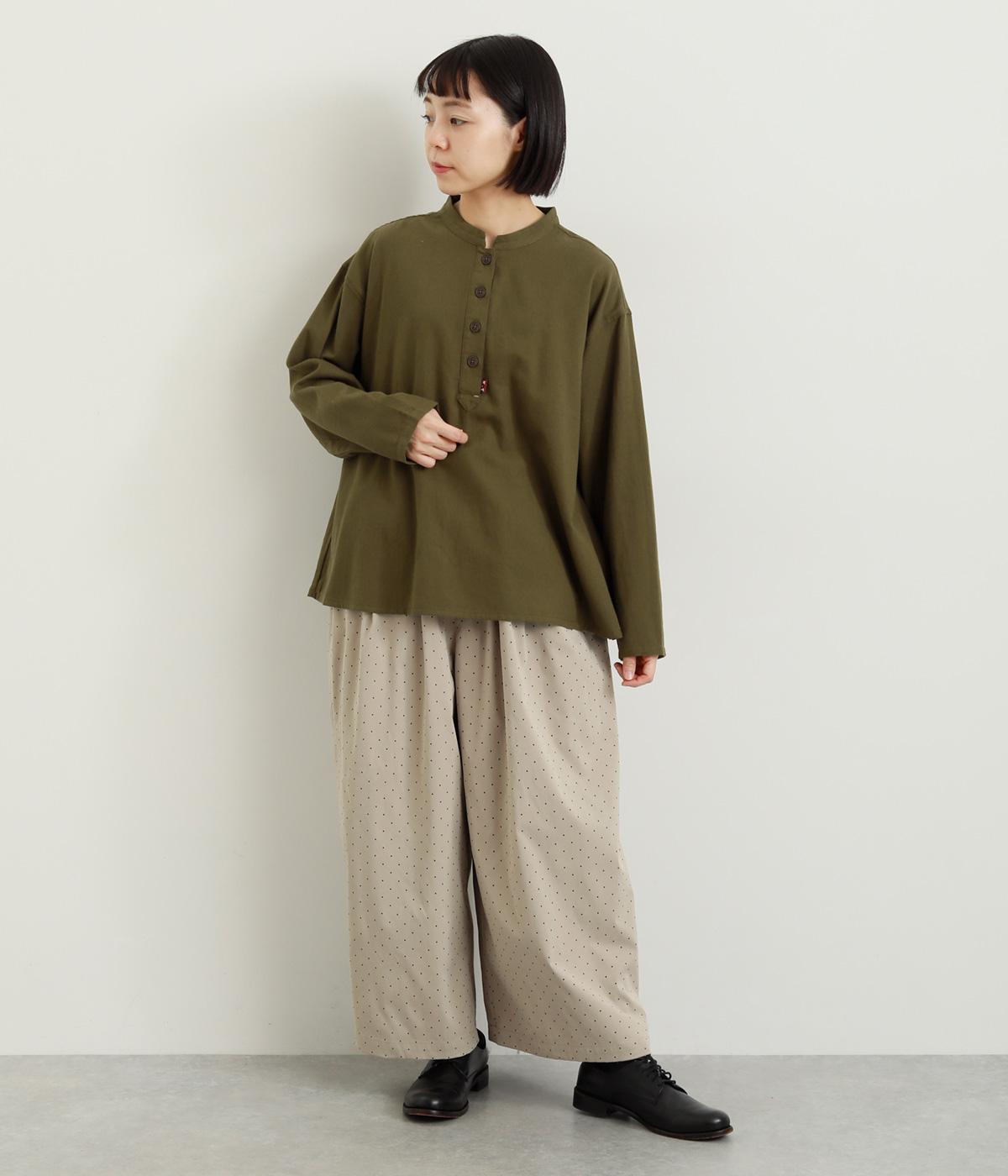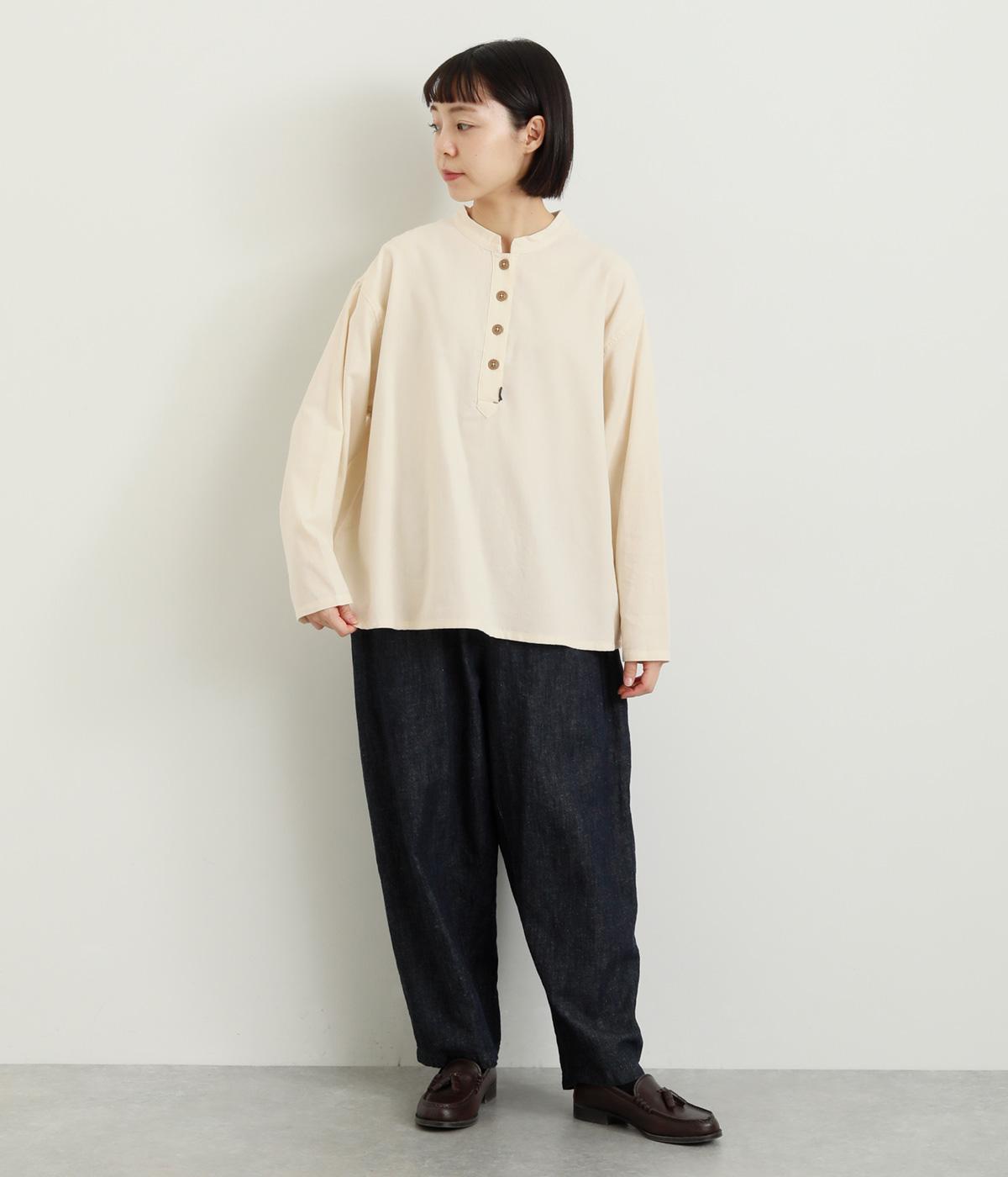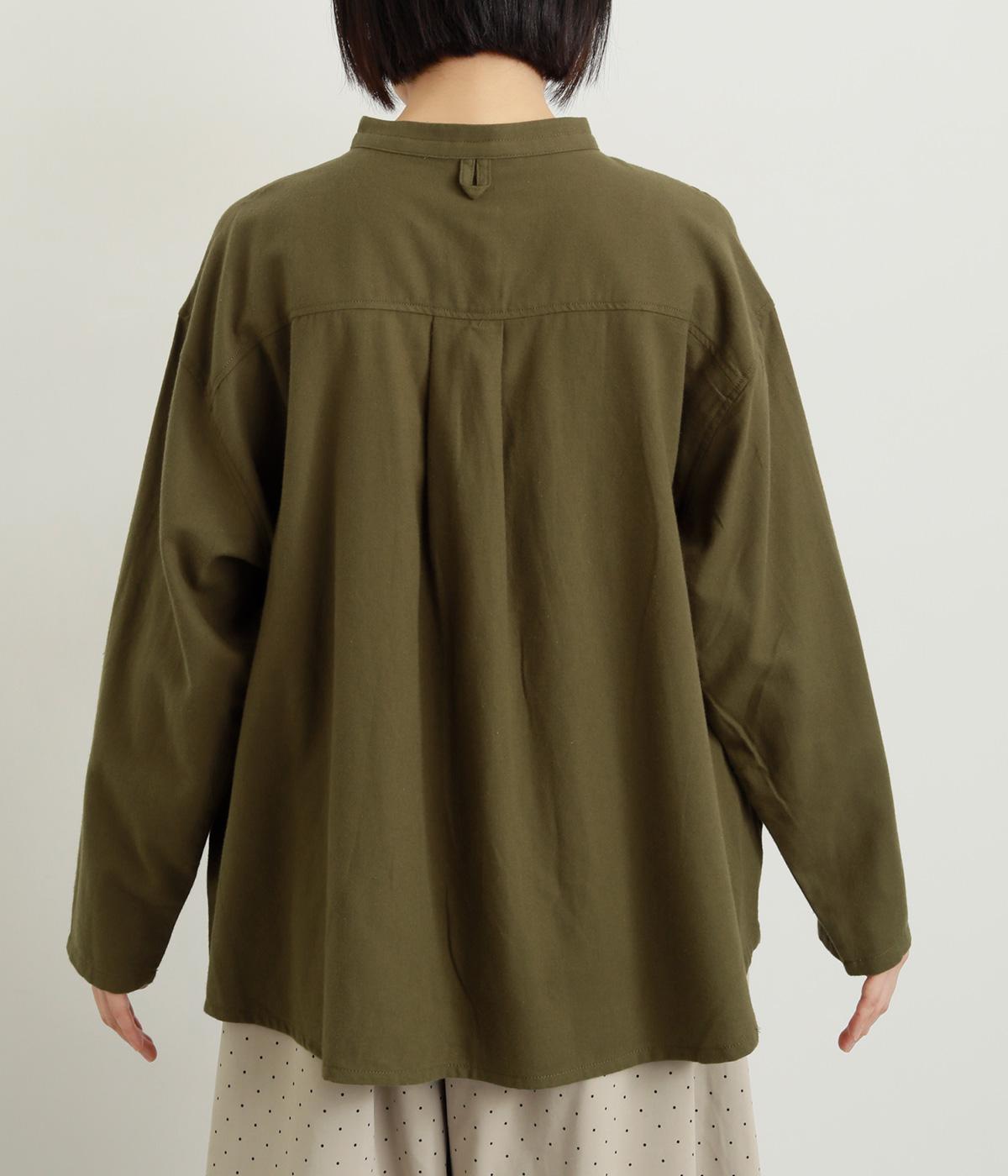 飽きのこないシルエットのプルオーバーシャツです。スタンドカラーが首元をすっきりと見せ、さりげないステッチやブランド刻印が入ったボタンが、カジュアル感を演出します。ゆるやかなAラインのシルエットで、ほどよい女性らしさもプラス。さまざまなボトムスと合わせやすい万能アイテムです。