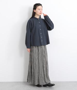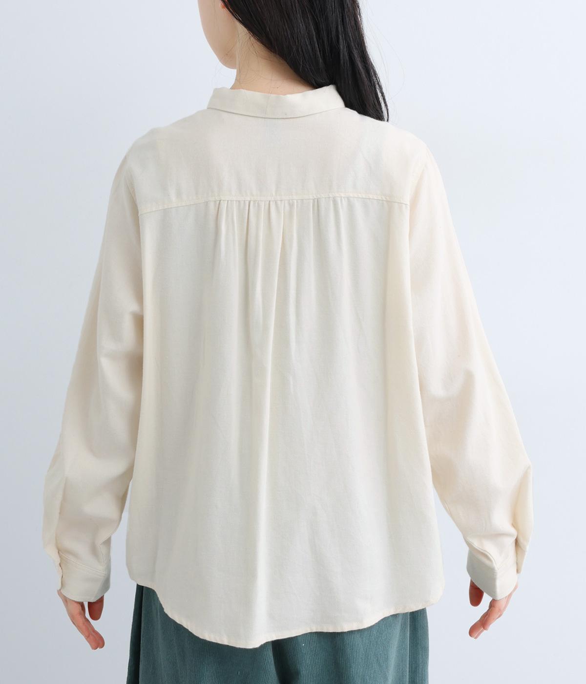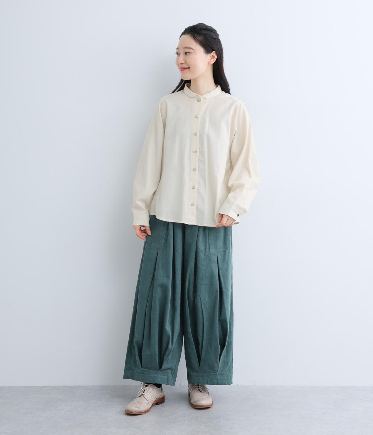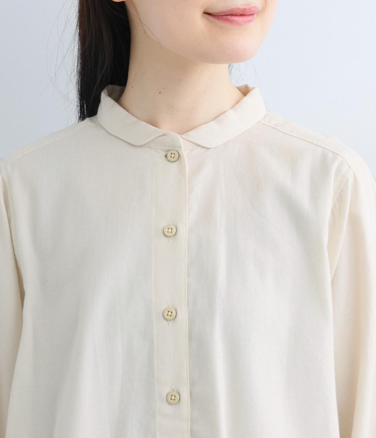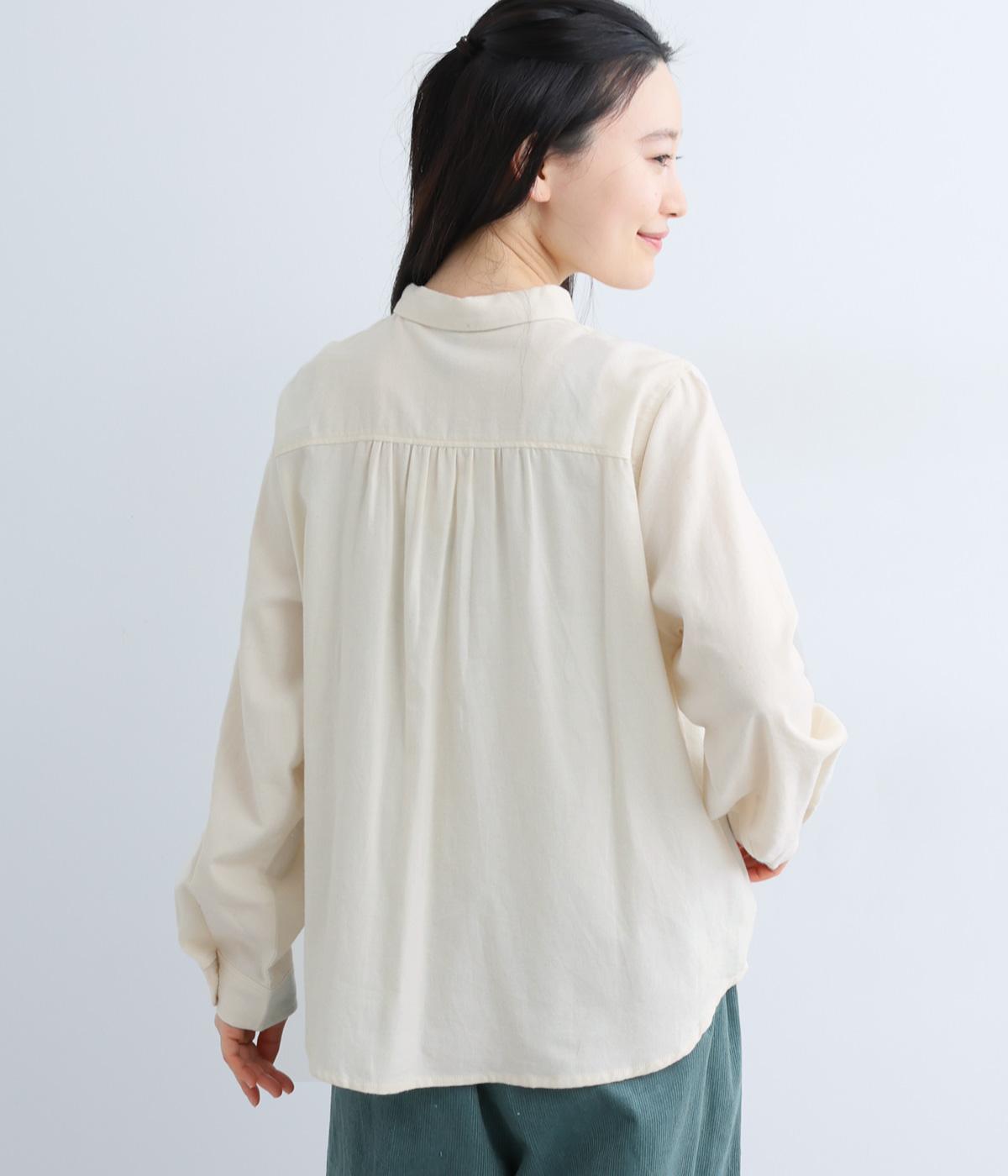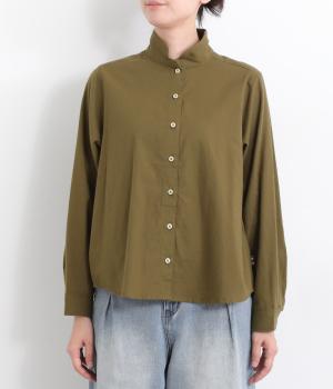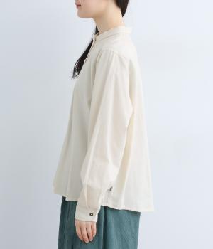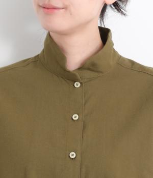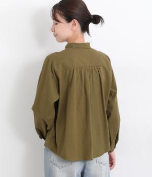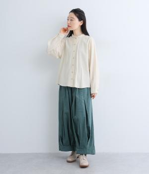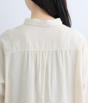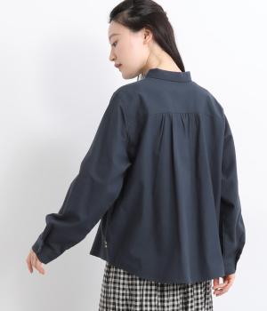 首元にやさしく沿うコンパクトな襟がきちんと感と女性らしいムードを運ぶシャツ。後ろ姿にふんわりとした動きを出すギャザー使いがポイントです。袖口にはカフスとタックをあしらい、長めの袖に立体的な丸みを持たせました。