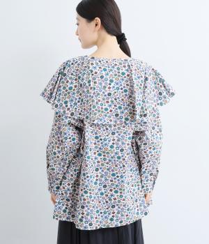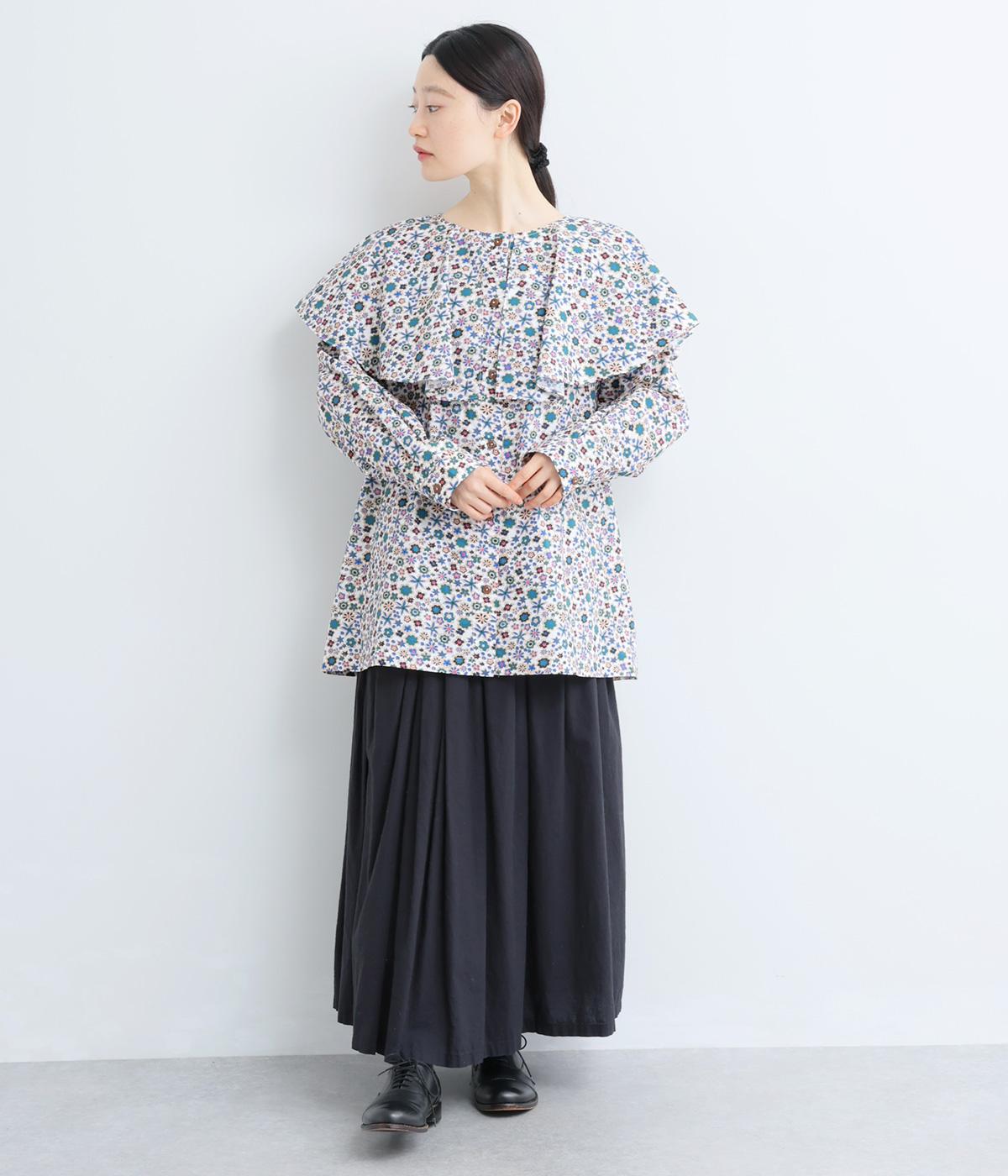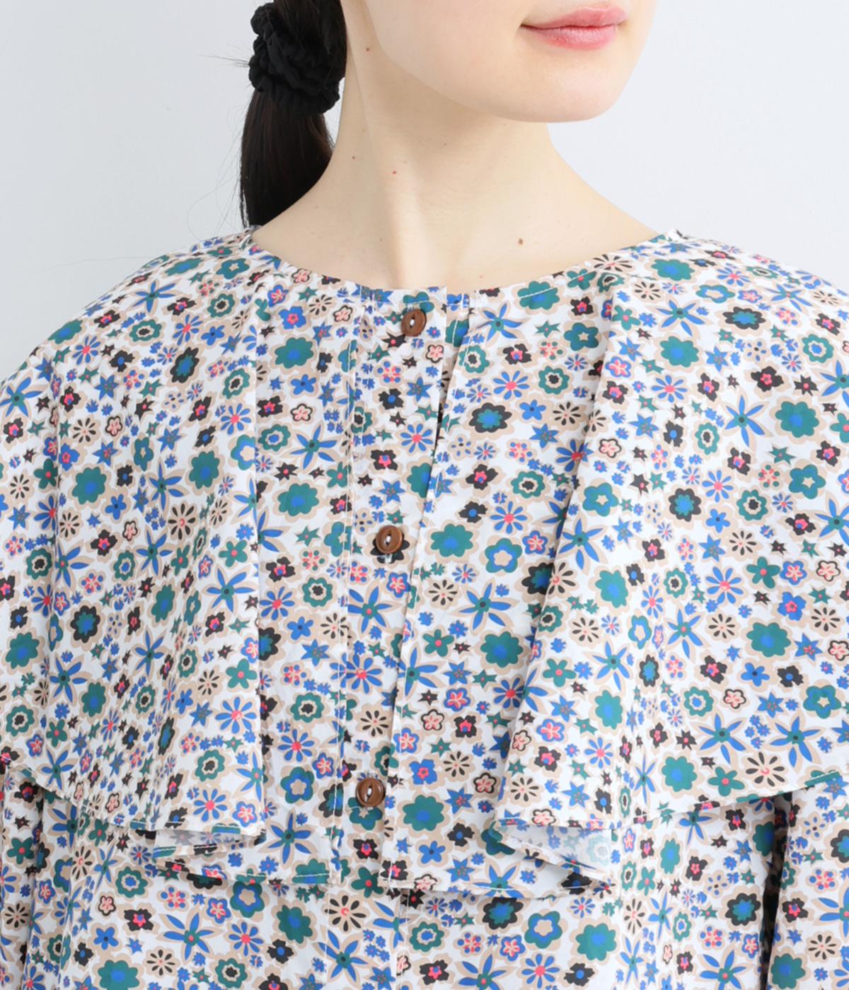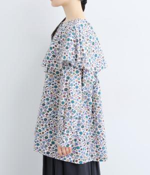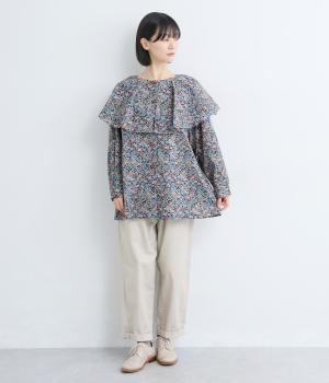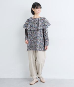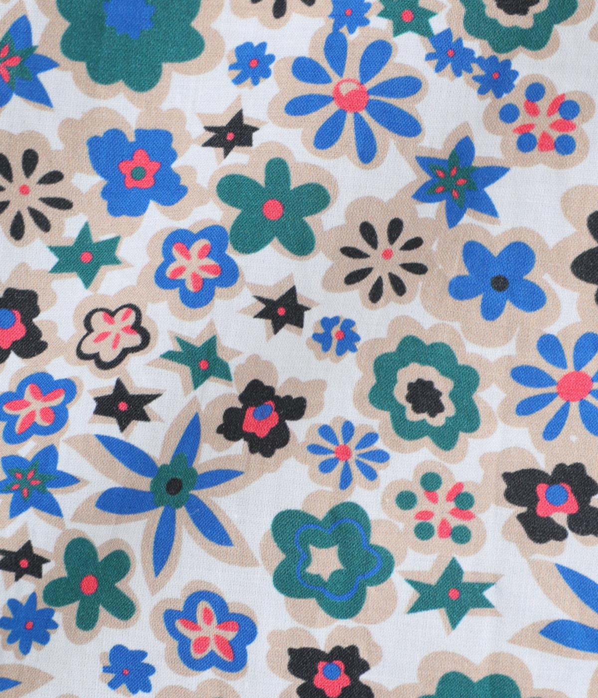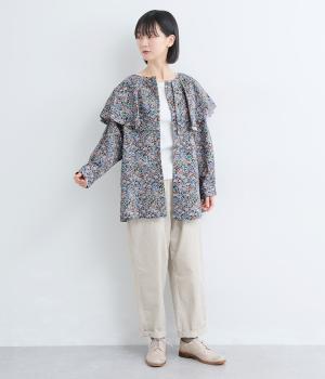 ややハリのある、さらりとした質感のコットン素材を使用しました。色とりどりのアンティークフラワーが、大人かわいいスタイリングに仕上げてくれます。