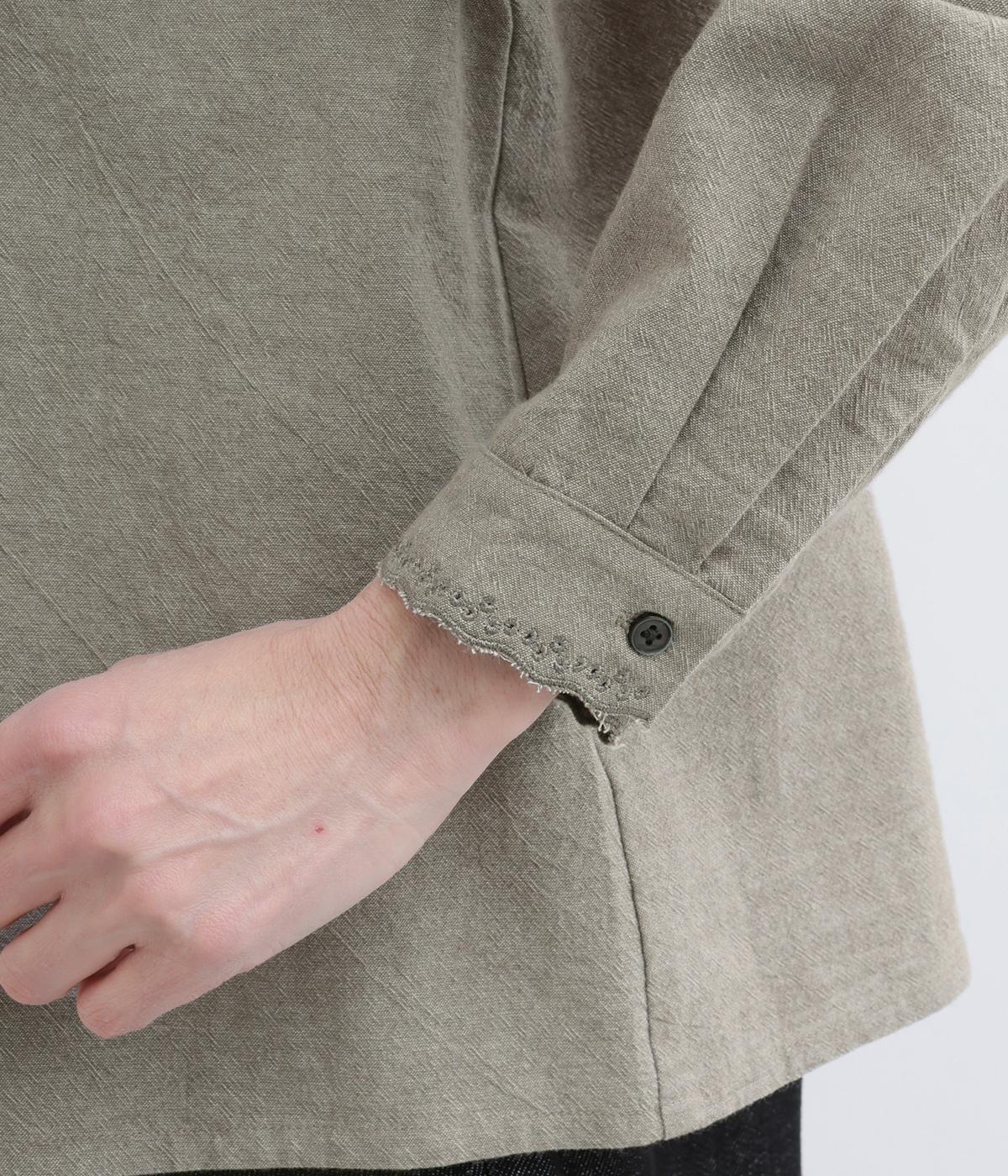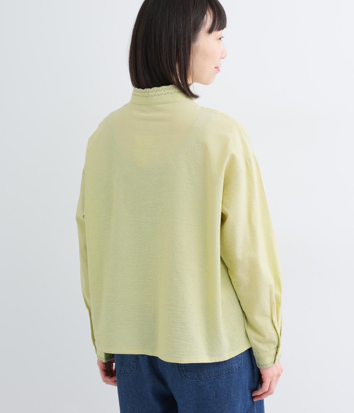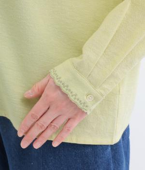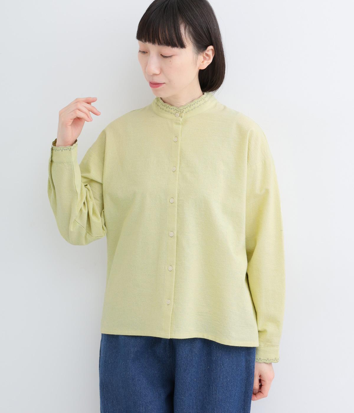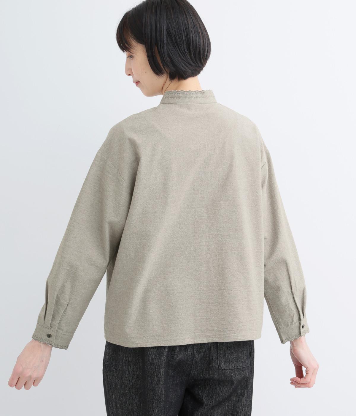 襟元と袖口の繊細な刺しゅうががクラシカルで上品な雰囲気を運びます。ドルマンスリーブで肩まわりはゆったりと、身幅は広がりすぎないすっきりしたシルエットに。フェミニンにもカジュアルにもマッチする一枚です。