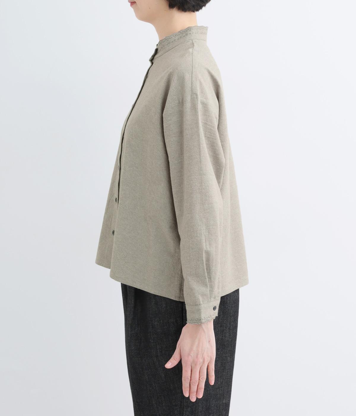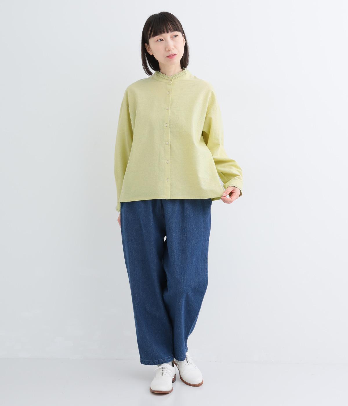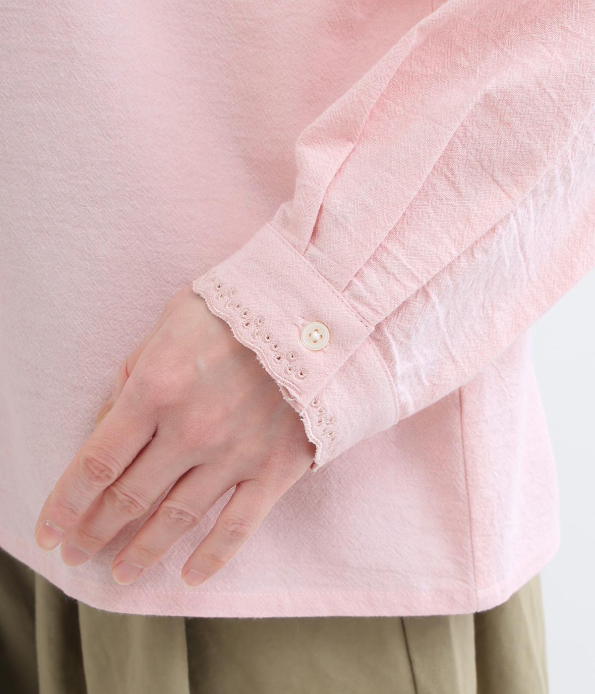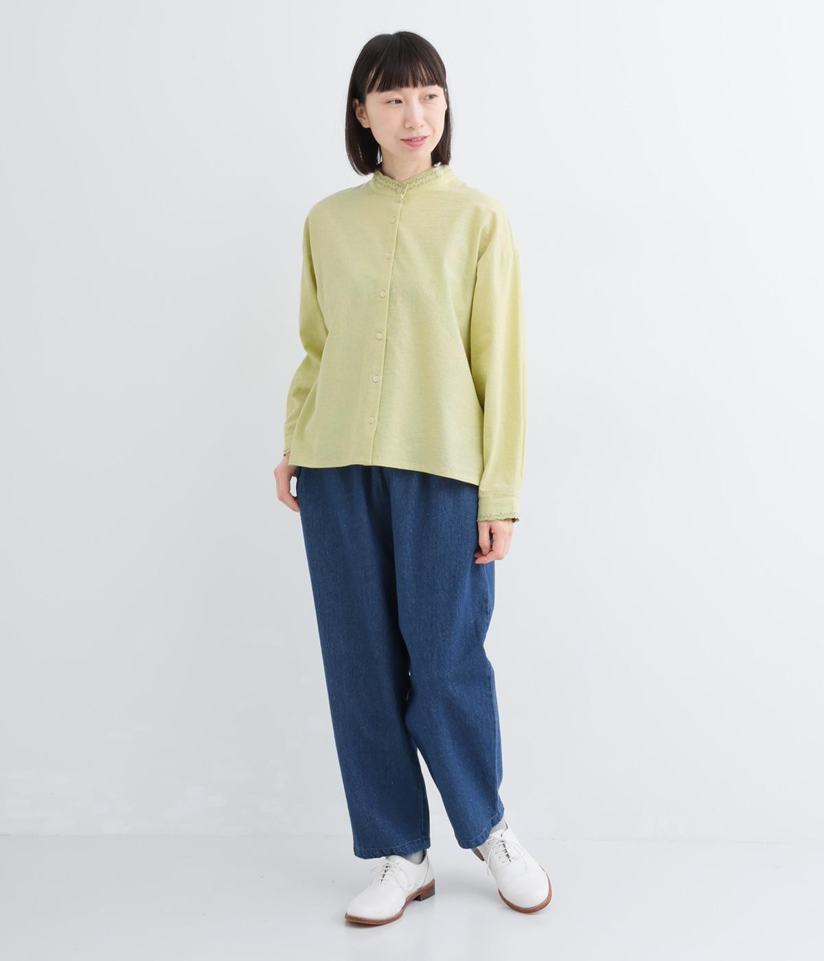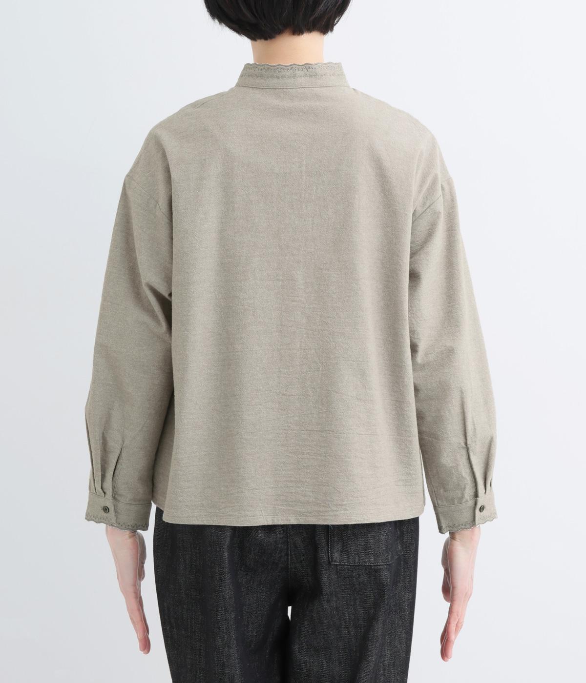 襟元と袖口の繊細な刺しゅうががクラシカルで上品な雰囲気を運びます。ドルマンスリーブで肩まわりはゆったりと、身幅は広がりすぎないすっきりしたシルエットに。フェミニンにもカジュアルにもマッチする一枚です。