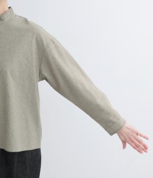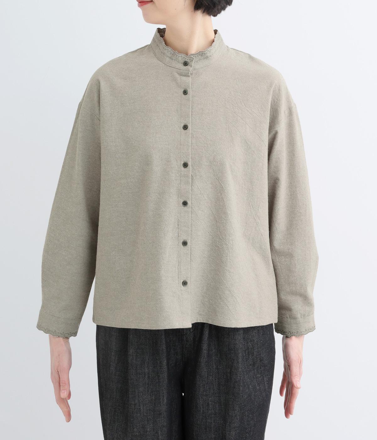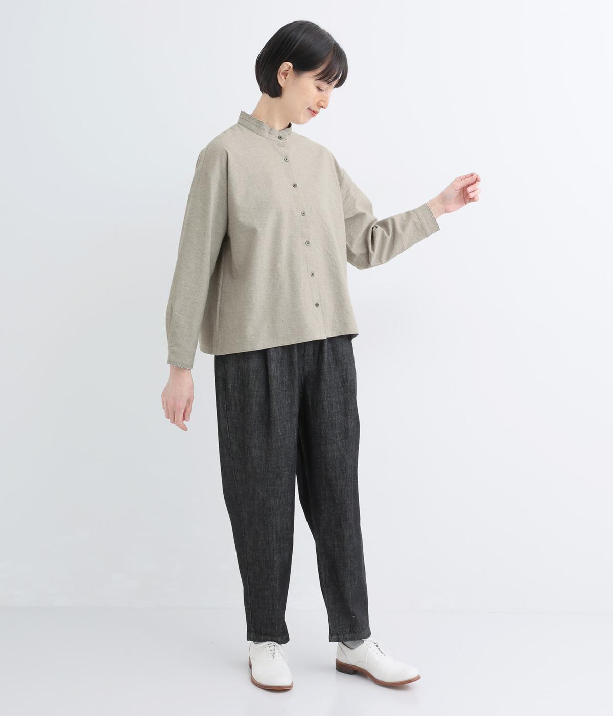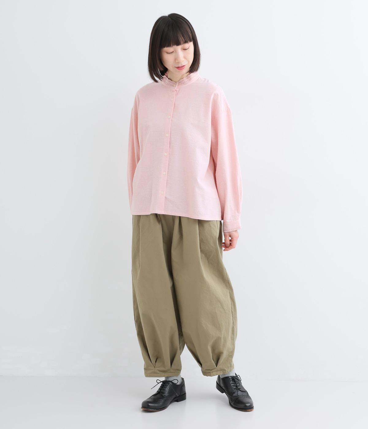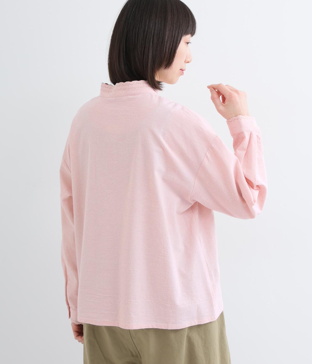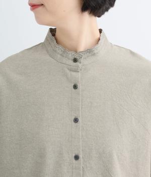 襟元と袖口の繊細な刺しゅうががクラシカルで上品な雰囲気を運びます。ドルマンスリーブで肩まわりはゆったりと、身幅は広がりすぎないすっきりしたシルエットに。フェミニンにもカジュアルにもマッチする一枚です。