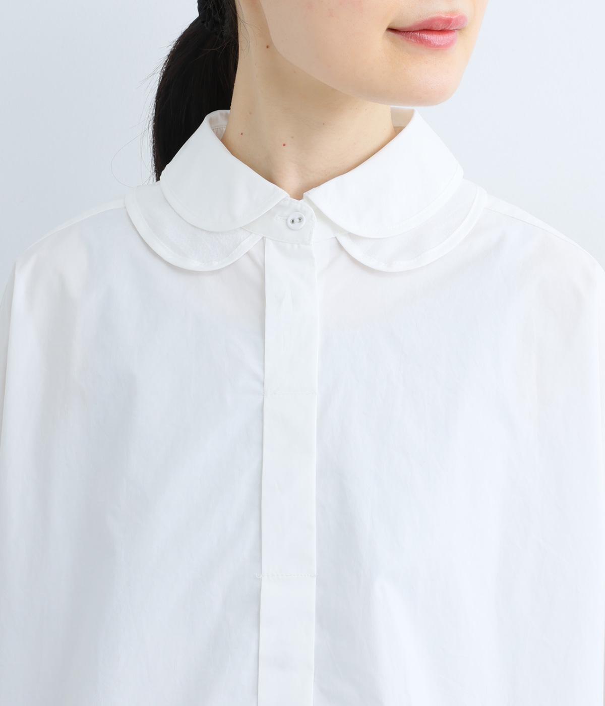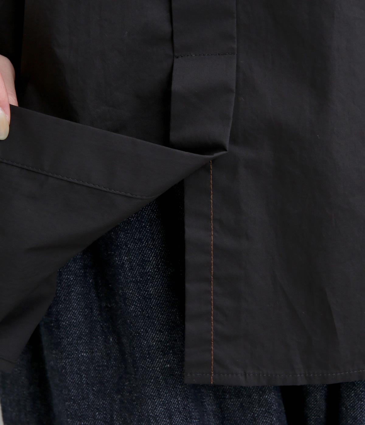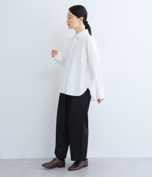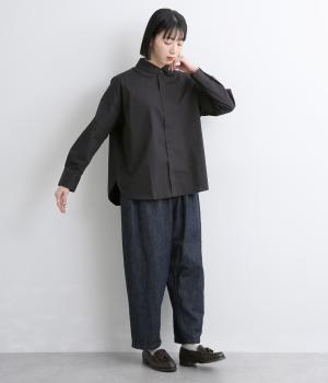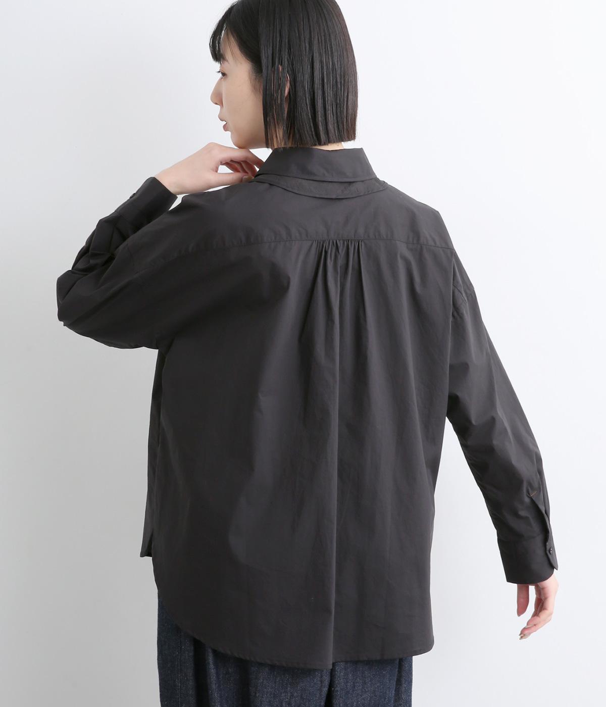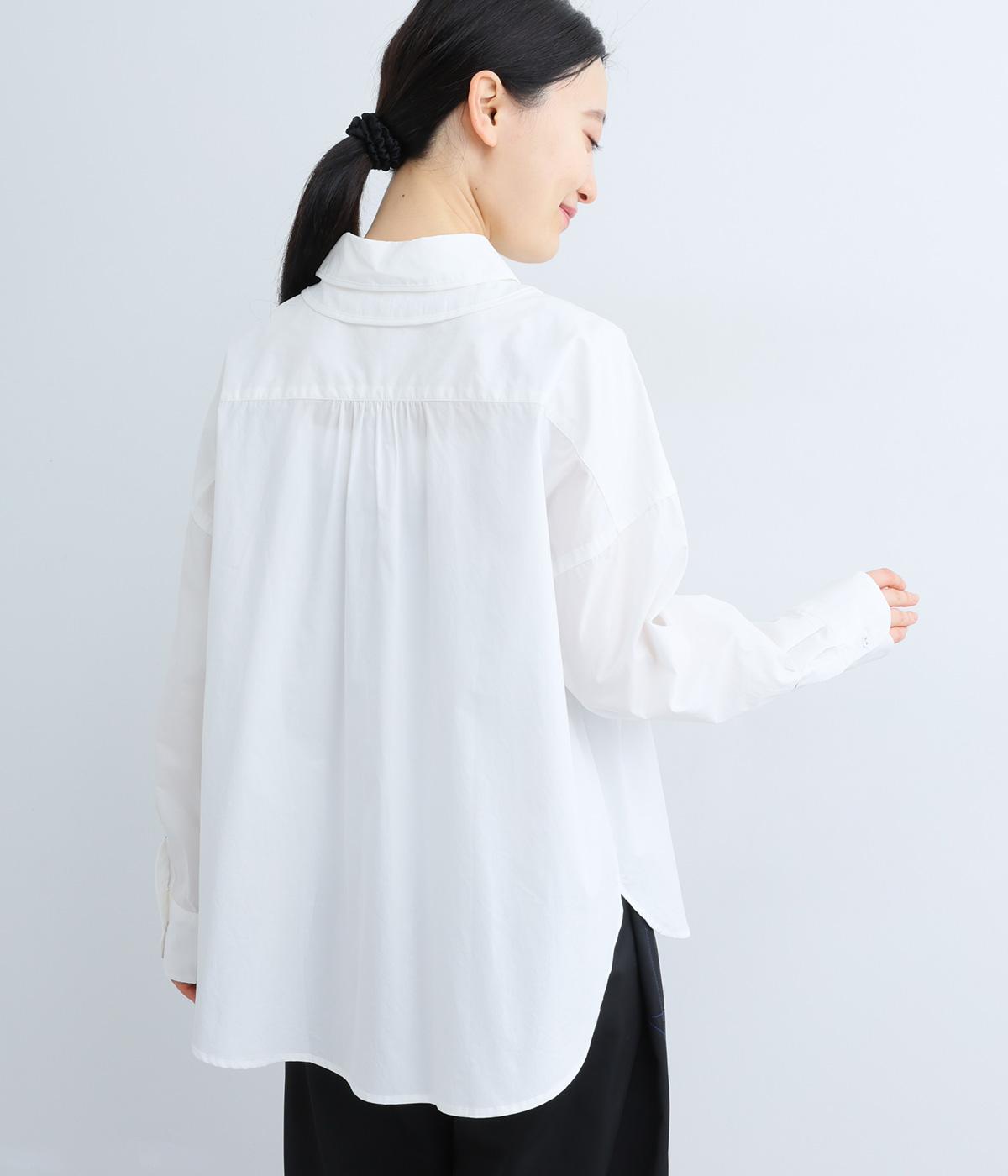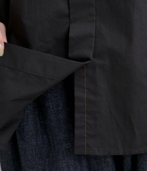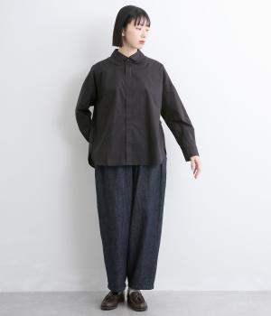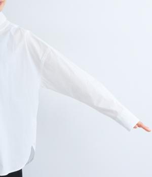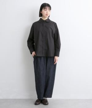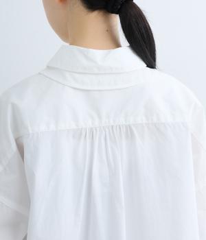 高密度なハリがきちんと感のある印象のコットンタイプライター生地。下の襟にはほのかな透け感のある別布で奥行きをプラス。さらりと肌ばなれよく、心地いい着用感です。