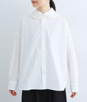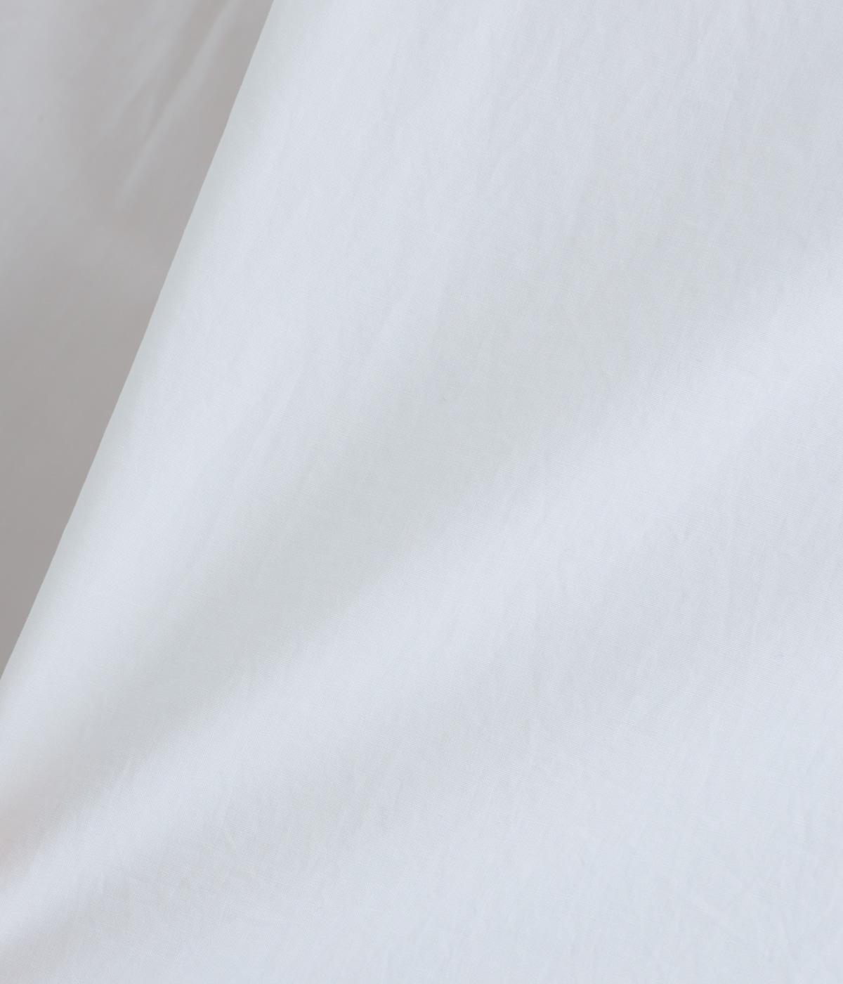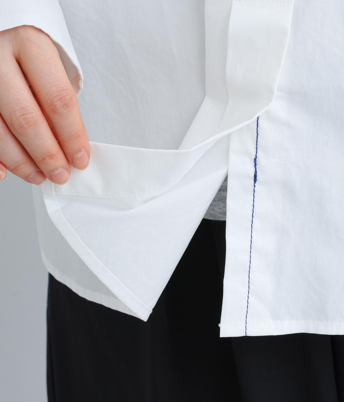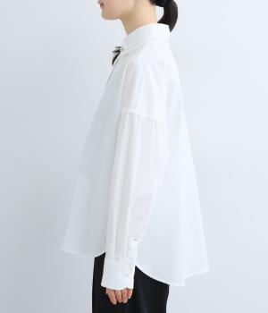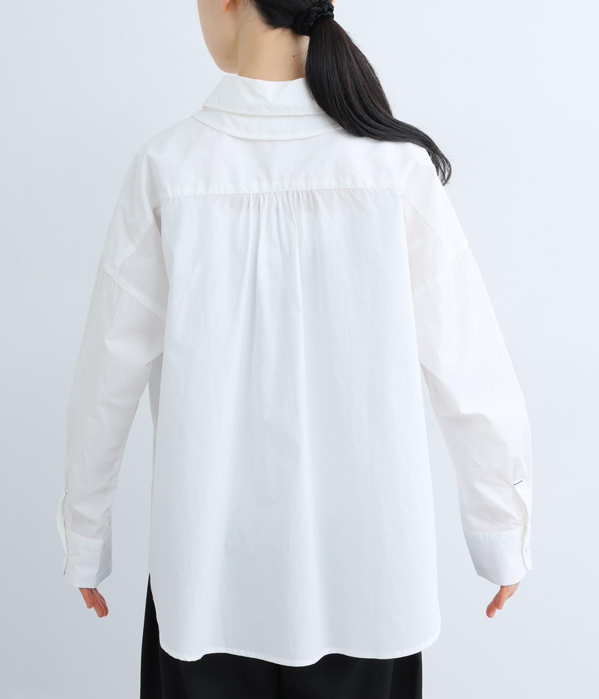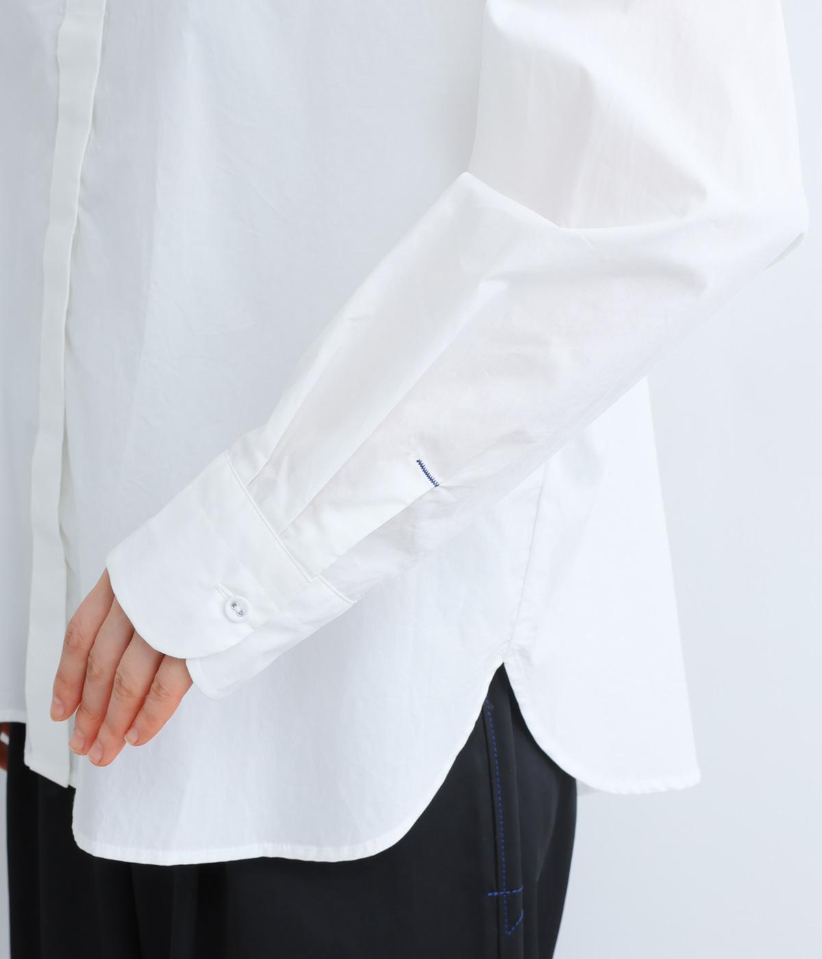 高密度なハリがきちんと感のある印象のコットンタイプライター生地。下の襟にはほのかな透け感のある別布で奥行きをプラス。さらりと肌ばなれよく、心地いい着用感です。
