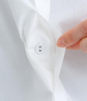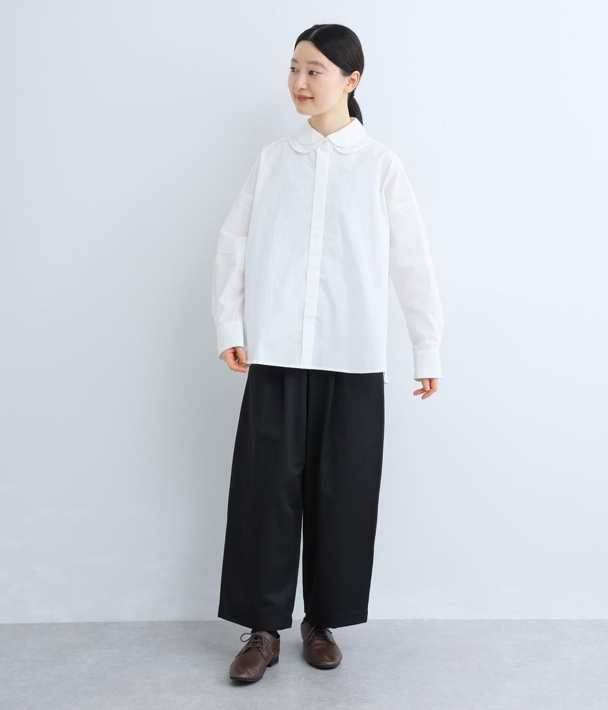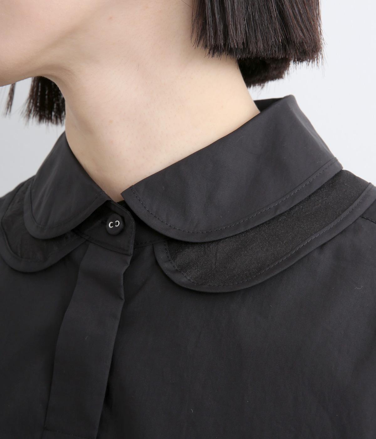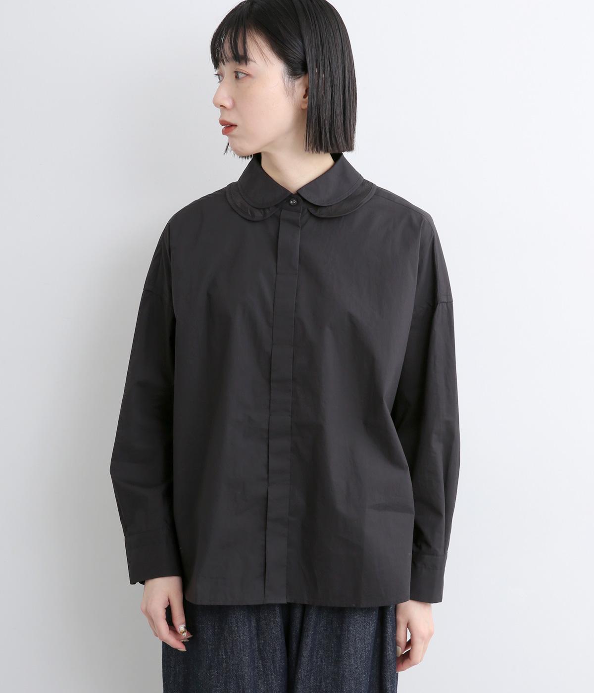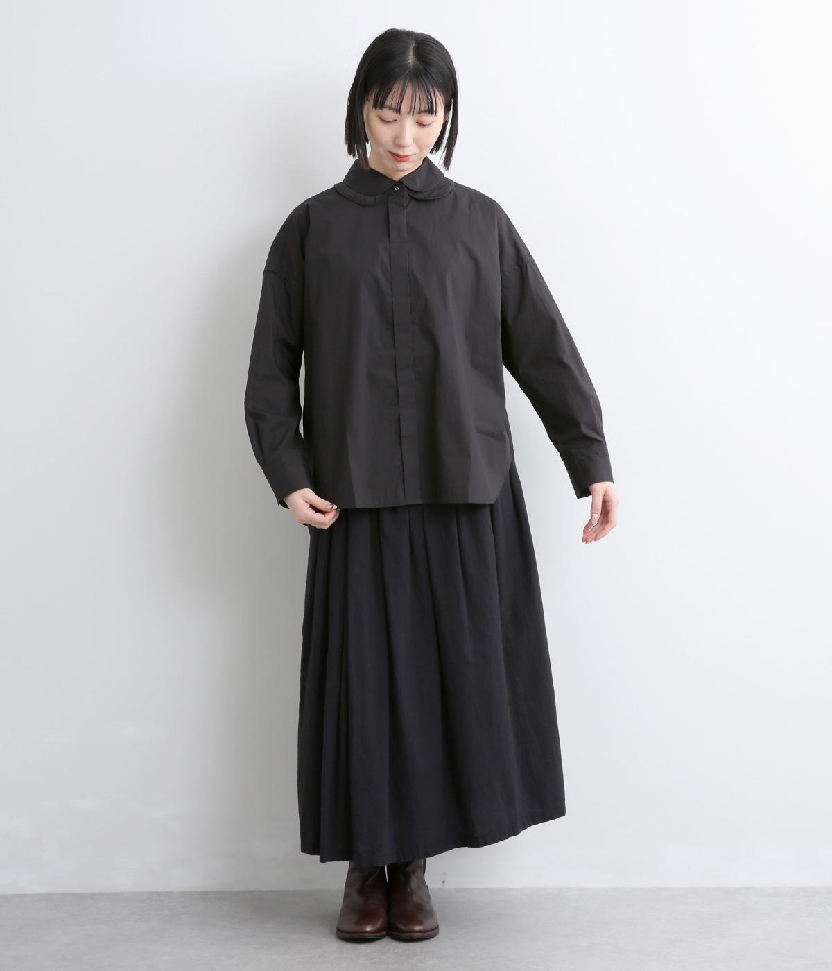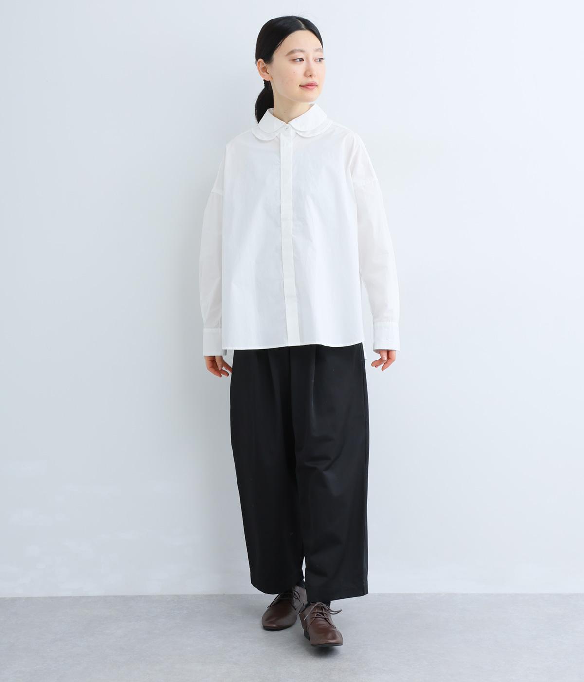高密度なハリがきちんと感のある印象のコットンタイプライター生地。下の襟にはほのかな透け感のある別布で奥行きをプラス。さらりと肌ばなれよく、心地いい着用感です。