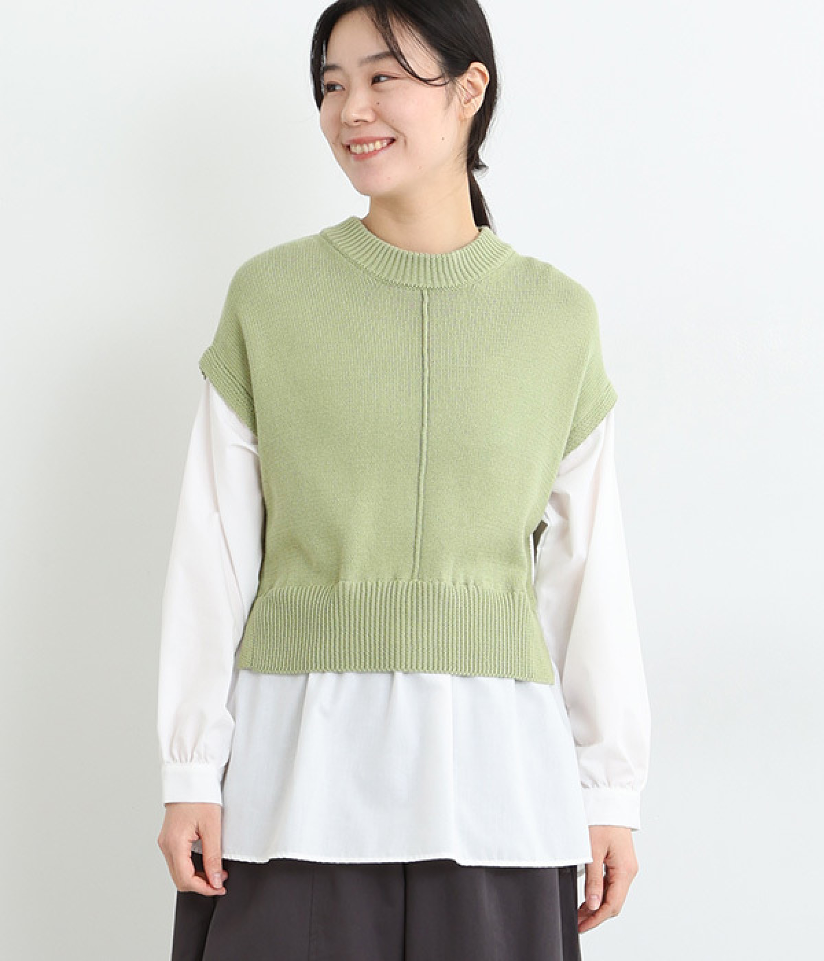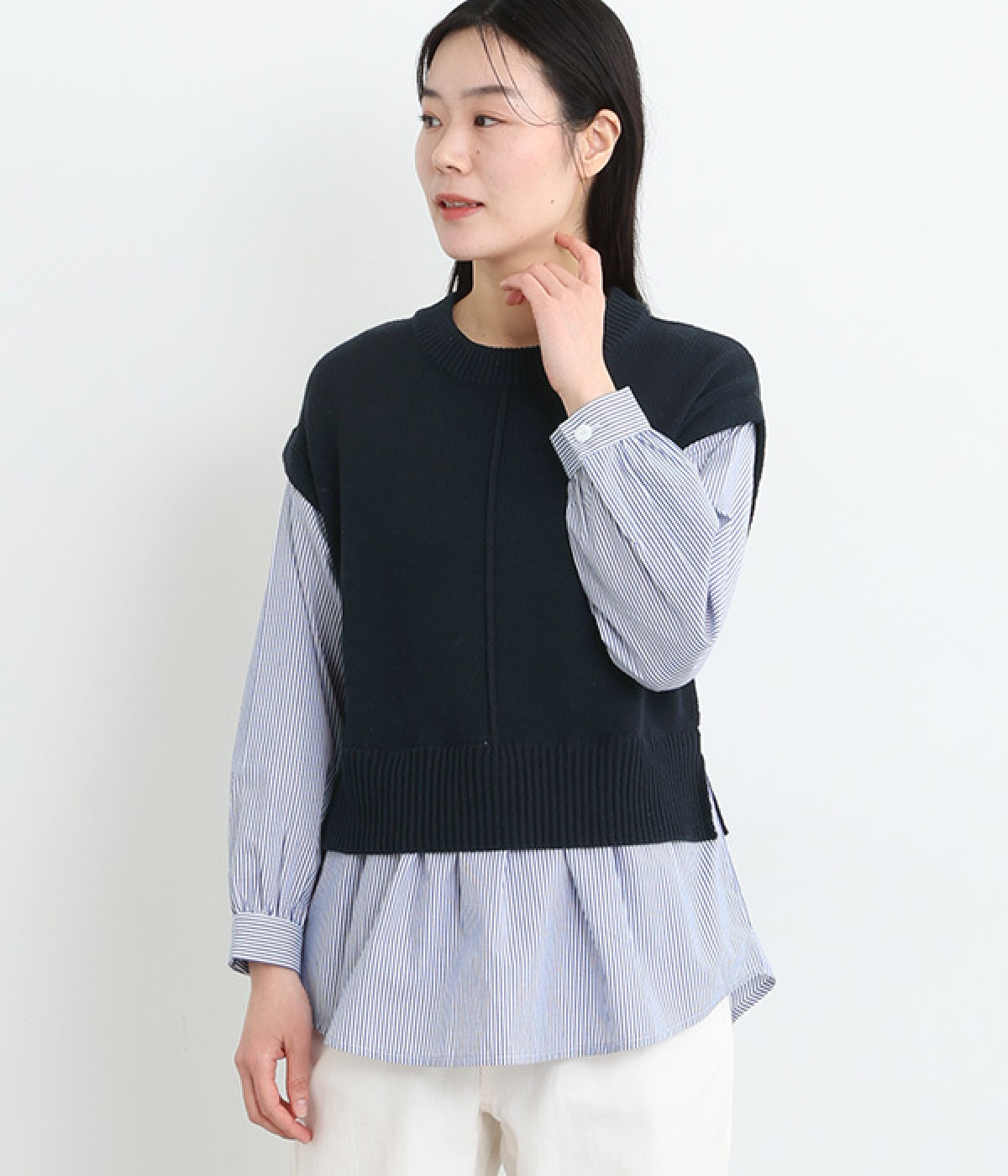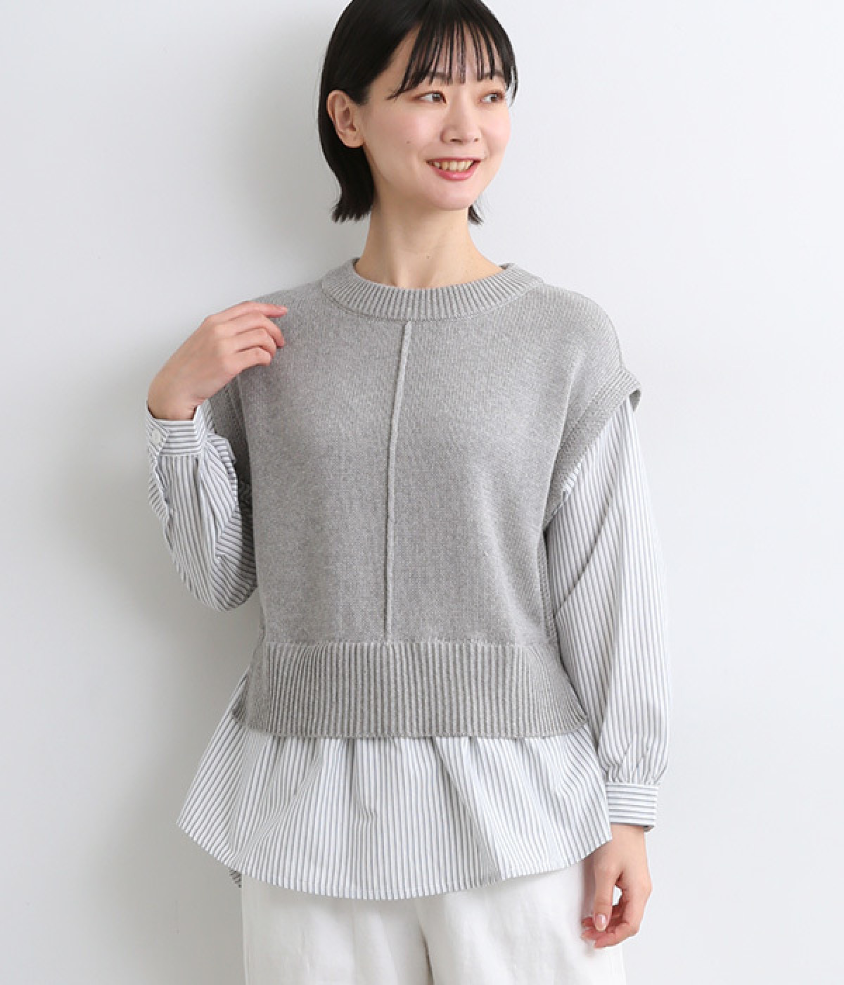 一枚でベストとシャツを重ね着したようなドッキングプルオーバーです。ベストを短めにすることで、バランスのとれた着こなしに。