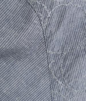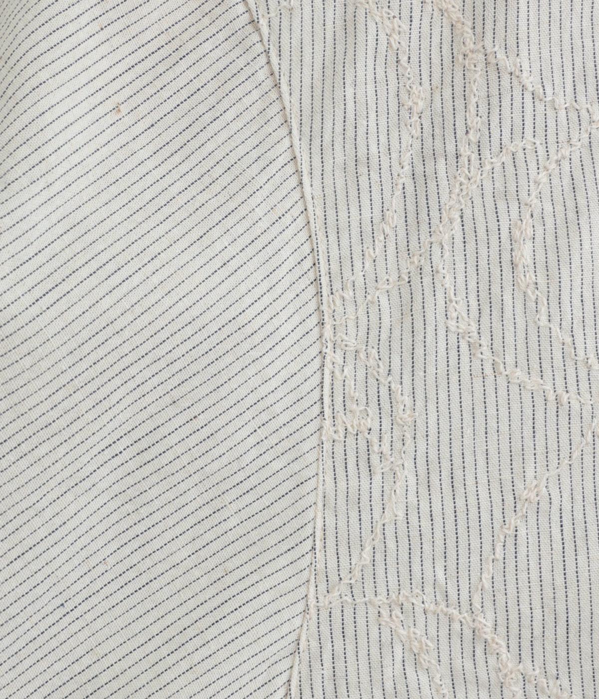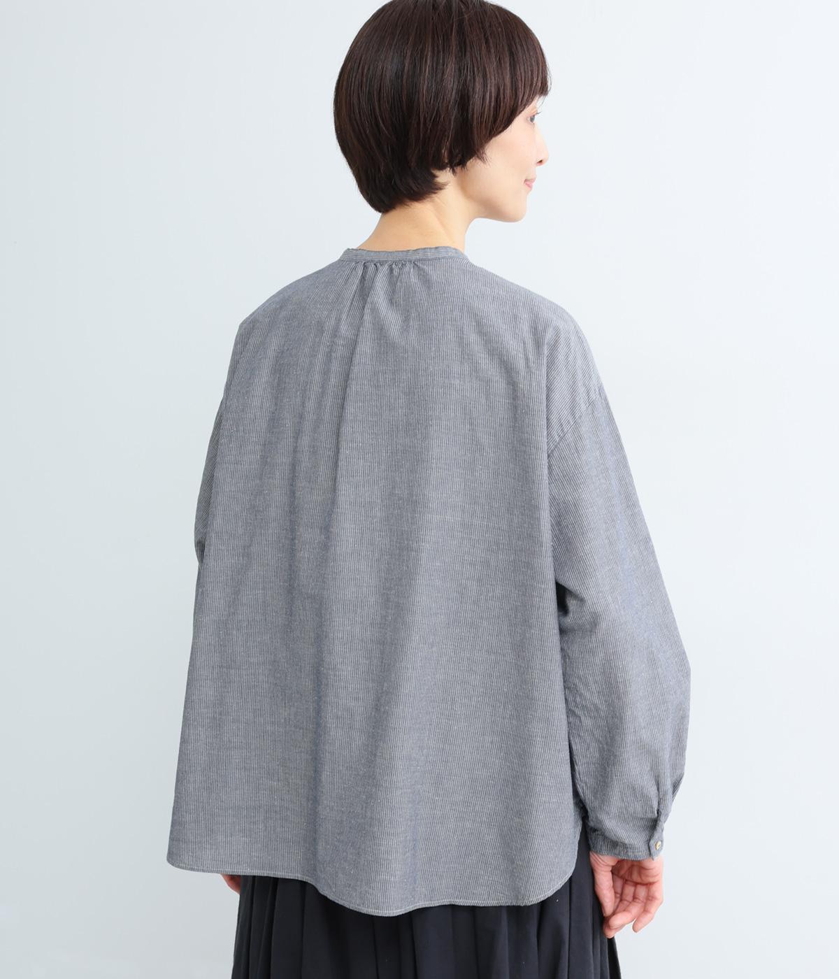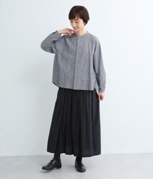 細やかなストライプの縦ラインに、やわらかなラインの刺しゅうを重ねた、表情ゆたかな一枚です。直線と曲線のコントラストが奥行きを生み、さりげない存在感を放ちます。第一ボタンのみを見せた比翼仕立てで、すっきりとした印象に。ほどよくゆとりのあるシルエットで、軽やかに着こなせるのも◎