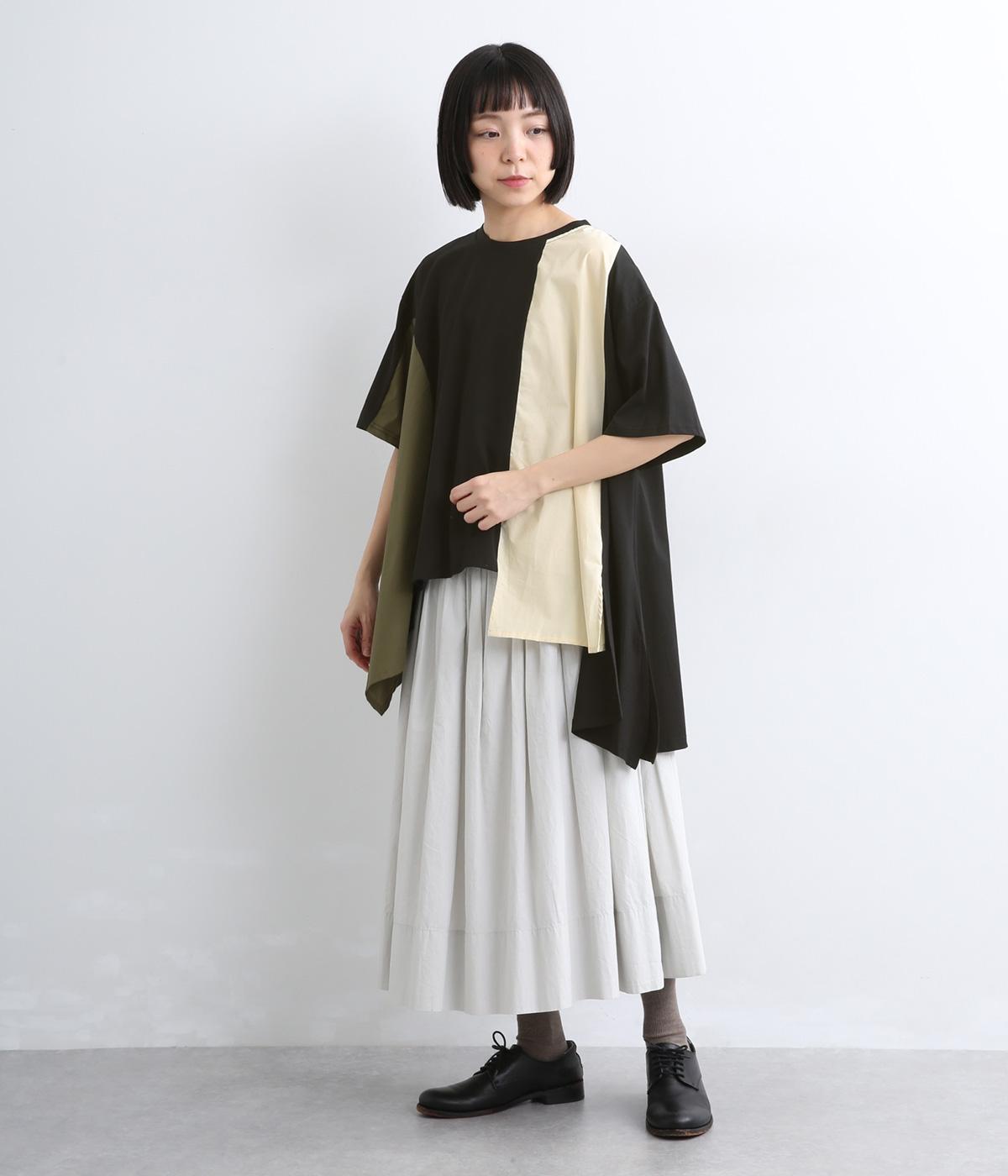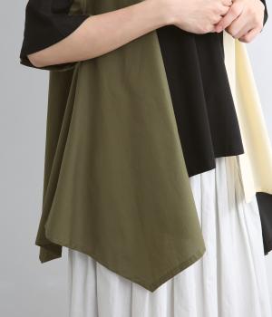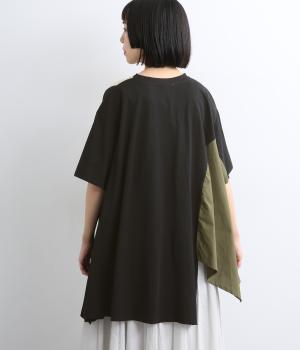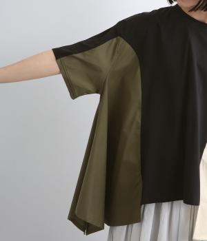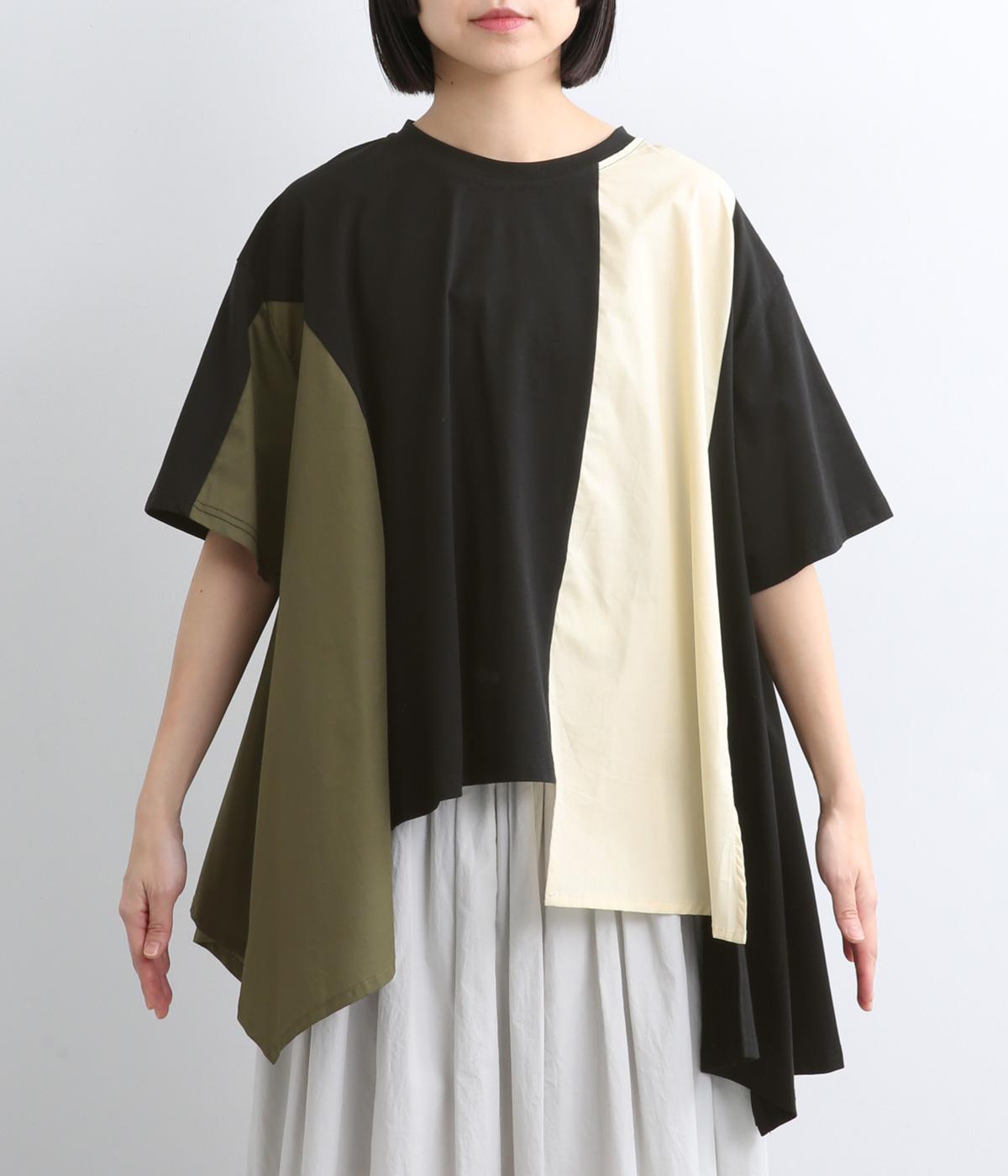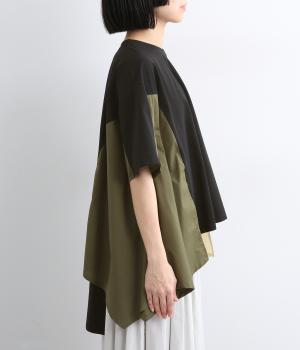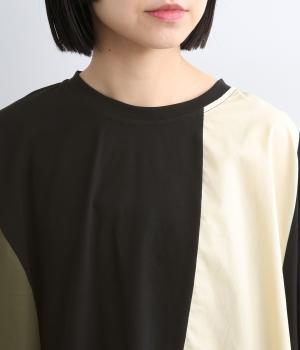 色の異なる異素材をアシンメトリーに組み合わせたデザイン性の高いプルオーバーです。動きに合わせて揺れる立体的なシルエットが華やかさを添えます。向きによってさまざまな表情を見せる着映えトップスです。