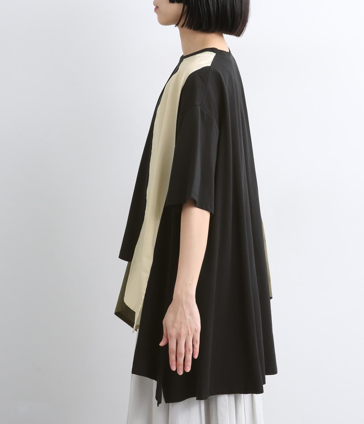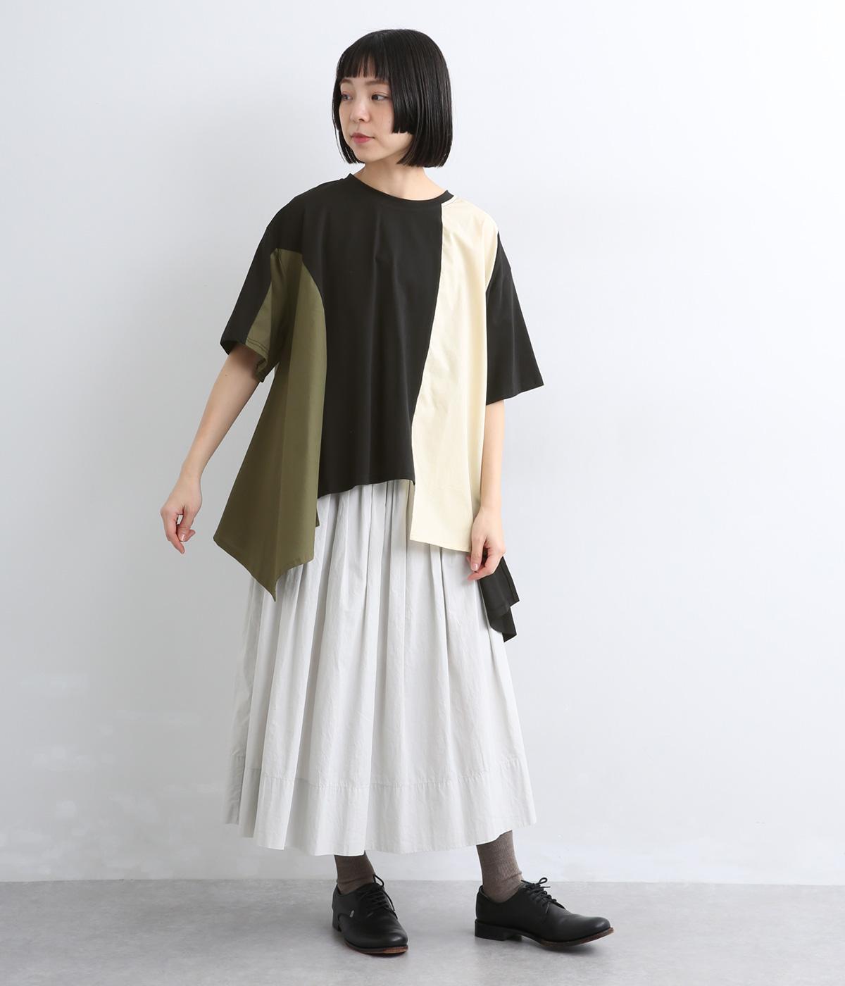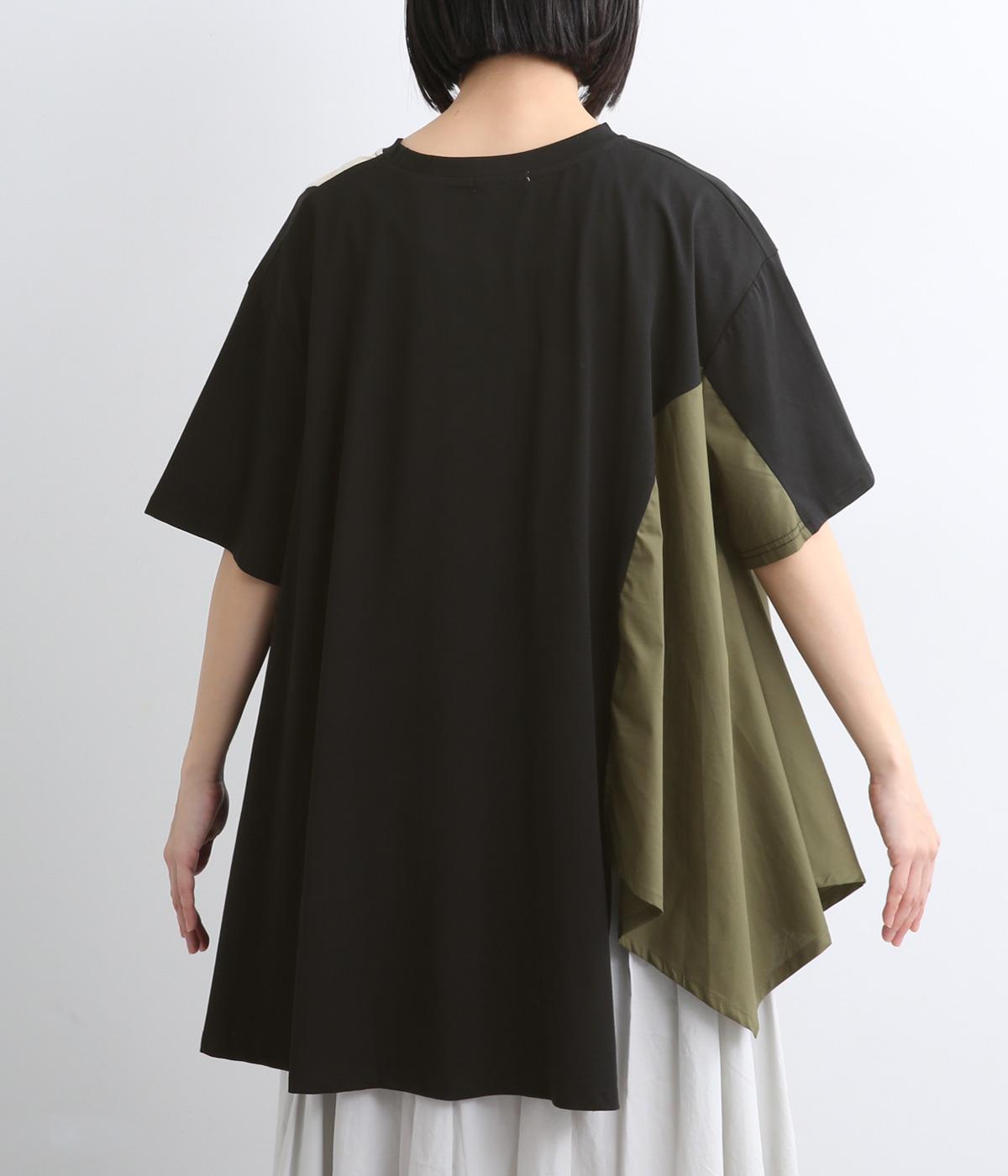 色の異なる異素材をアシンメトリーに組み合わせたデザイン性の高いプルオーバーです。動きに合わせて揺れる立体的なシルエットが華やかさを添えます。向きによってさまざまな表情を見せる着映えトップスです。
