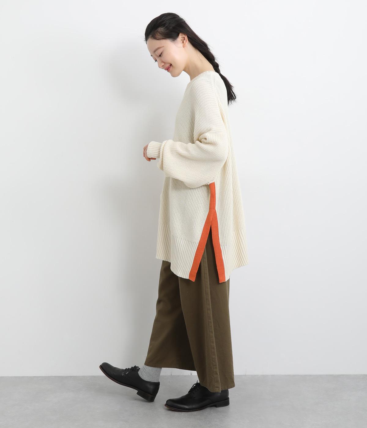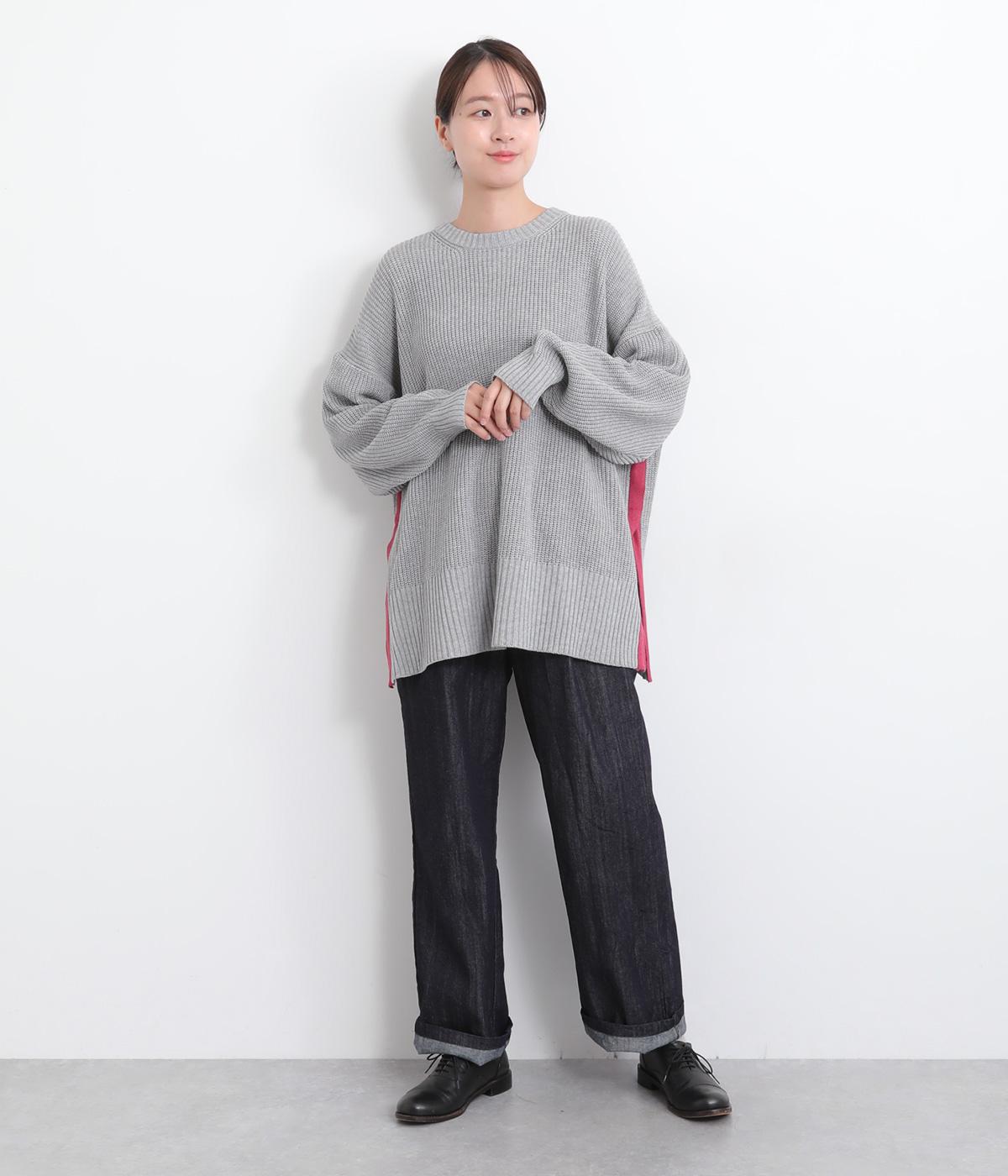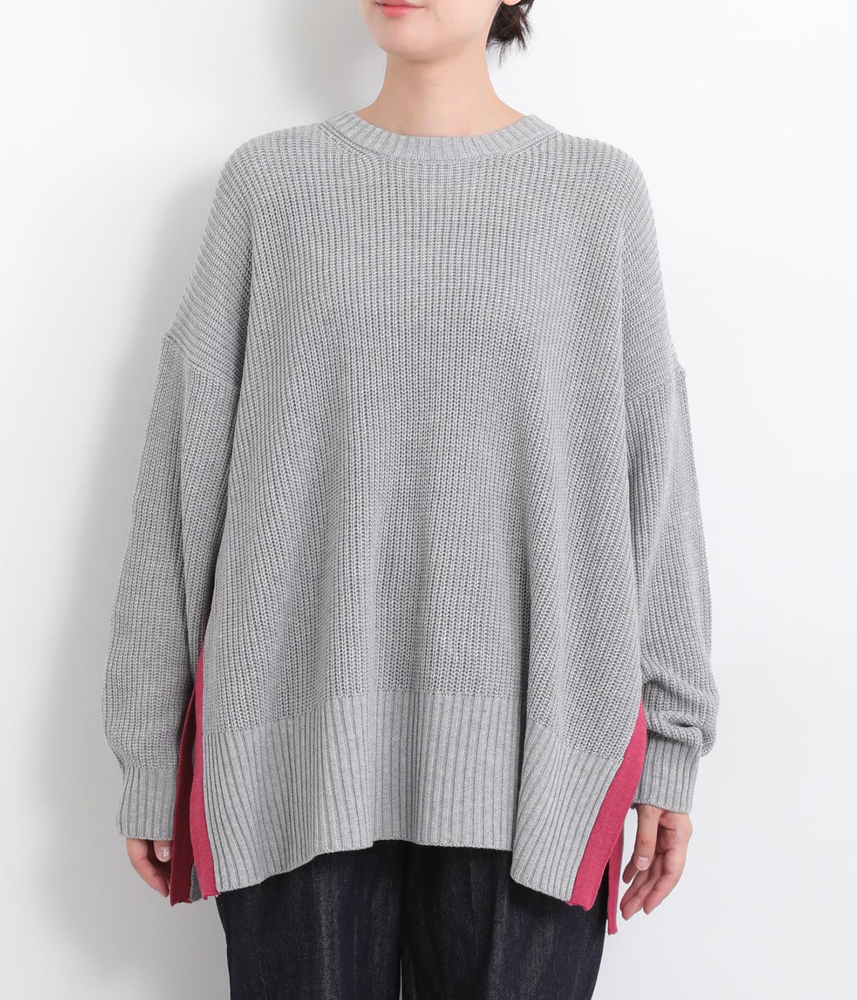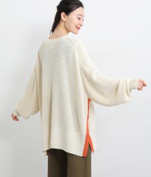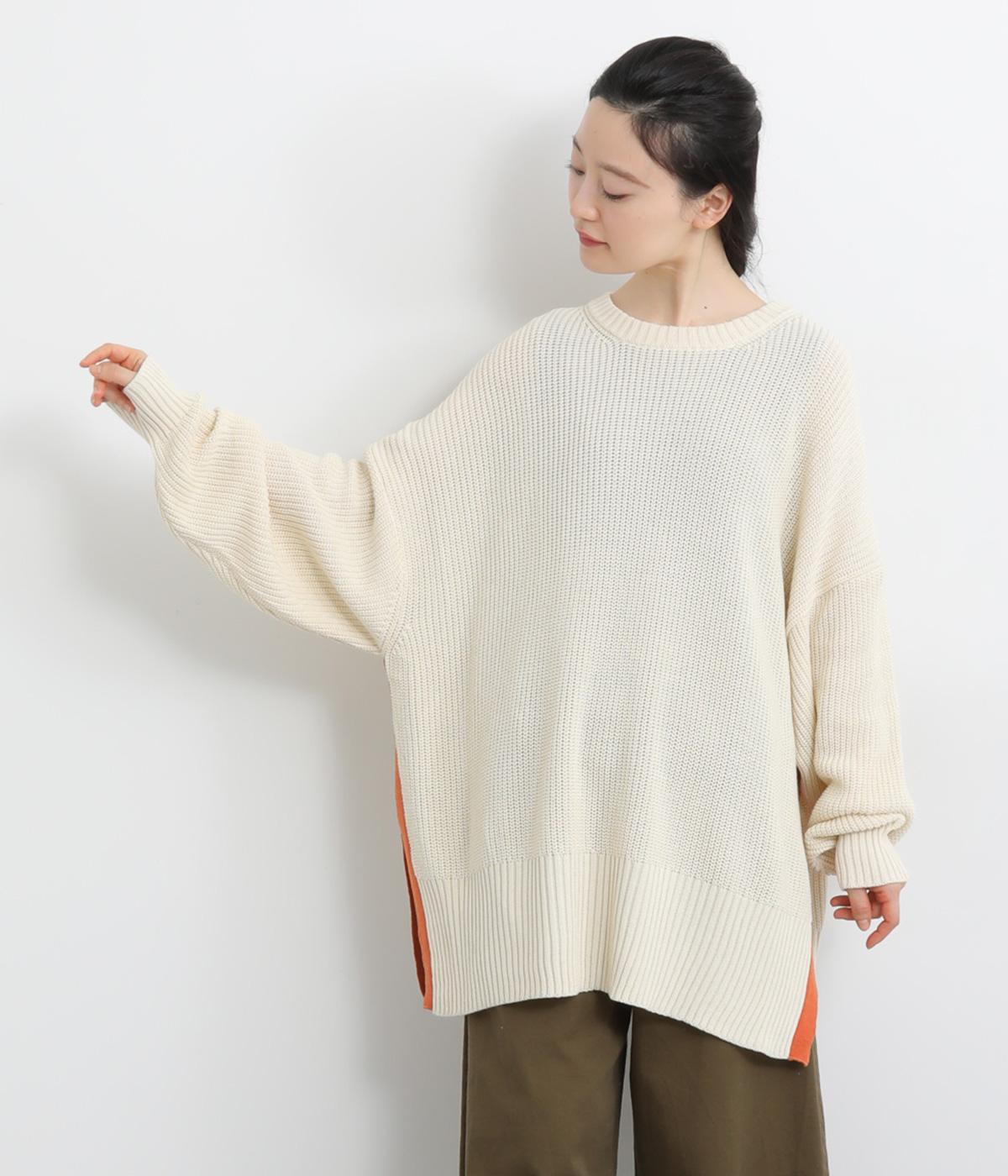 ゆったりとしたオーバーサイズのプルオーバーは、一見シンプルながらサイドの配色ロングスリットがアクセントになっています。リラックスムードな作りでボリュームボトムとも相性が良く、柄アイテム合わせもおすすめ。