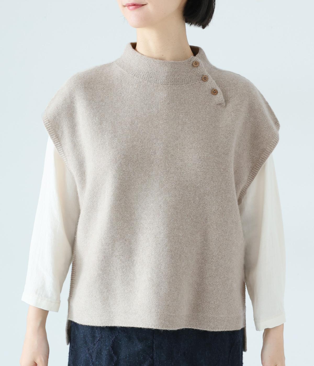 立体感のある滑らかなフォルムを表現したホールガーメントのニットベスト。肩先を覆うゆとりのある身幅が体のラインをカバーしてくれます。低めに立ち上げた上品なネックと、左サイドの3つのボタンがアクセントに。全体のバランスをすっきりと見せる、コンパクトな着丈設定もポイントです。