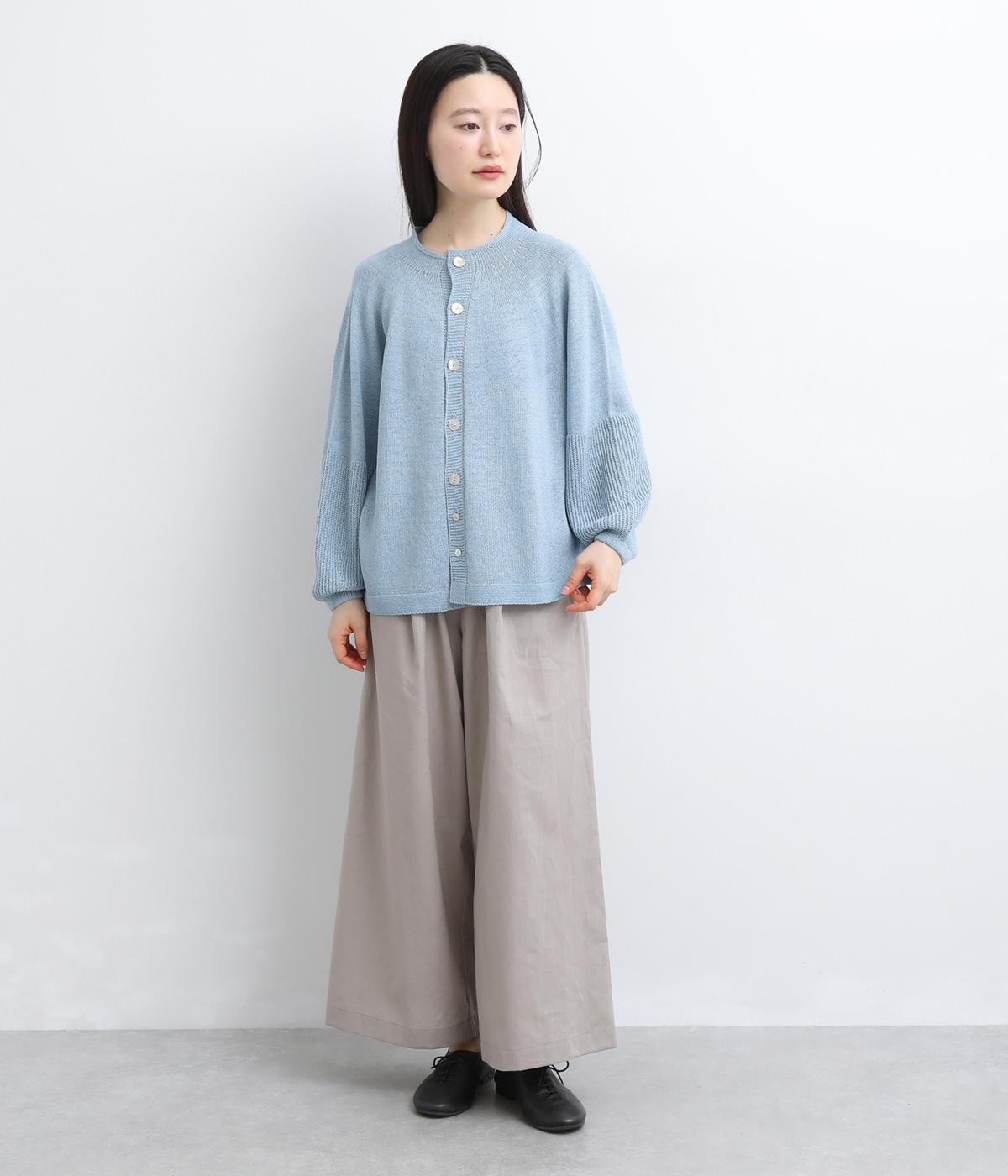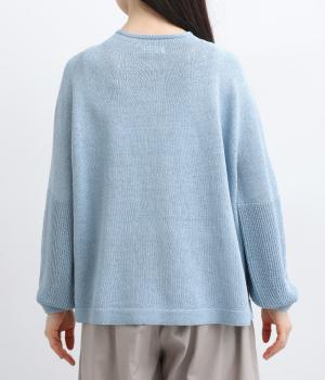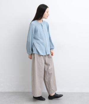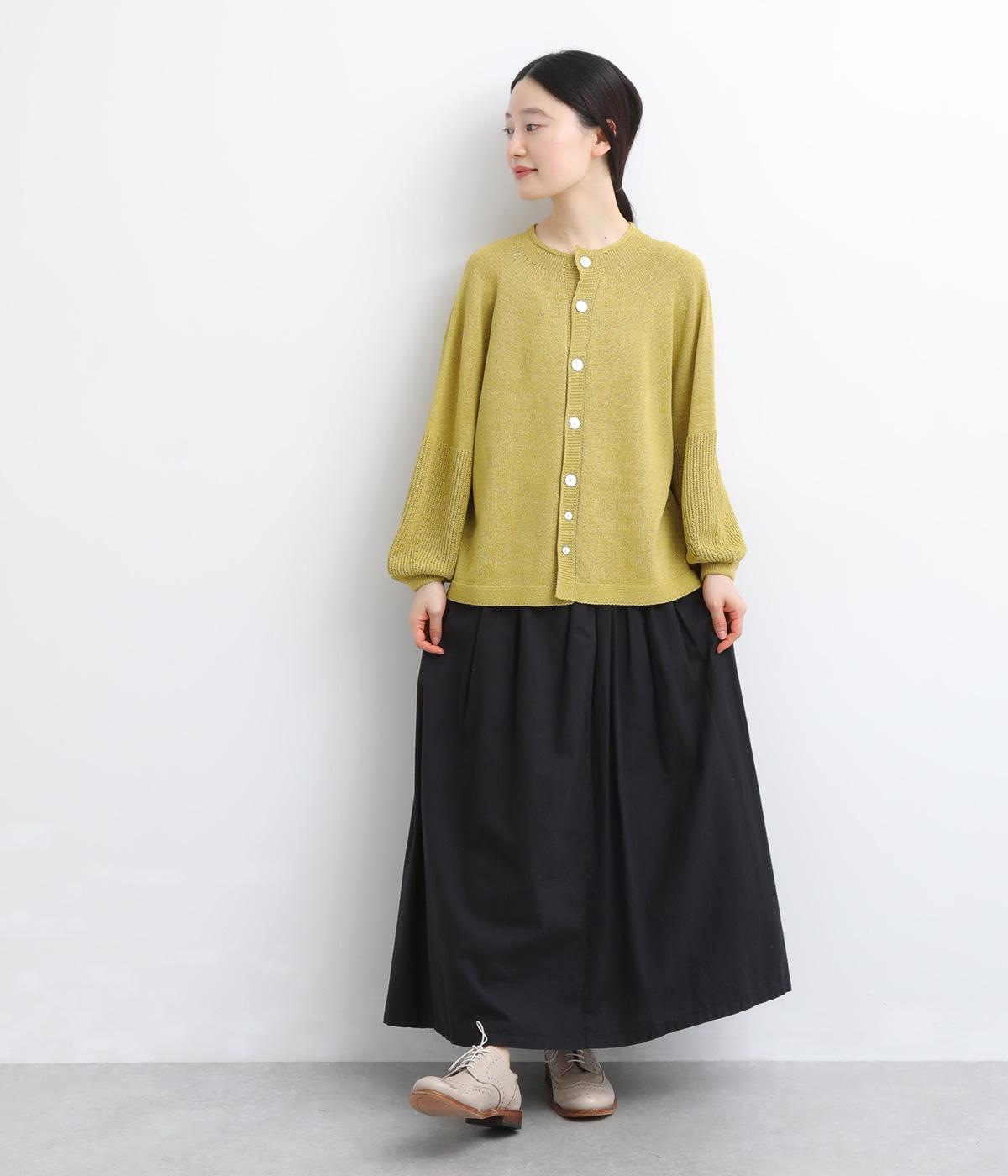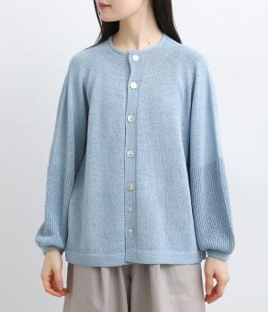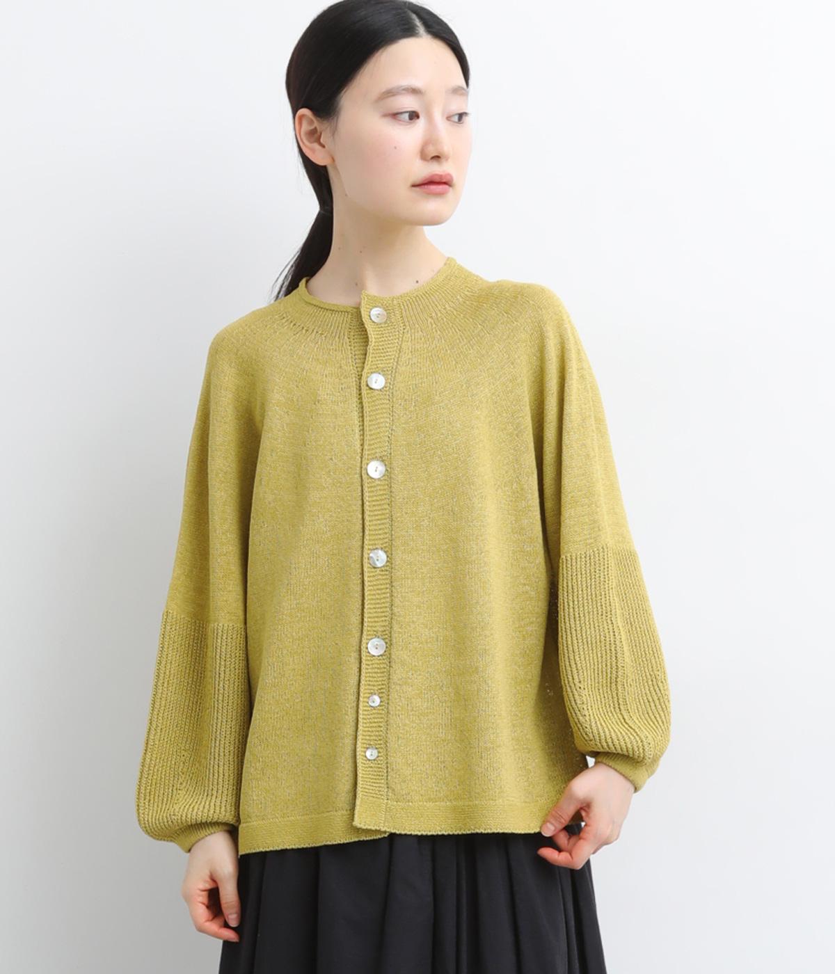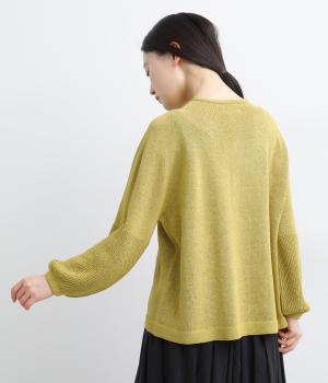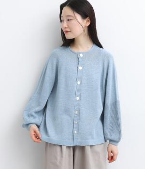 縫い目をおさえたホールガーメントで編みならではの、やわらかな落ち感が魅力です。袖部分はリブ調の編み地に切り替え、ふんわりと丸みのあるバルーンシルエットに。フロントボタンは下側のみサイズに変化をつけ、さりげないアクセントを添えています。カジュアルにもきれいめにも合わせやすい一着です。