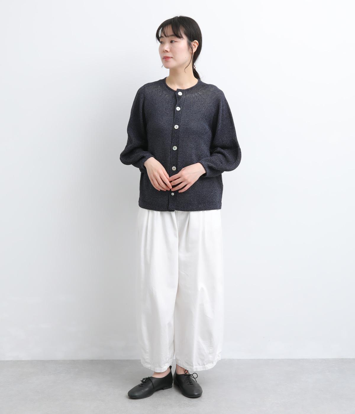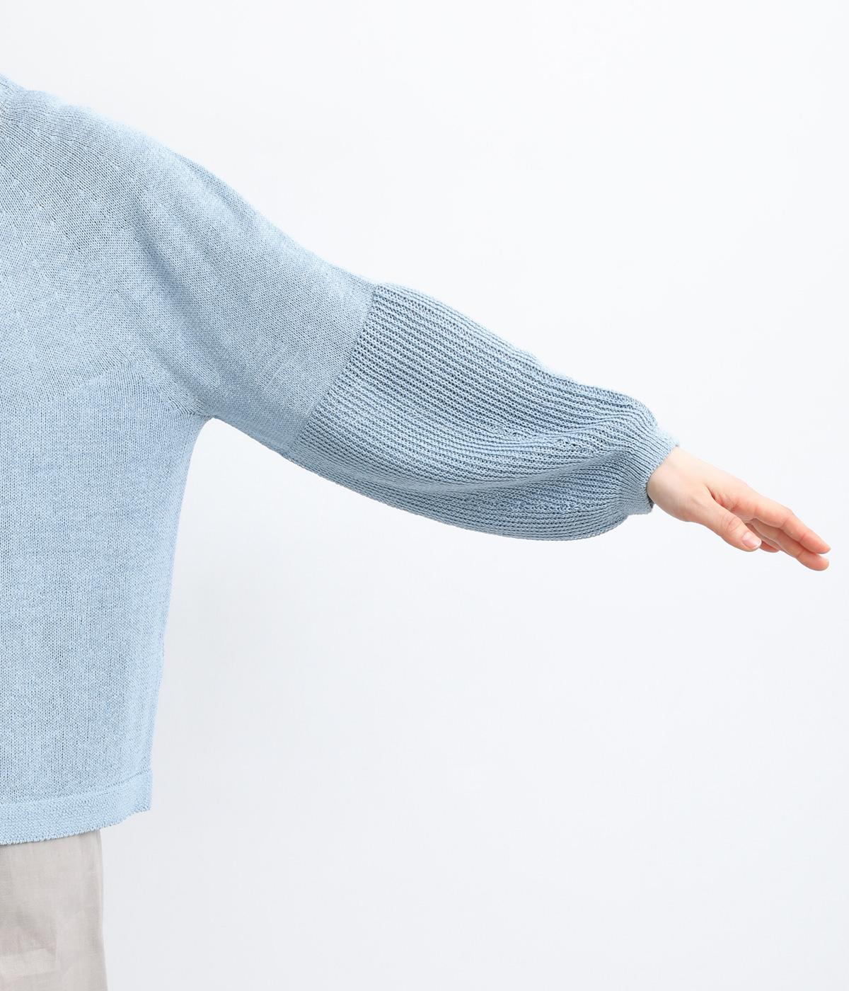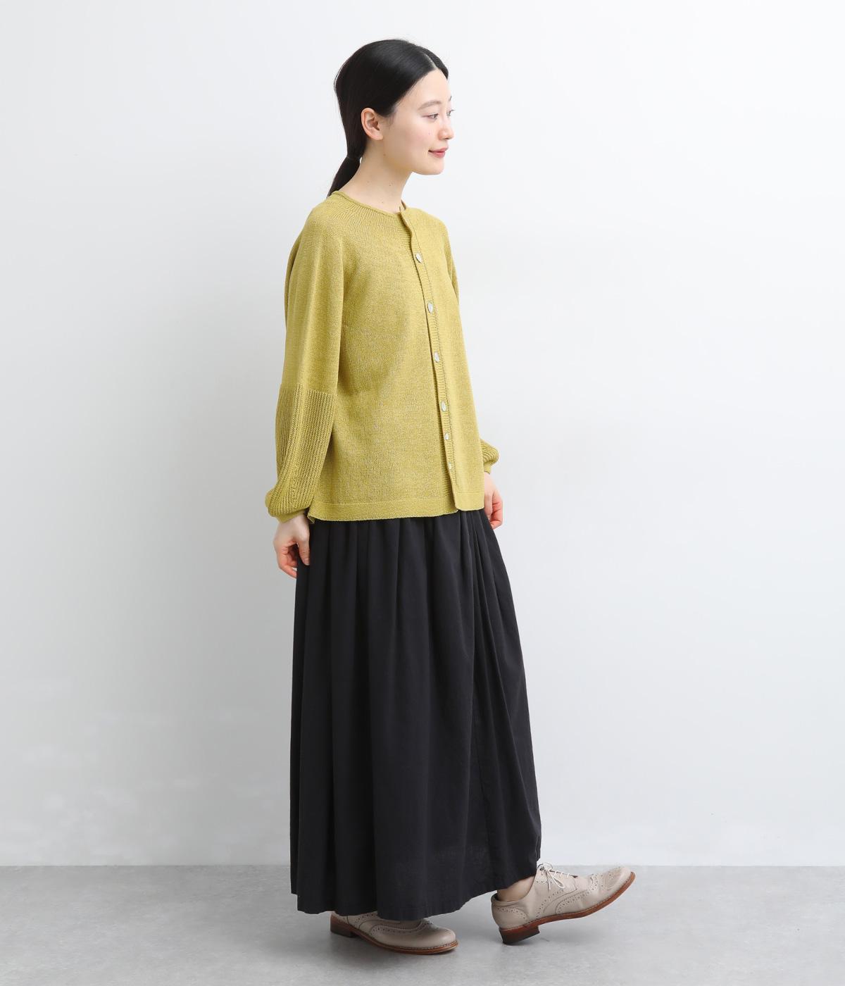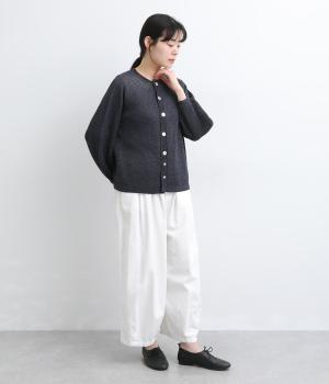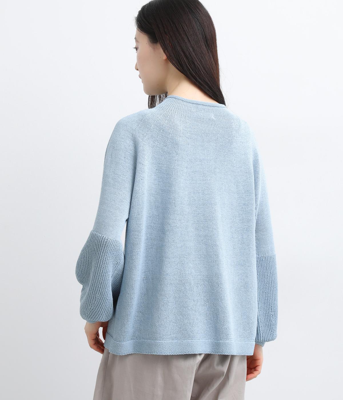 縫い目をおさえたホールガーメントで編みならではの、やわらかな落ち感が魅力です。袖部分はリブ調の編み地に切り替え、ふんわりと丸みのあるバルーンシルエットに。フロントボタンは下側のみサイズに変化をつけ、さりげないアクセントを添えています。カジュアルにもきれいめにも合わせやすい一着です。