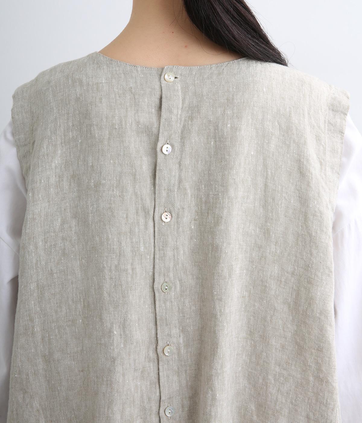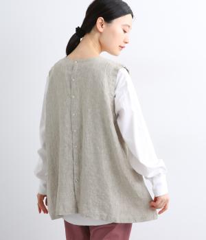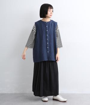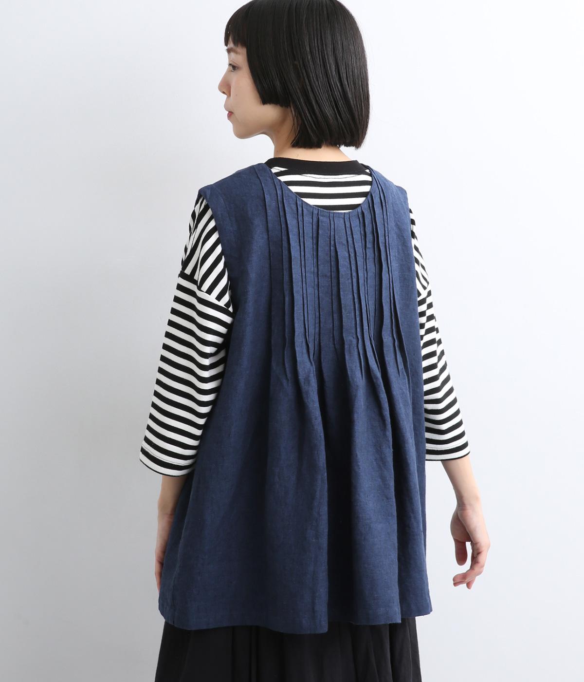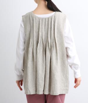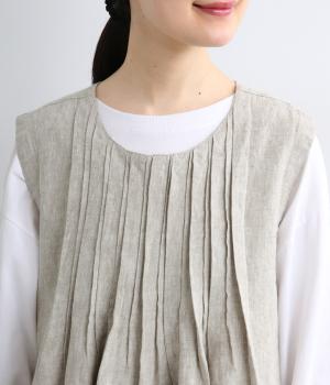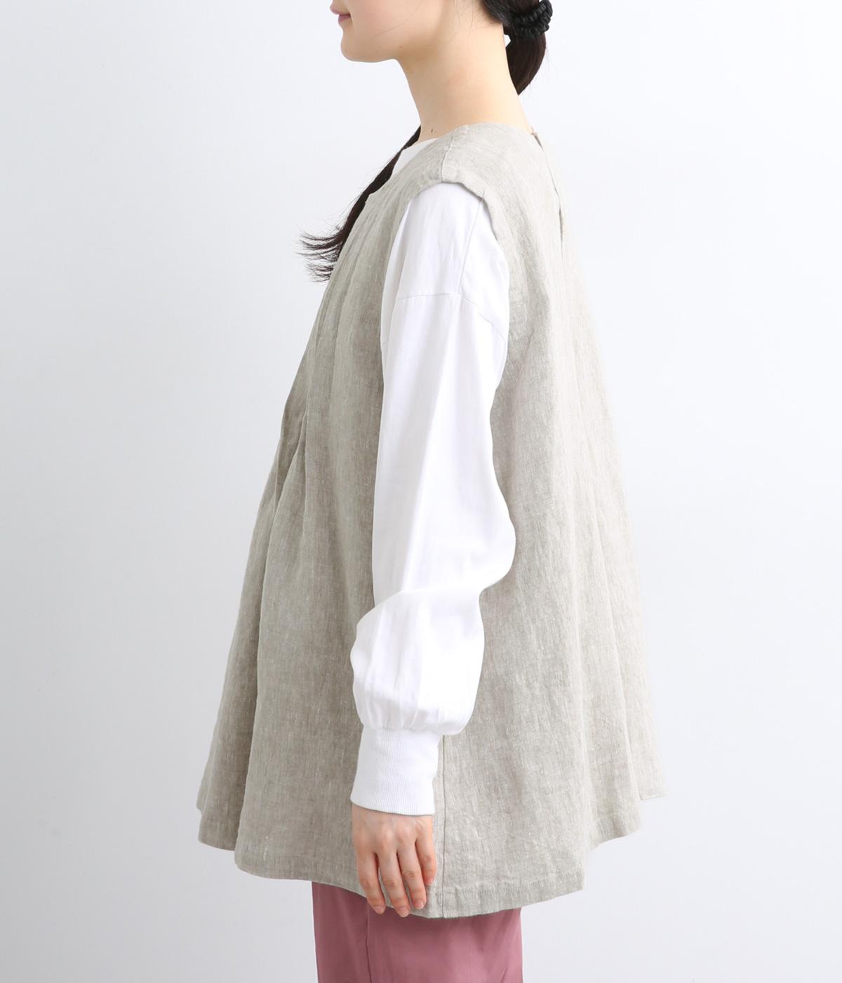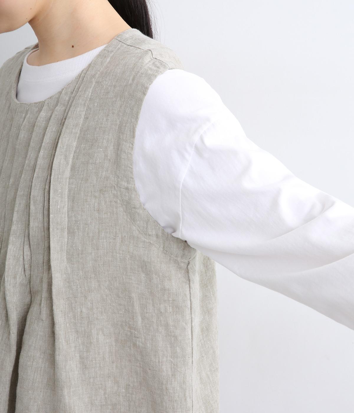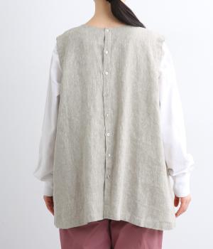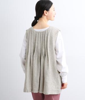 ナチュラルな表情の生地で前後で着用できる2wayのベストを仕立てました。前開きはストンとシンプルに、クルーネックはピンタックをほどこしたふんわりシルエットに。さっと羽織るだけで、こなれた印象を添えるアイテムです。
