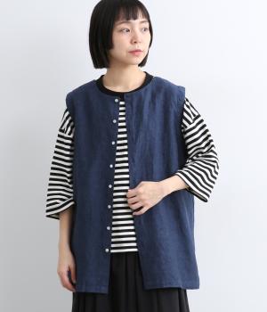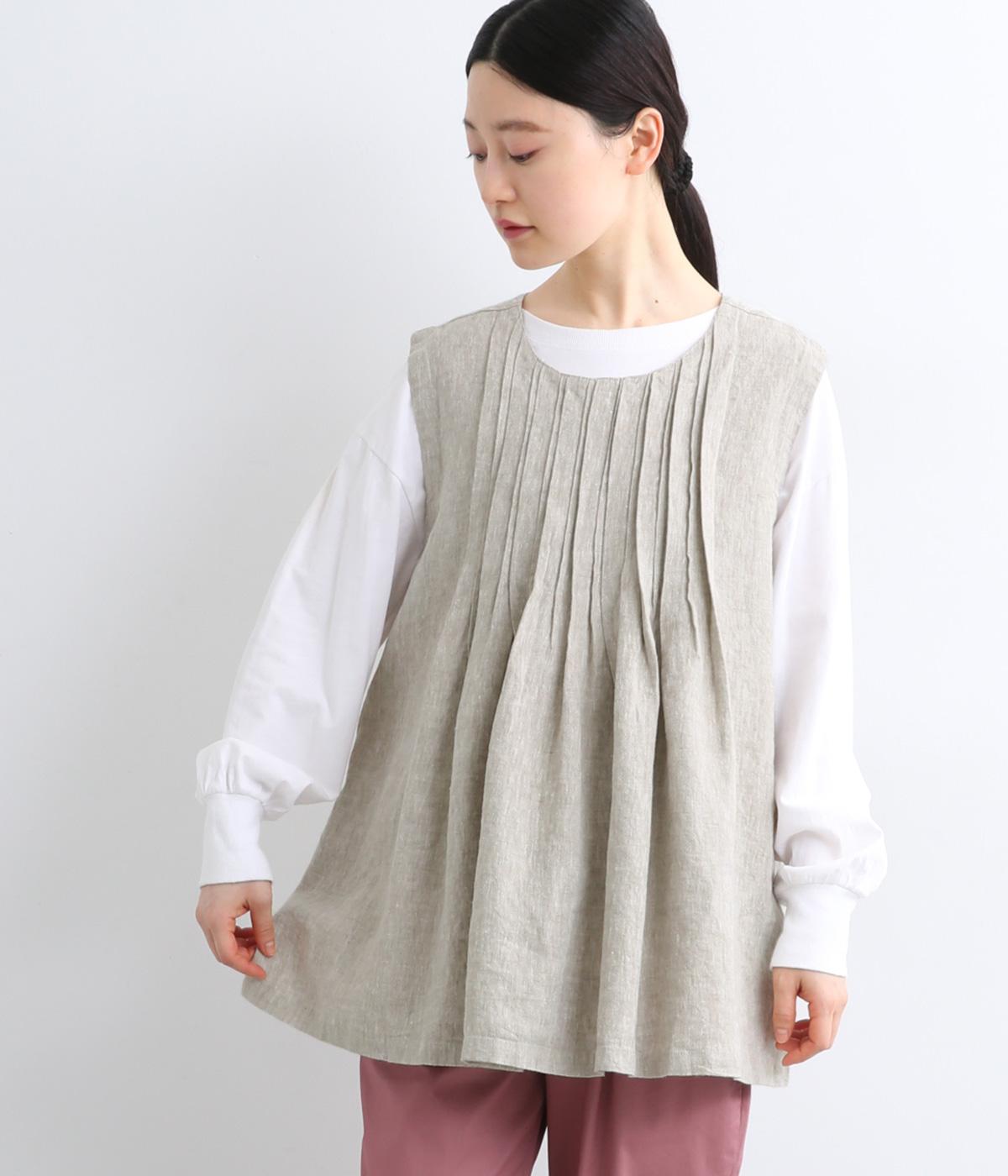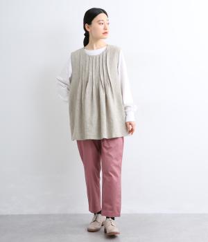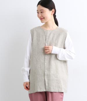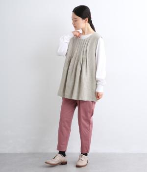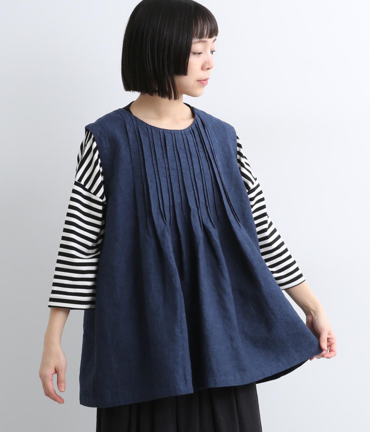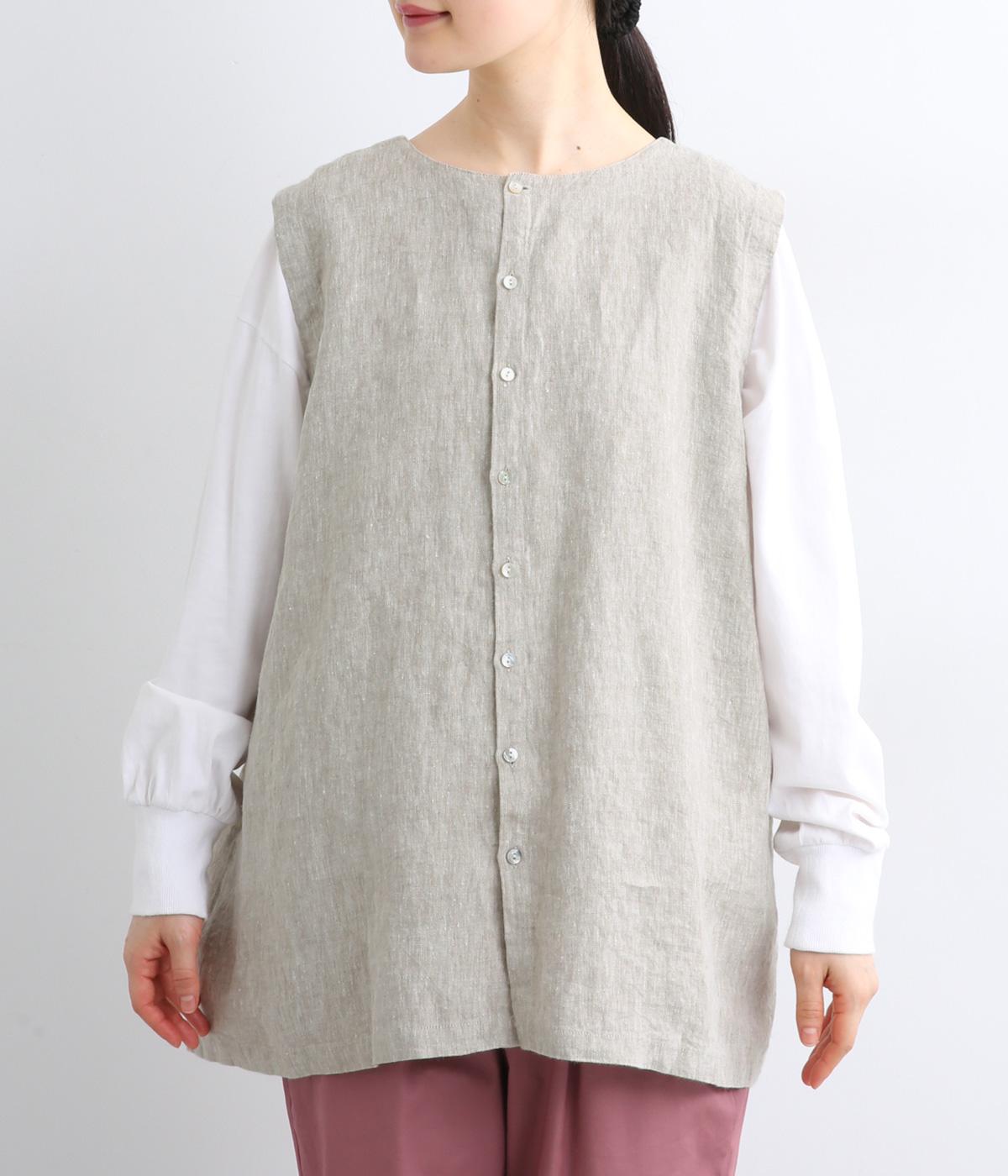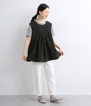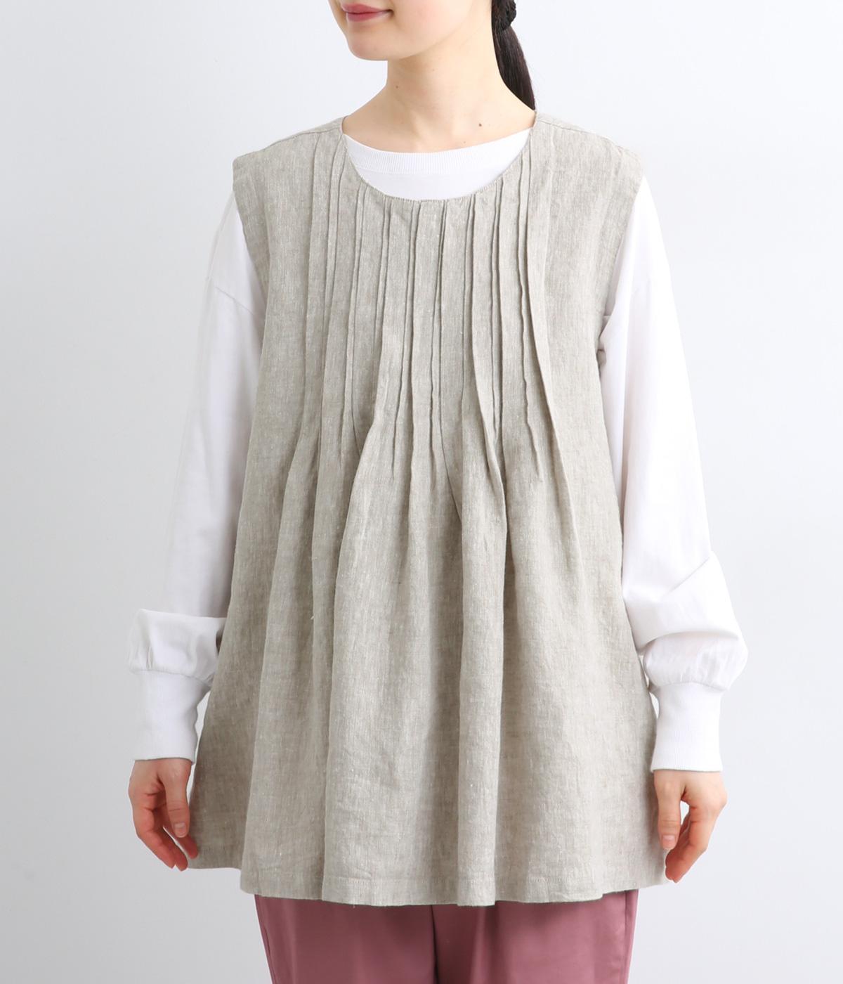 ナチュラルな表情の生地で前後で着用できる2wayのベストを仕立てました。前開きはストンとシンプルに、クルーネックはピンタックをほどこしたふんわりシルエットに。さっと羽織るだけで、こなれた印象を添えるアイテムです。