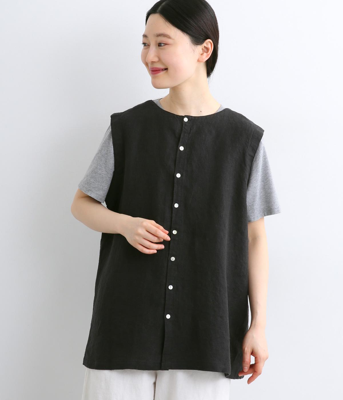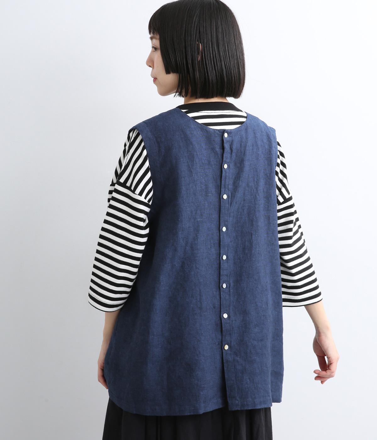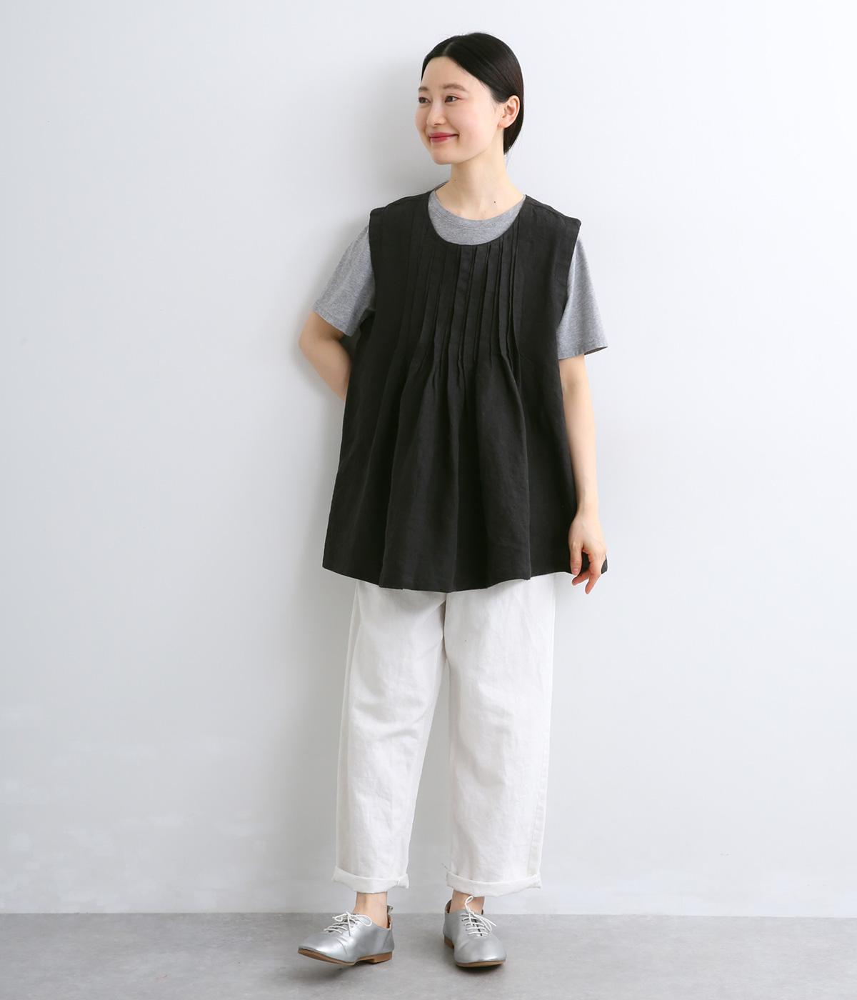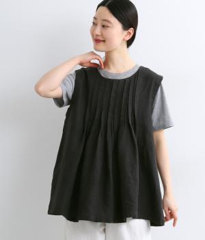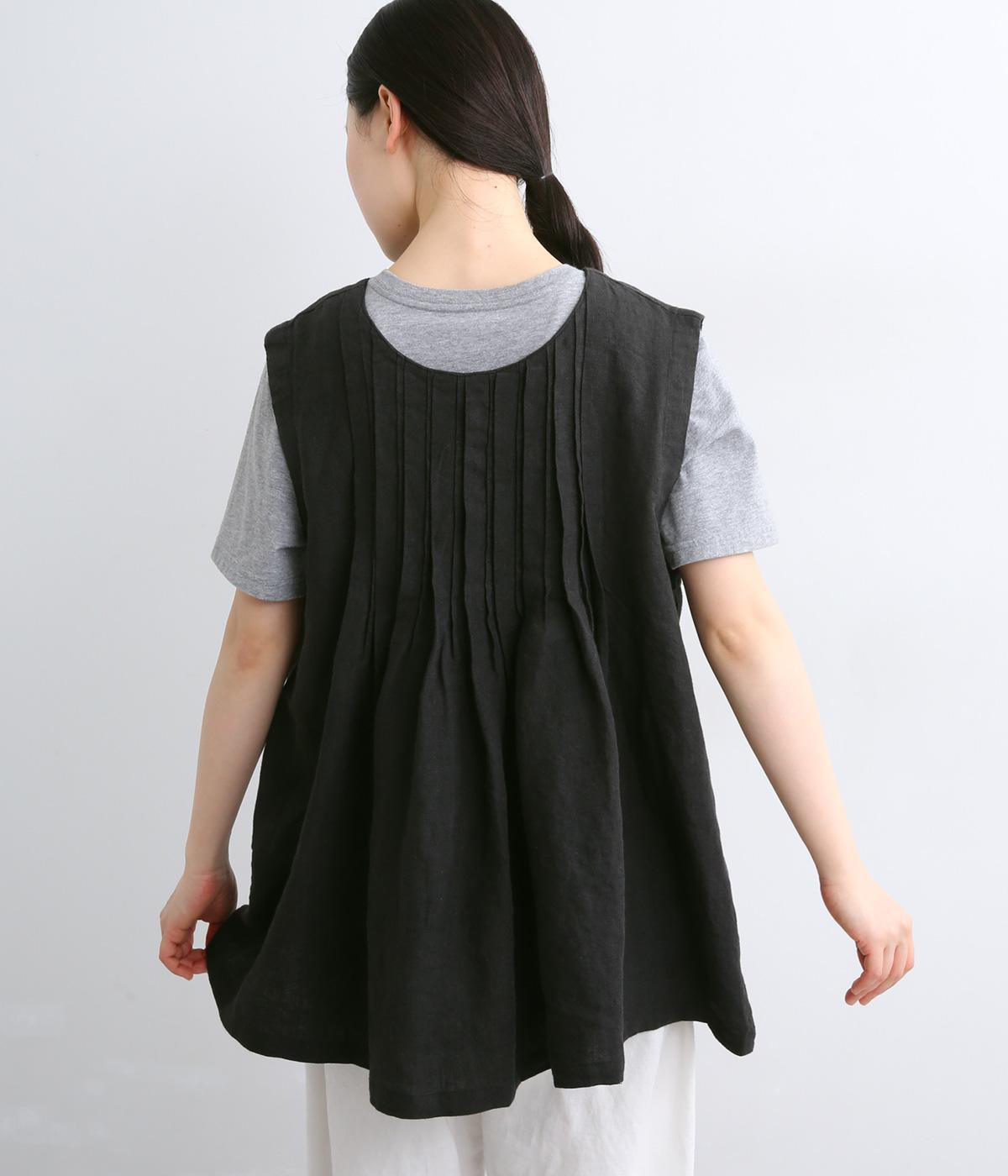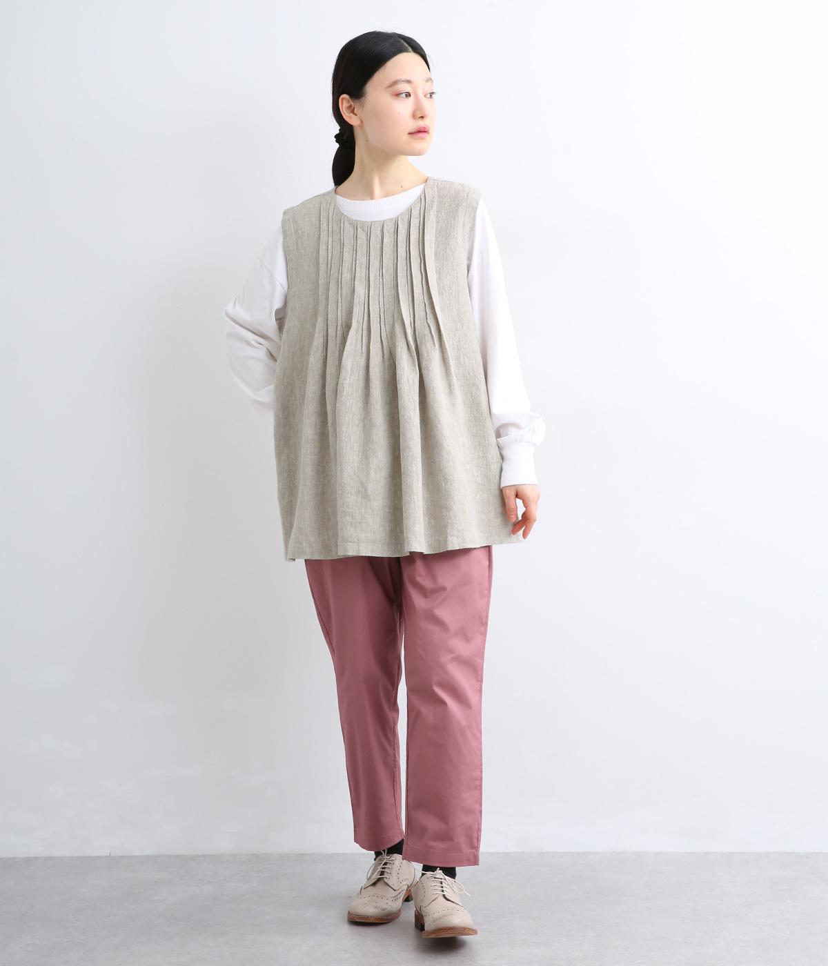 ナチュラルな表情の生地で前後で着用できる2wayのベストを仕立てました。前開きはストンとシンプルに、クルーネックはピンタックをほどこしたふんわりシルエットに。さっと羽織るだけで、こなれた印象を添えるアイテムです。